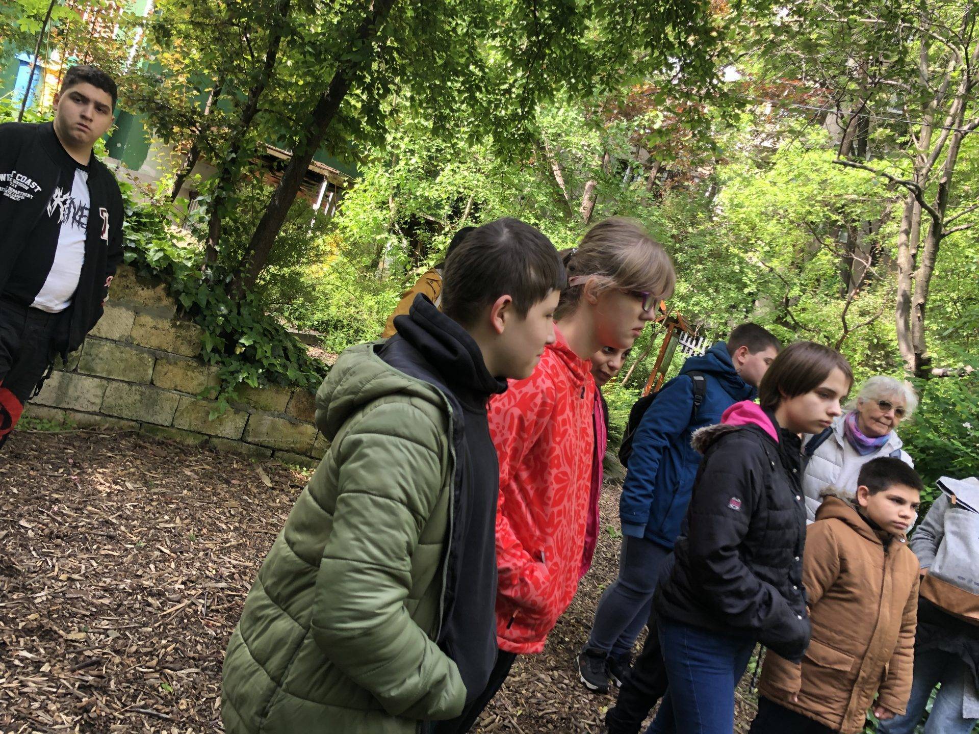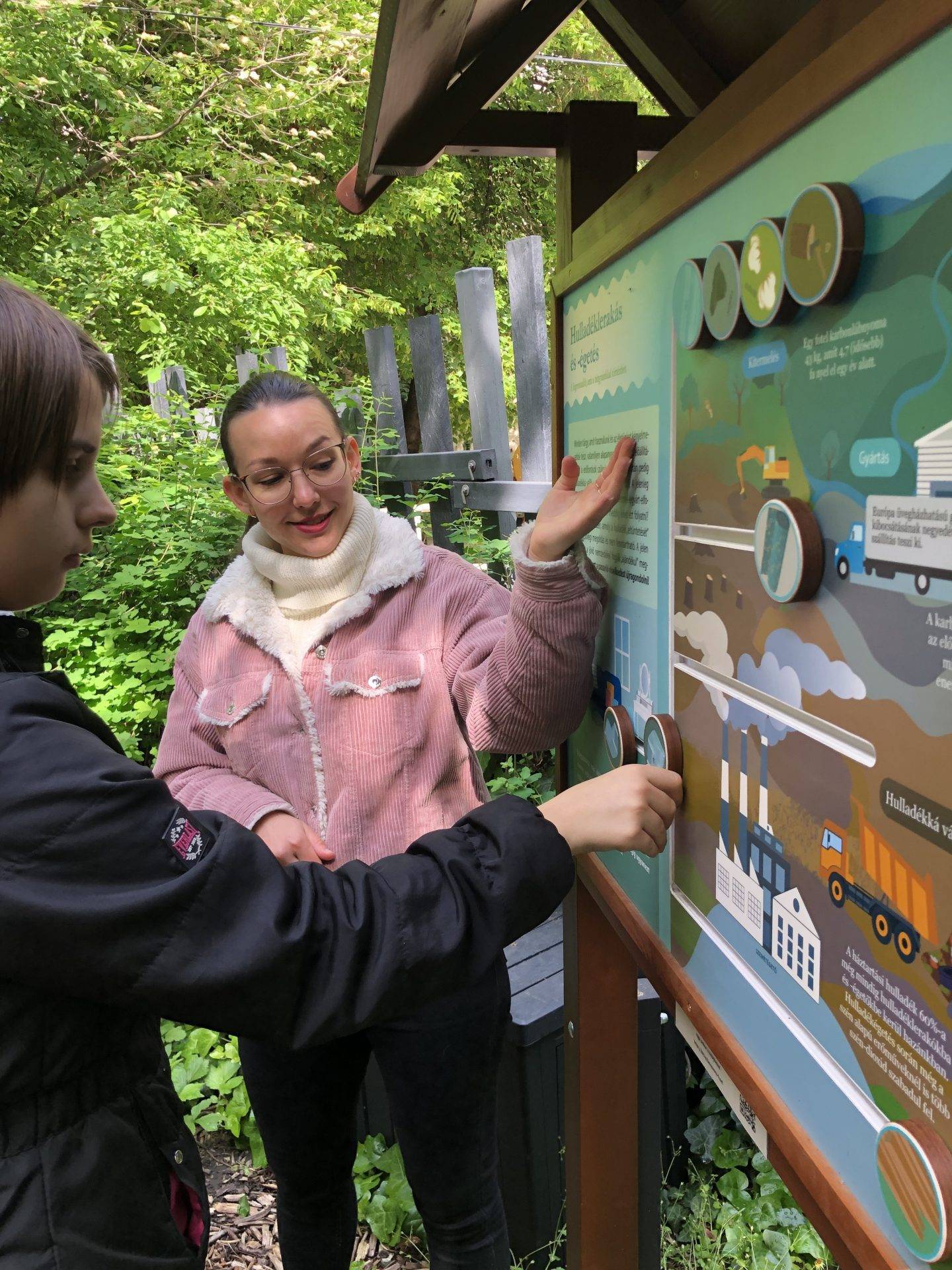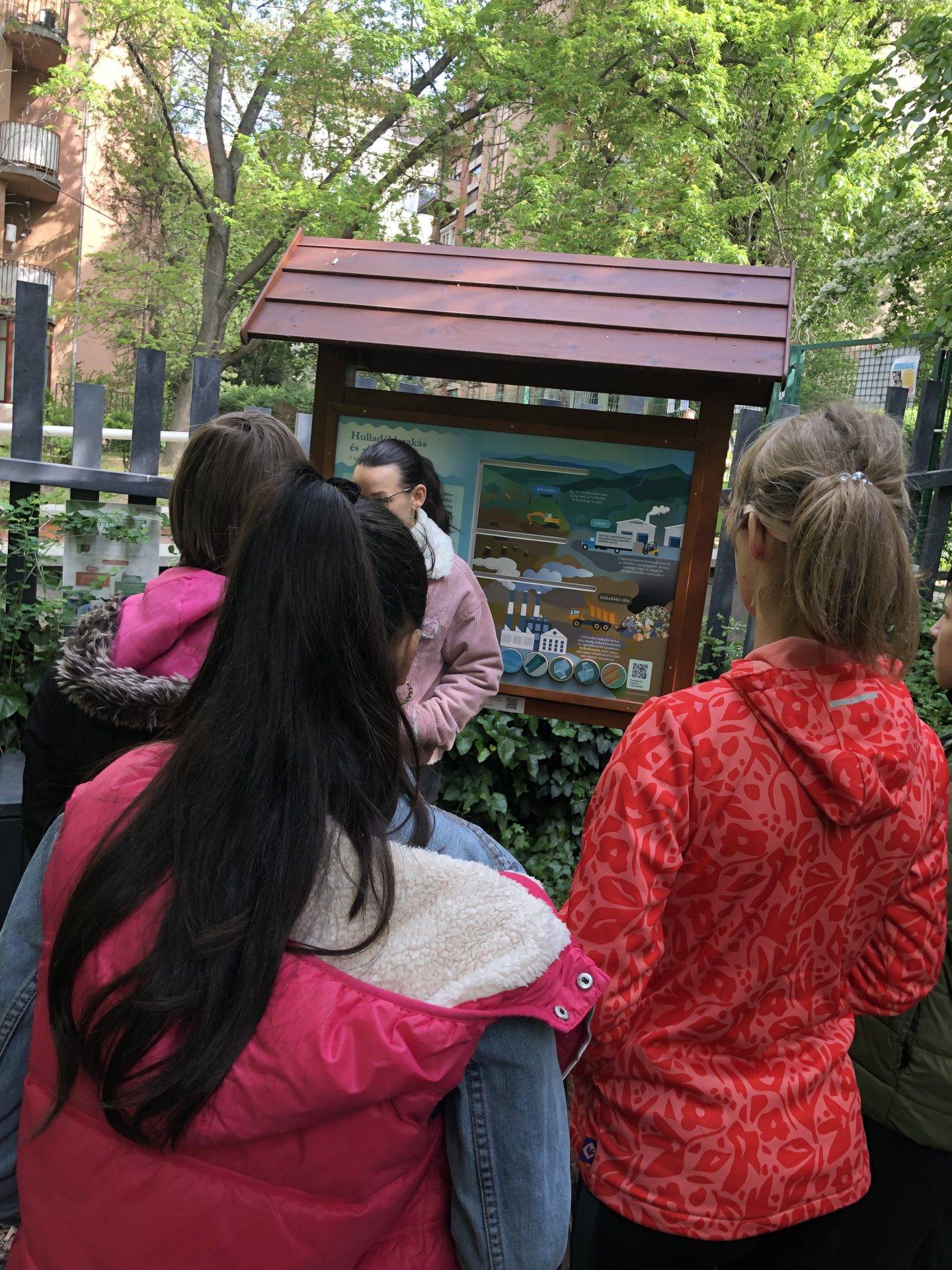 A fenntarthatóság jegyében tartott órát a Humusz-tanösvényen tartottuk meg, ahol nem csak különböző játékok, de személyes megtapasztalás is várta a tanulókat. Ilyen volt például a lakótelep közepén kialakított teljesen zöld és teljesen öko terület, és a komposztálósarok is, ahova a lakótelep lakói a háztartási élelmiszerhulladékaikat hordják. A gyerekek így első kézből tapasztalhatták, hogy is néz ki egy komposztáló, és arról is kaptak választ, hogy melyek azok az élelmiszermaradékok, amelyeket bele lehet tenni.