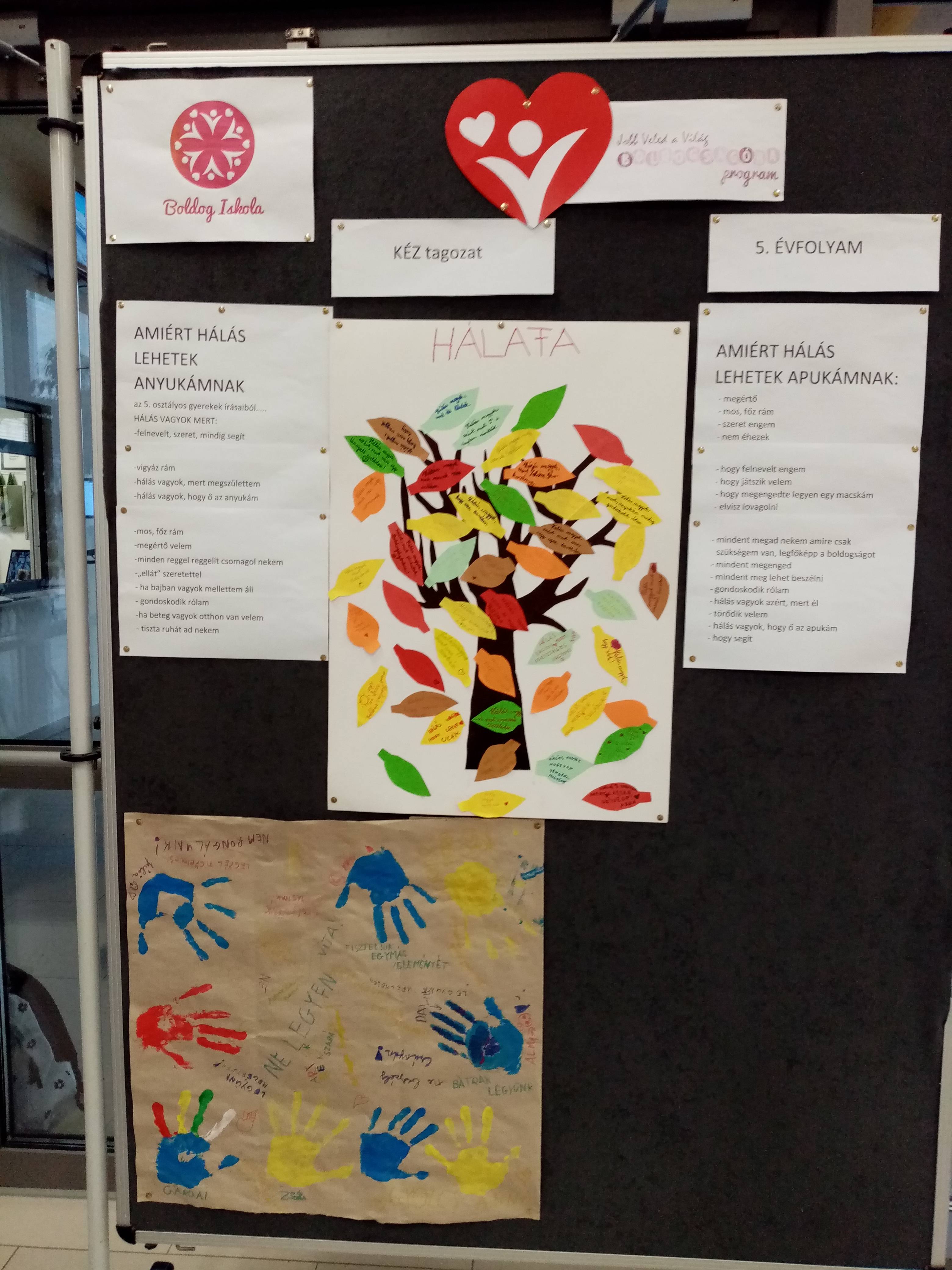 A hónap témája a hála volt. Elkészítették a gyerekek csoportmunkában a hálafájukat, megbeszéltük, összegyűjtöttük azokat a dolgokat, amelyekért a gyerekek hálásak az anyukáknak és apukáknak. Ezeket a gondolatokat megosztottuk a szülőkkel is. Minden gyerek elkészítette a hálanaplóját is, melyet az év során otthon folyamatosan töltöget. Megtanultuk játékos formában a varázsszavakat, a hála kifejezésének különböző módjait. Ezen hónap alatt megismerkedtek az 5. évfolyamos gyerekek. Több osztály gyerekeiből kezdett el kialakulni egy kis csapat. Ismerkedős játékokat iktattam be a program elején a kapcsolatok megerősítése céljából.