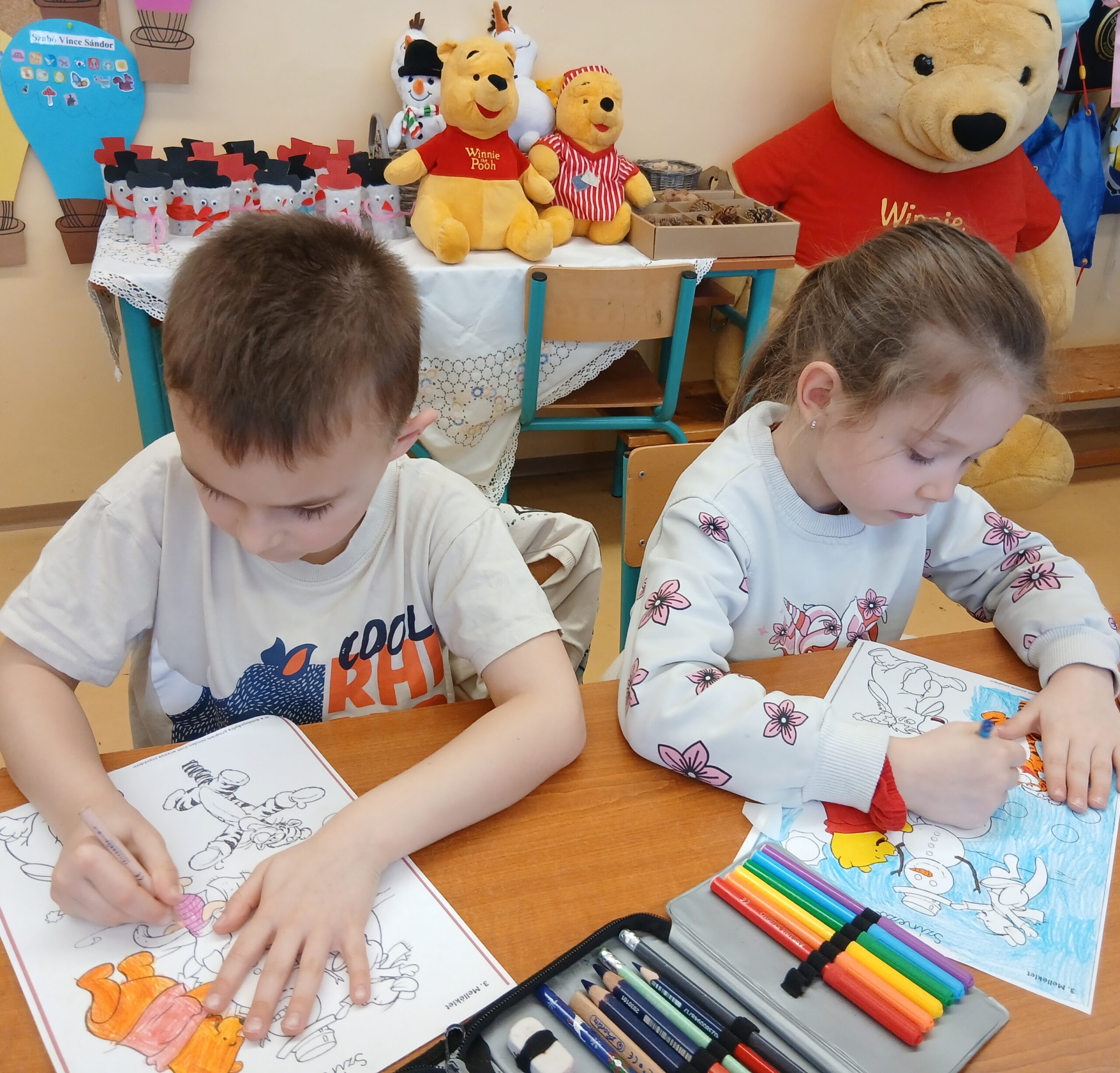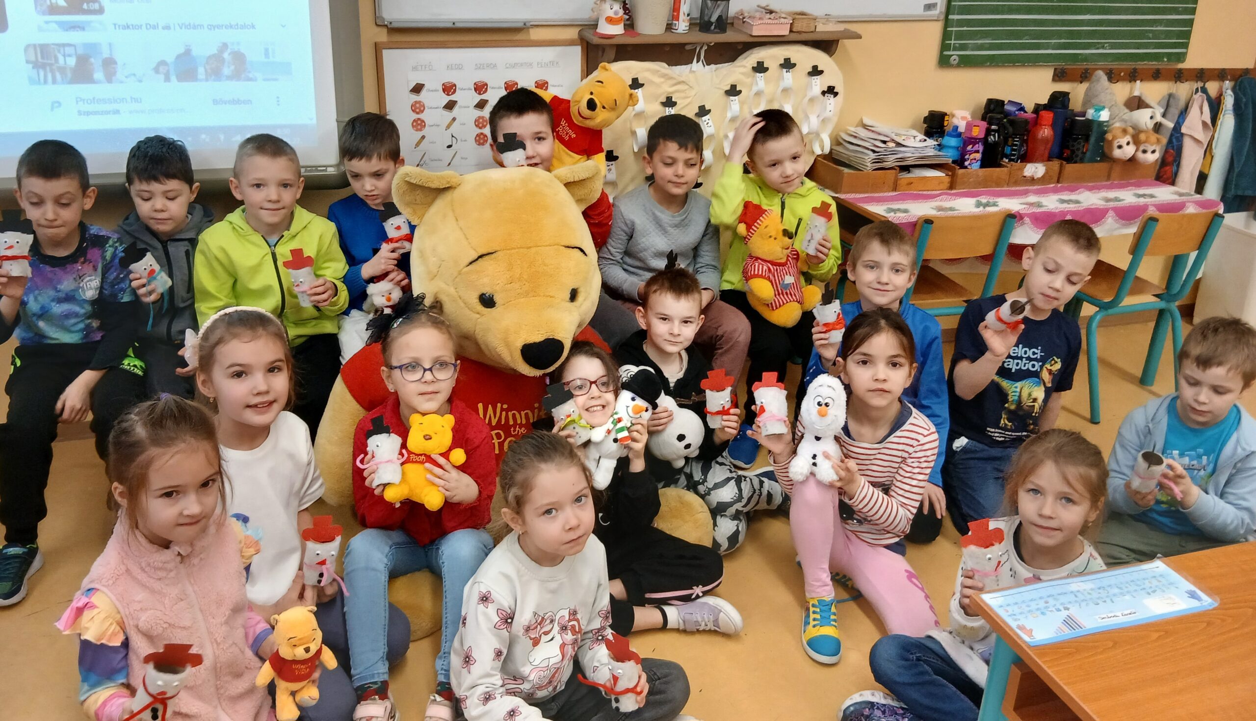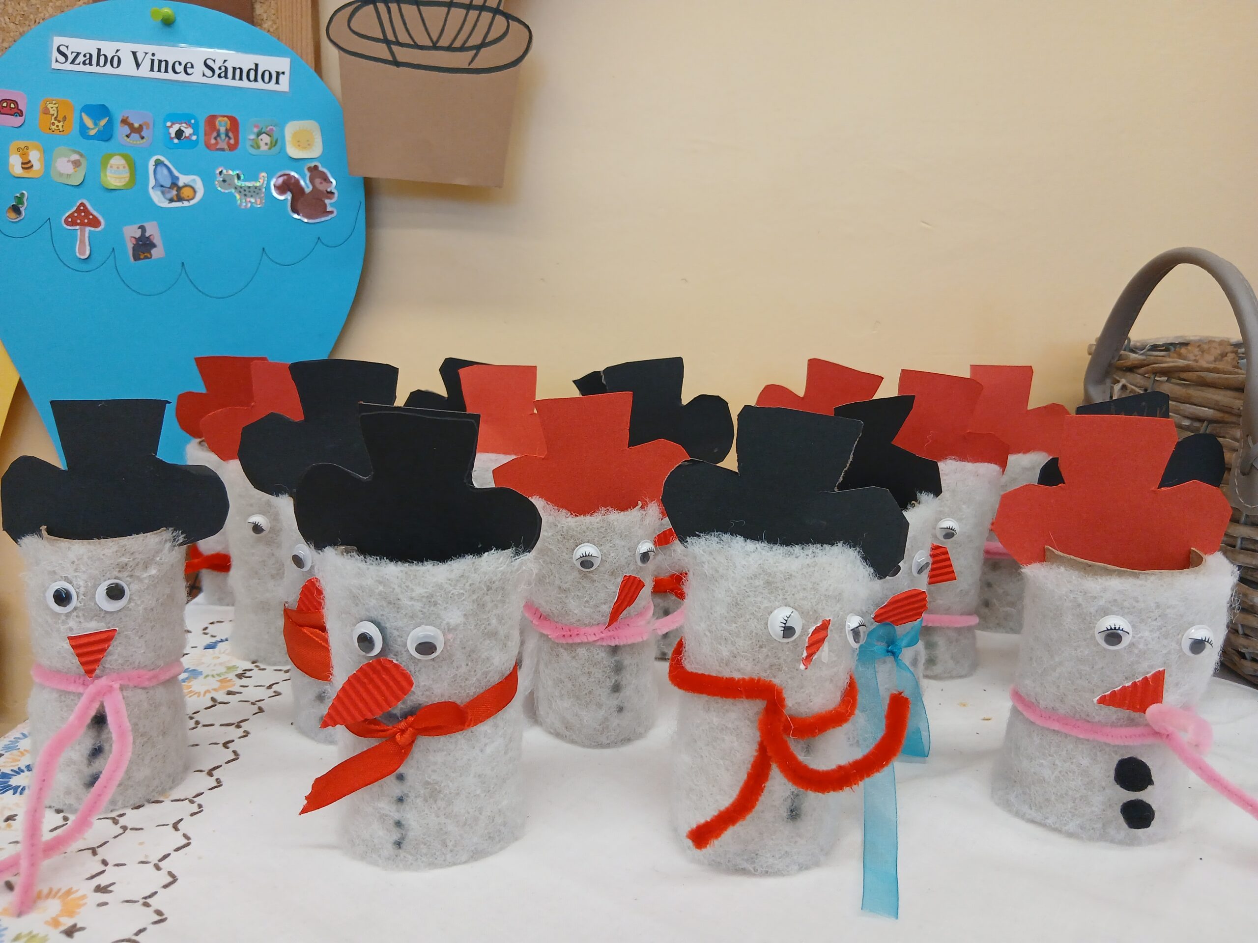 Majd a január 18-ai „Hóemberek világnapja”-hoz kapcsolódva, az öko szemléletet szem előtt tartva, újrahasznosított papírból, szebbnél szebb hóemberek készültek. Mivel ez a nap „Micimackó napja” is, dallal és színezőkkel emlékeztünk meg róla és barátairól.
