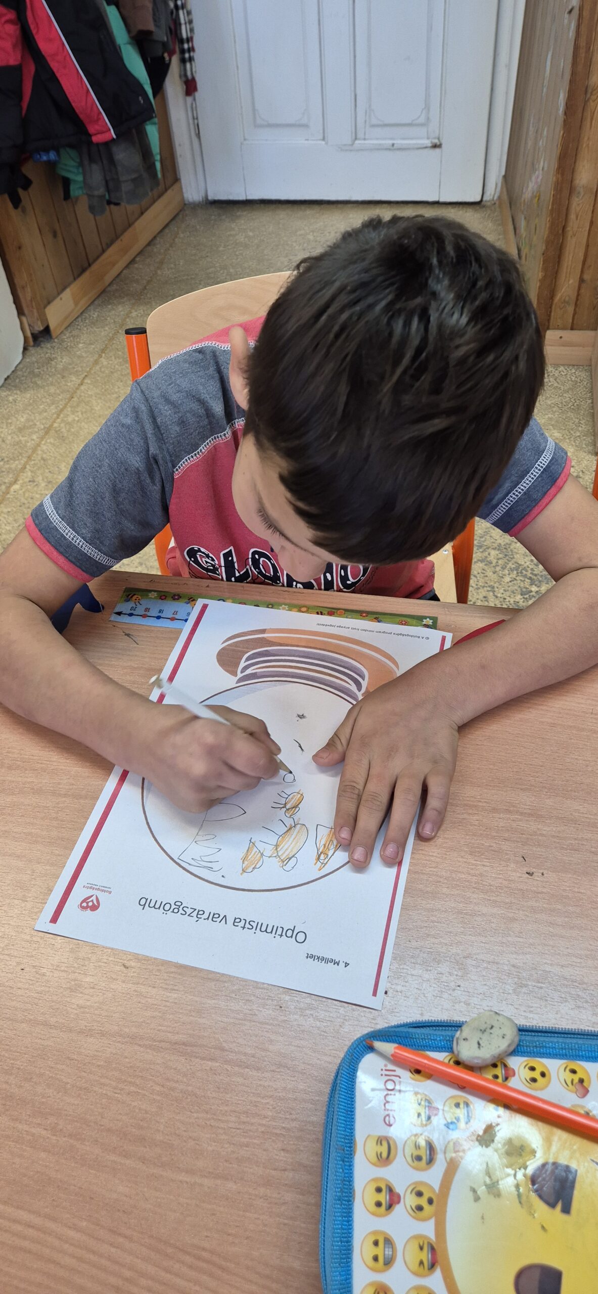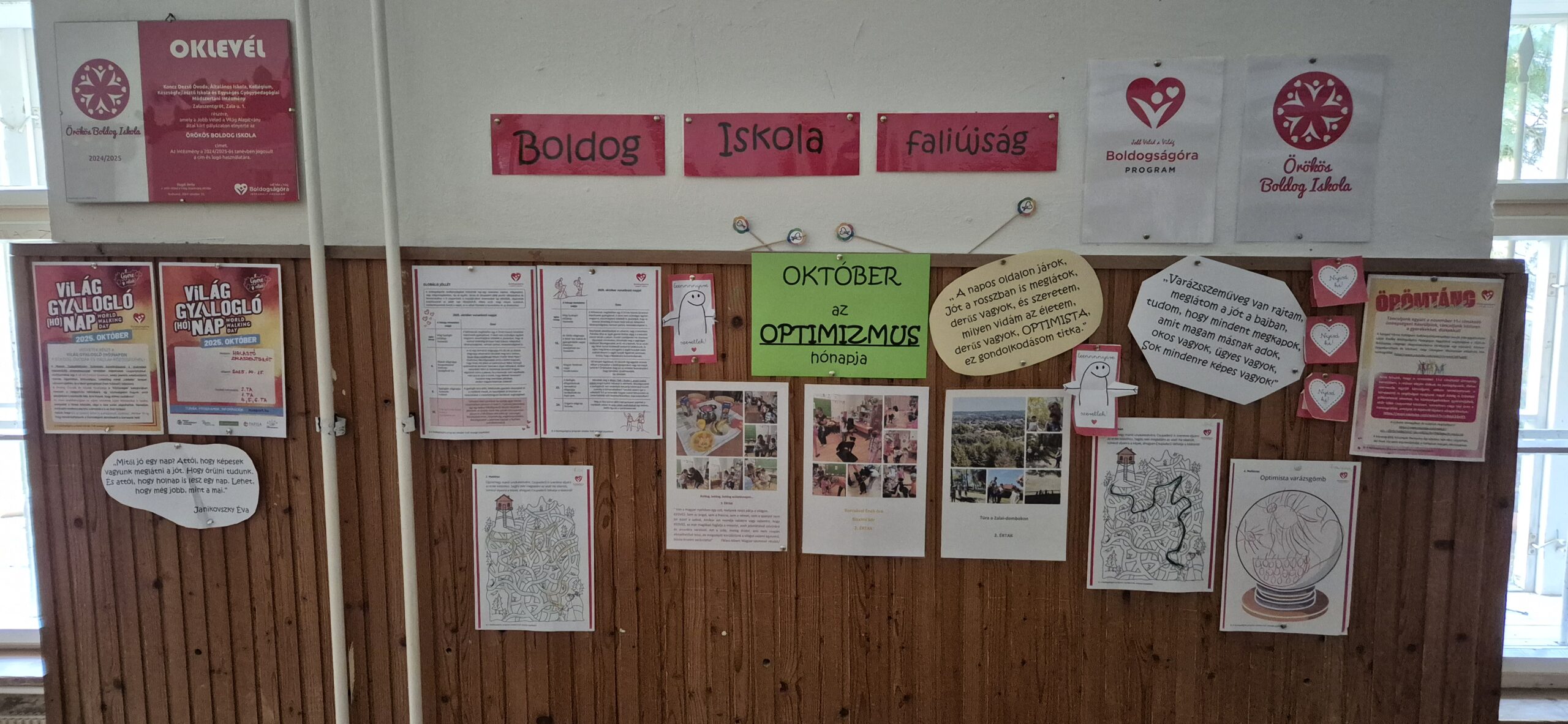 Október havi boldogságóránk rendhagyó módon telt. A Világgyalogló Naphoz csatlakozva egy kellemes túrán vettünk részt két másik boldogságórás osztállyal. Előkészültünk a túrára. A város nevezetességeiről összeírtuk a tudnivalókat, ezeket útbaejtettük a séta során. Iskolánktól, a Batthyány-kastélytól indultunk, a következő megálló a Kiskastély volt. Fotózkodtunk a Batthyány-kút előtt is, ahol a gyerekek megkóstolták a kút vizét. Kisétáltunk a Halastóhoz, bejártuk a Mókus tanösvényt és a Romtorony felé vettük az irányt. A Romtorony és környezete alkalmas volt a megpihenésre. A gyerekek kekszet és almát falatoztak, közben meghallgatták az Úgysemegy és Debizony mesét. Egy kis relaxációval lecsendesítettük őket a gyakorlati feladat elvégzése előtt. Minden gyerek kapott egy előre kivágott Ölelő manót, amit meghajtogattak és felragasztották az elejére a szívet. A munka végén táncoltak egyet a Pozitív gyerek vagyok c. dalra, majd visszamentünk az iskolába. Ezzel teljesítettük a 4 km-es távot. A tanteremben még a labirintusban megkerestük a mesében szereplő kilátót, és a varázsgömbre rárajzolhatták mindazt, amire vágynak. Tartalmas napot töltöttünk a téma feldolgozásával.