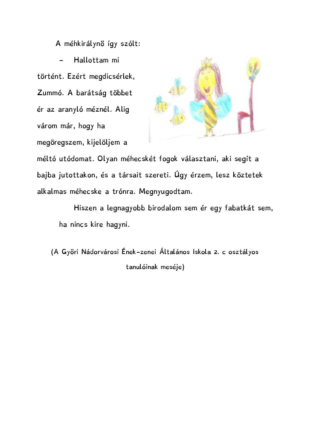 Osztályunk az idei tanévben kabalájának választotta a szorgos méhecskét. Ez a téma jelent meg a közösen alkotott mesénkben, amely a barátságról szól. A gyerekekkel több héten át fogalmaztuk a történetet, és készítettünk hozzá illusztrációkat. A meseírás közben sokat tudtunk beszélgetni a barátságról, társas kapcsolatainkról.