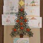 Egy korábbi foglalkozáson zöldre festett papírhengerekből csillag formát készítettünk, majd ezekből állítottuk össze a fenyőt. Sajnos az előkészületek óta a csoport létszáma megcsappant, így nem kerülhetett minden csillagra szívecske.