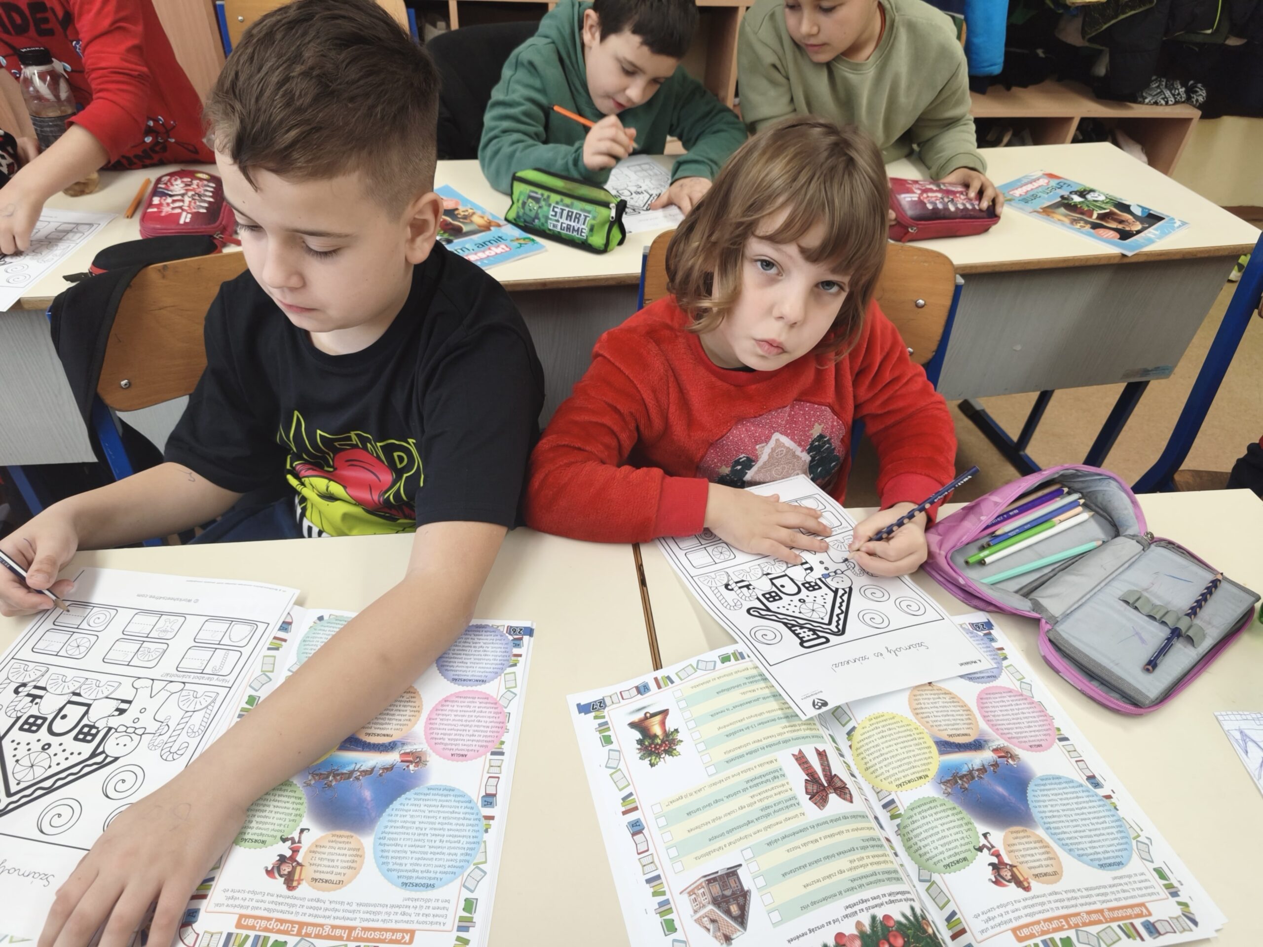 Boldogságórán pedig a segédanyagban található Lázár Ervin: A másik Télapó mesét dolgoztuk fel, és a mellékletben javasolt mézeskalács színezős feladatlapot készítették el a gyerekek.