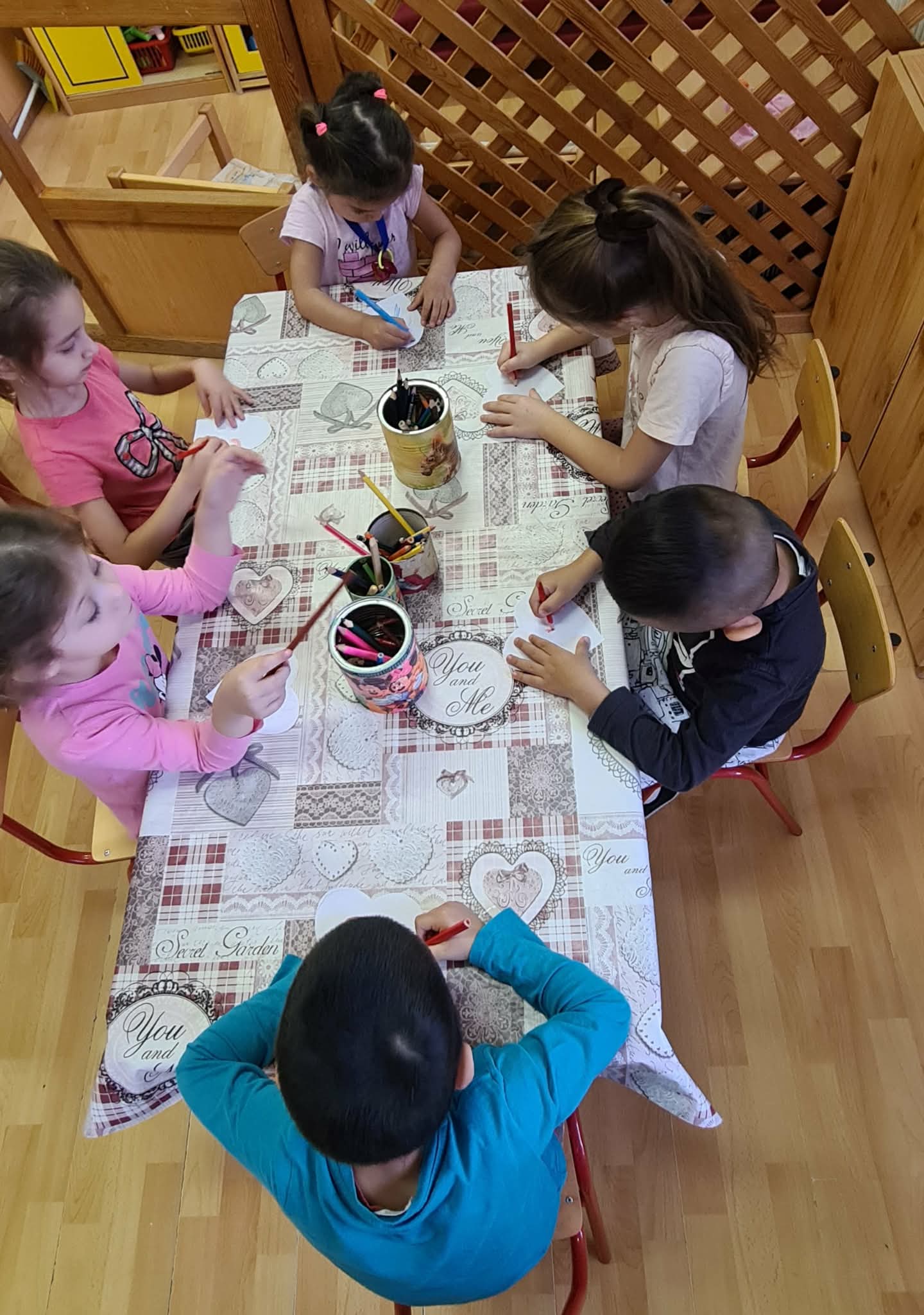 A munkafüzetből feladatokat oldottunk meg, majd jóság szívecskét színeztünk és megajándékozták egymást vele a gyerekek.