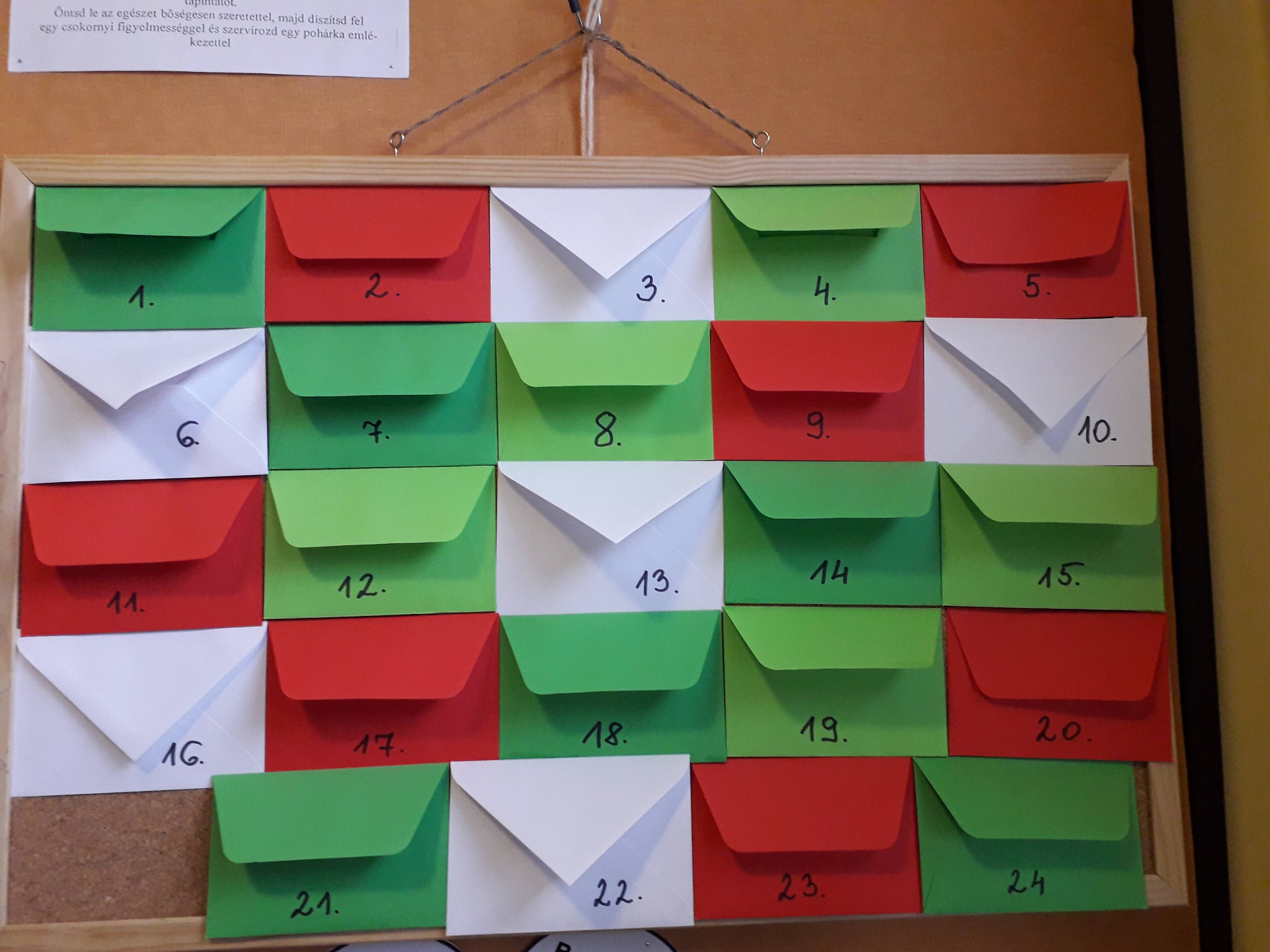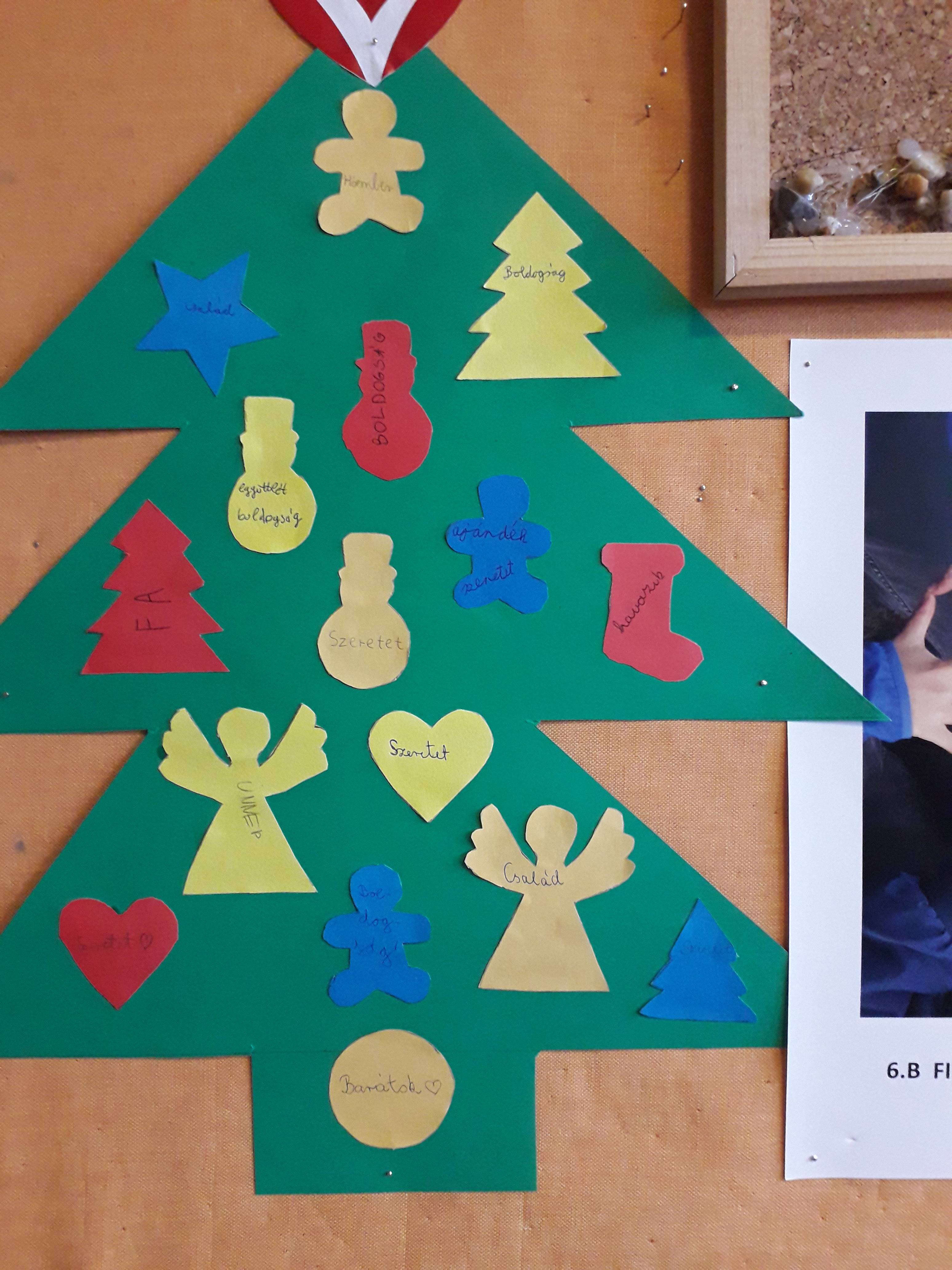 A decemberi téma kapcsán sokféle dolgot csináltunk. Készítettünk fenyőfát, amin a díszekbe karácsonnyal kapcsolatos szavakat írtunk. Készítettünk adventi naptárt, ahol minden borítékba karácsonyi idézeteket tettem és mindenki húzott, majd az osztály karácsonyon felolvastuk ezeket. Angyalkáztunk, megajándékoztuk egymást, dalokat énekeltünk, karácsonyi történetet olvastunk, süti partyt szerveztünk és jó cselekedet listát kaptak a gyerekek. Otthon készített sütiket hoztak, egymást megkínálták és receptet cseréltek. A jó cselekedet listáról minél több dolgot lehet megcsinálni decemberben, amiről szünet után beszámolnak. Közösen feldíszítettük az osztály karácsonyfáját és közös képet készítettünk kivágott papír angyalkákkal. Sok mesekönyvet gyűjtöttünk és könyvjelzőt csináltunk.