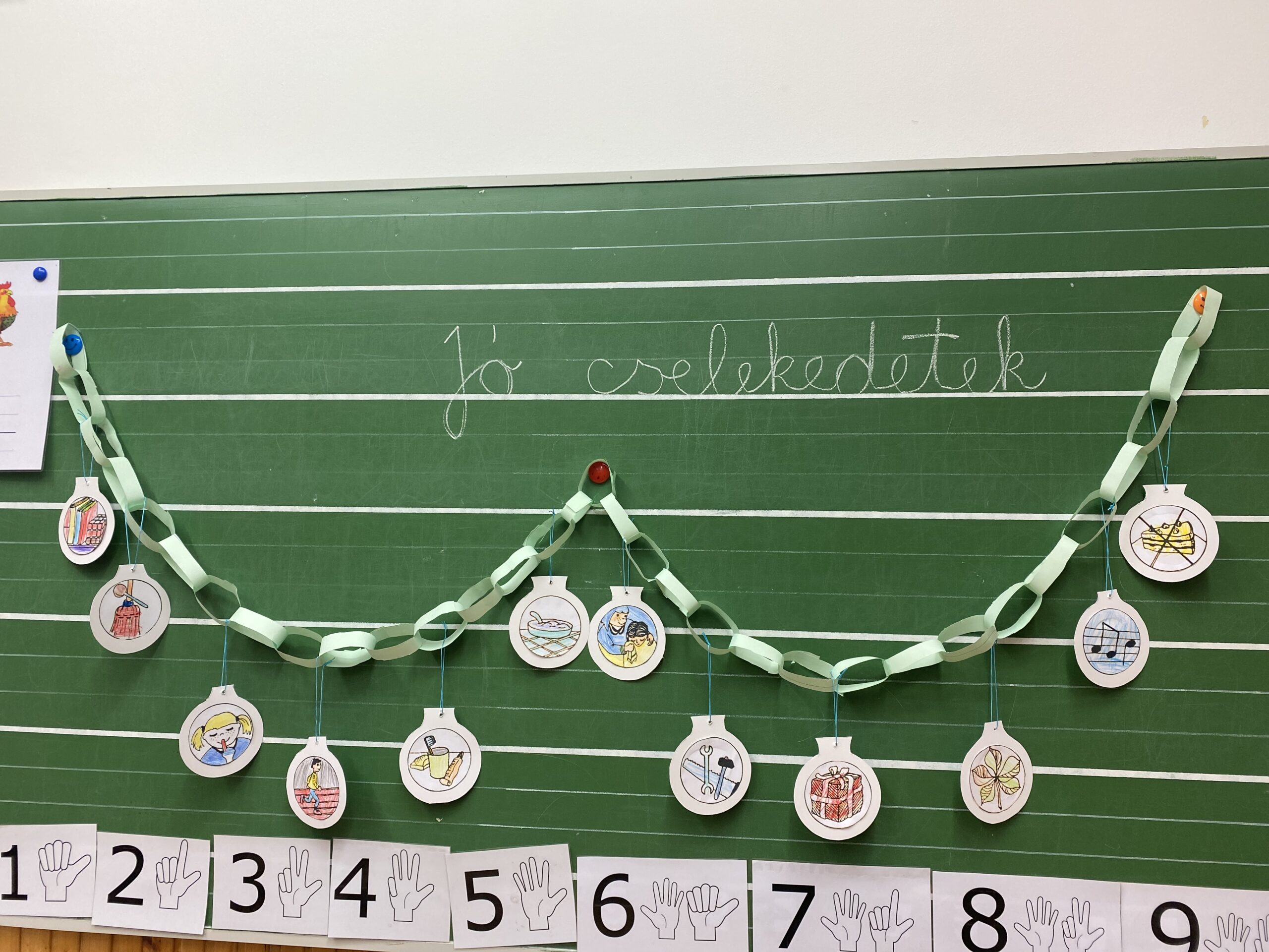Decemberben már ráhangolódtunk a karácsonyra, vele együtt elhatároztuk azt is, hogy a jó cselekedeteket egy csokorba gyűjtjük. Ezért miután egy rövid karácsonyi zenével megalapoztuk a hangulatot, neki is láttunk egy füzér elkészítésének, melynek ékei a gyermekek által színezett jó cselekedetes képek voltak. Ahogy egyre bővült a lánc, rájöttek, hogy nagyon sok dolgot tehetnek ők is gyermekként, mellyel szebbé tehetik a világot.