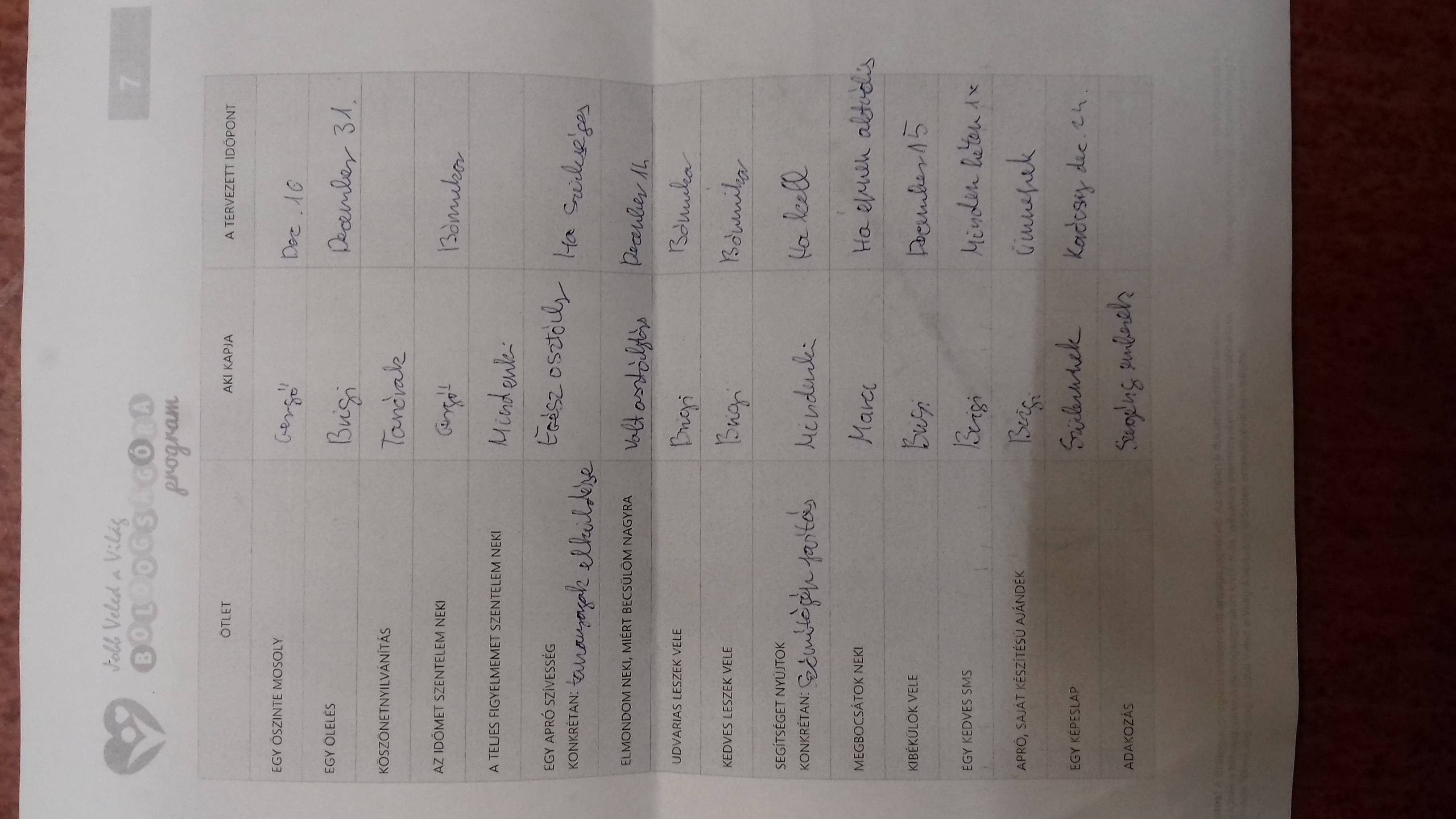 Majd beszéltünk a jó cselekedetekről. Megnéztük a kisfilmet, majd körben mindenki elmondta, mikor kapott valakitől kedvességet és támogatást. Ezután megcsinálták a fiúk az egyéni jó cselekedet tervezése feladatot, egy ilyen lapot csatolok is. Majd az órát azzal zártuk, hogy gondolkodjanak, milyen jó cselekedetet tudnának végezni közösen Karácsony előtt.