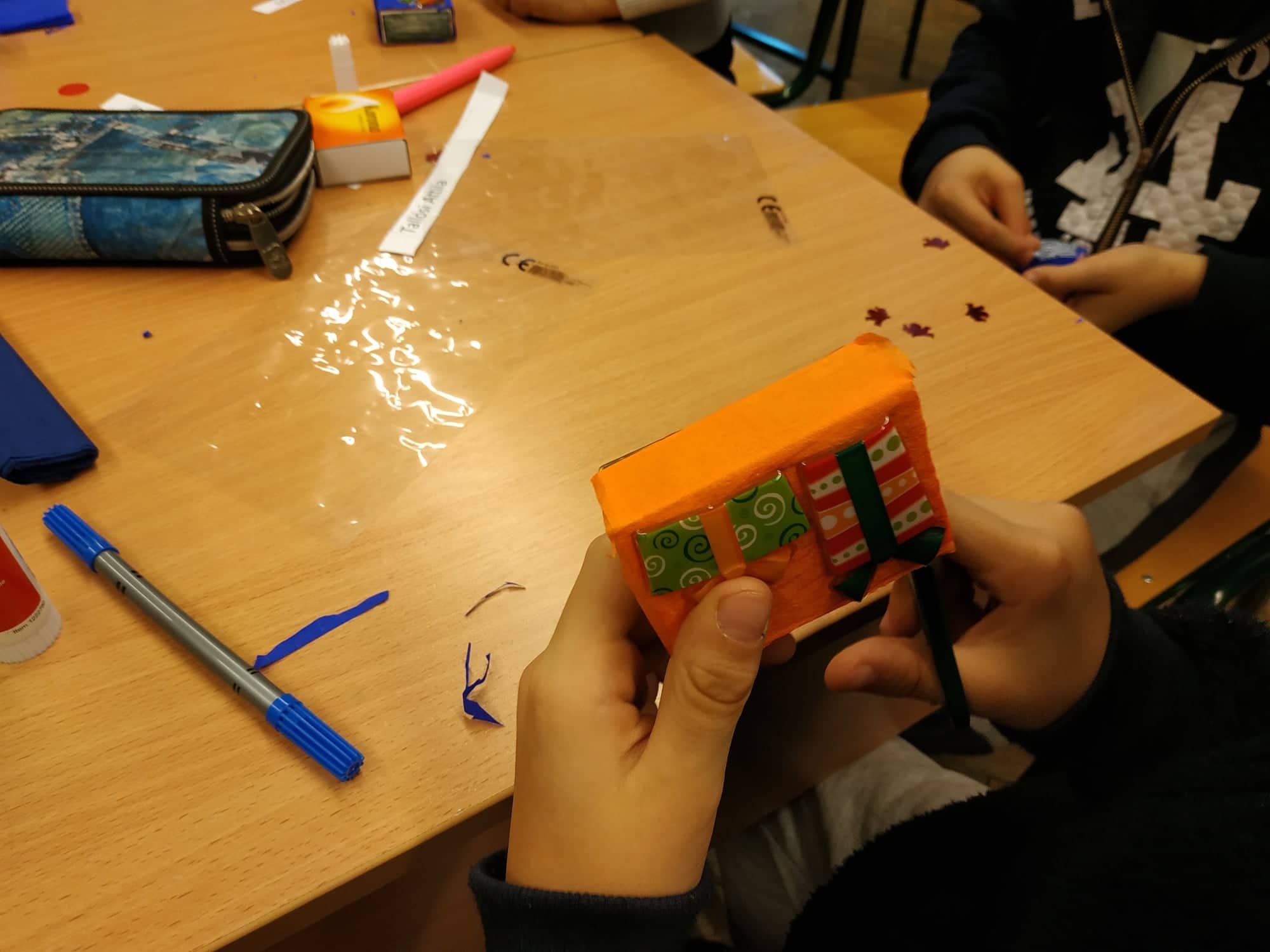 Az osztály tanulói elkészítették saját ajándékdobozukat, melyet felhelyeztünk a „jó cselekedetek -képeslapra”. Mindenki kihúzott egy cédulát, melyen osztálytársa neve szerepelt. A feladat az volt, hogy a következő boldogságóráig egy jó cselekedettel kell megajándékozni egymást: felírták a papírra, majd belerakták a megfelelő dobozba „ígéretüket”.