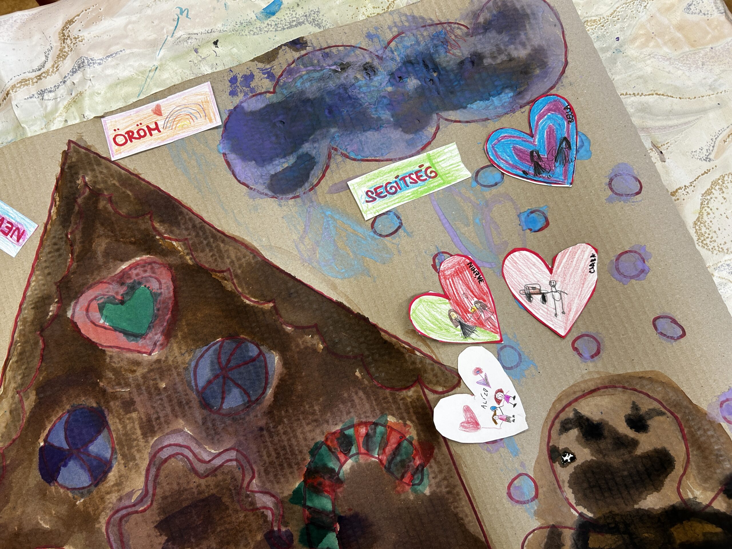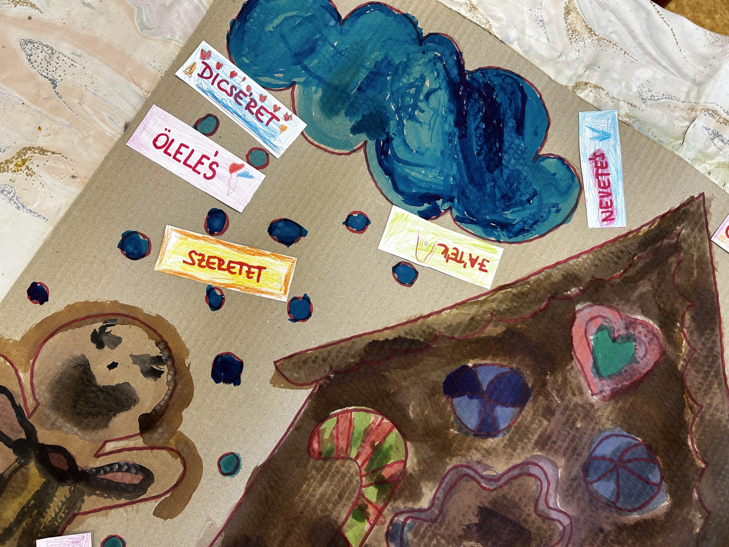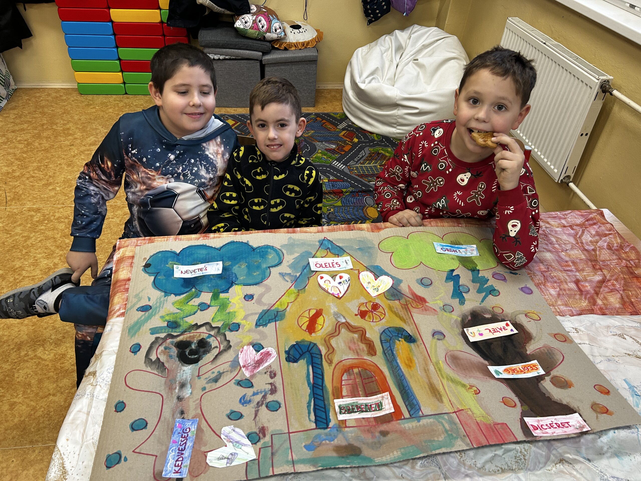 A gyerekekkel nagy kartonra készítettünk a napköziben mézeskalács házakat, amiket kifestettek, majd olyan szavakkal díszítettek, ami a házikókban mindenkinél megtalálhatóak: szeretet, segítség, nevetés, öröm és így tovább.