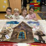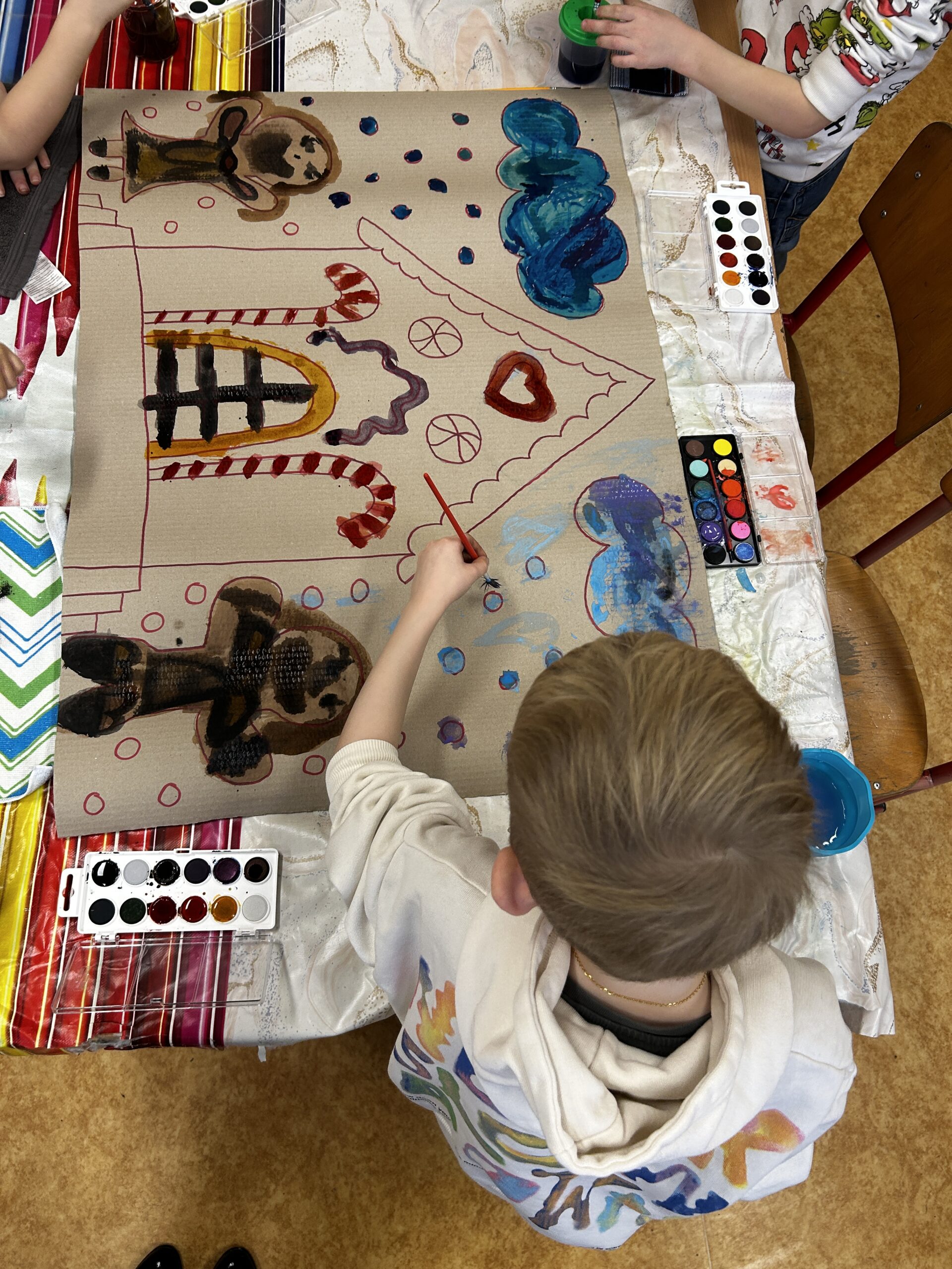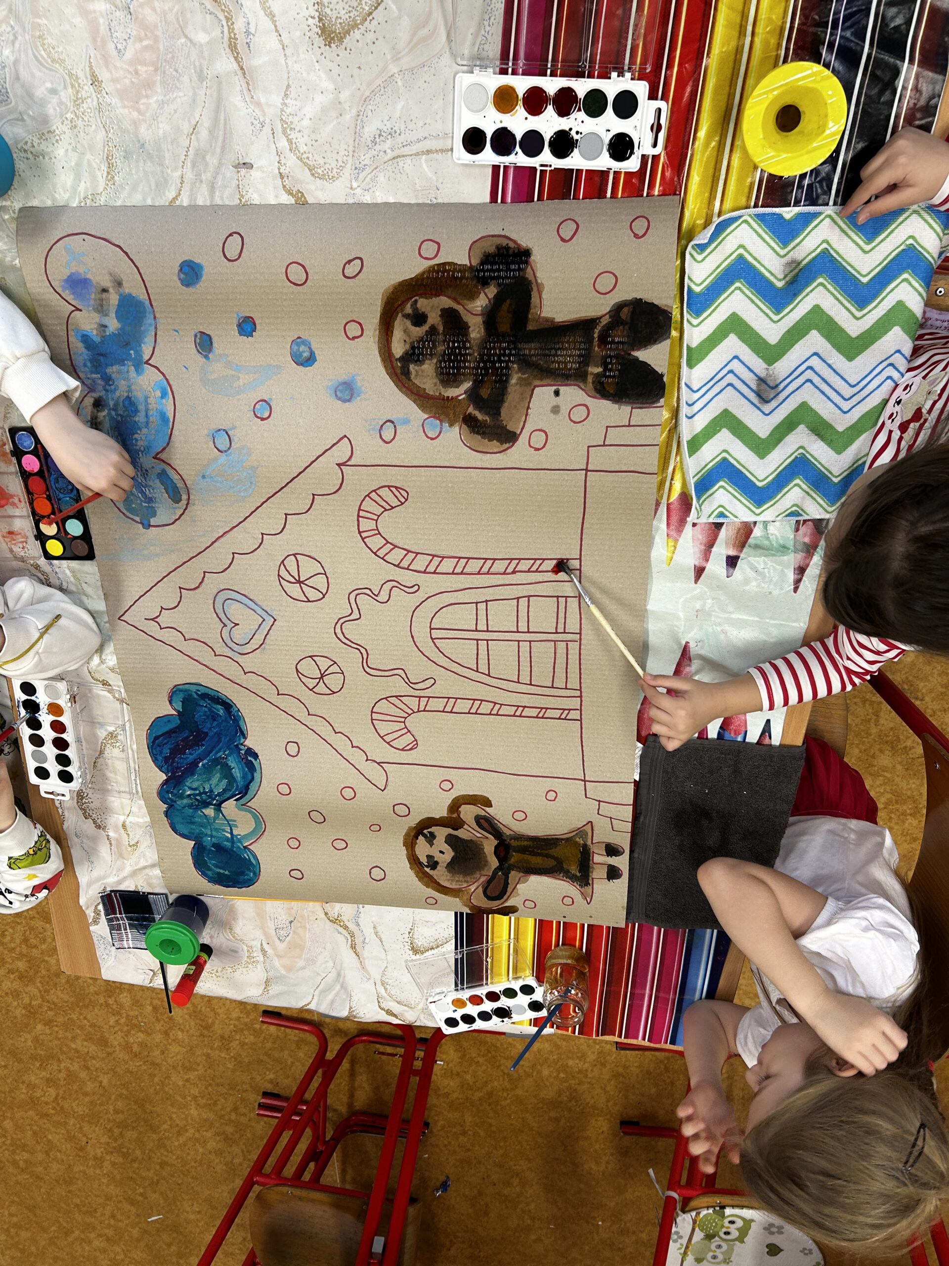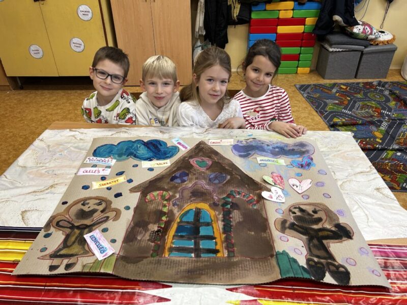 A gyerekekkel nagy kartonra készítettünk a napköziben mézeskalács házakat, amiket kifestettek, majd olyan szavakkal díszítettek, ami a házikókban mindenkinél megtalálhatóak: szeretet, segítség, nevetés, öröm és így tovább.
