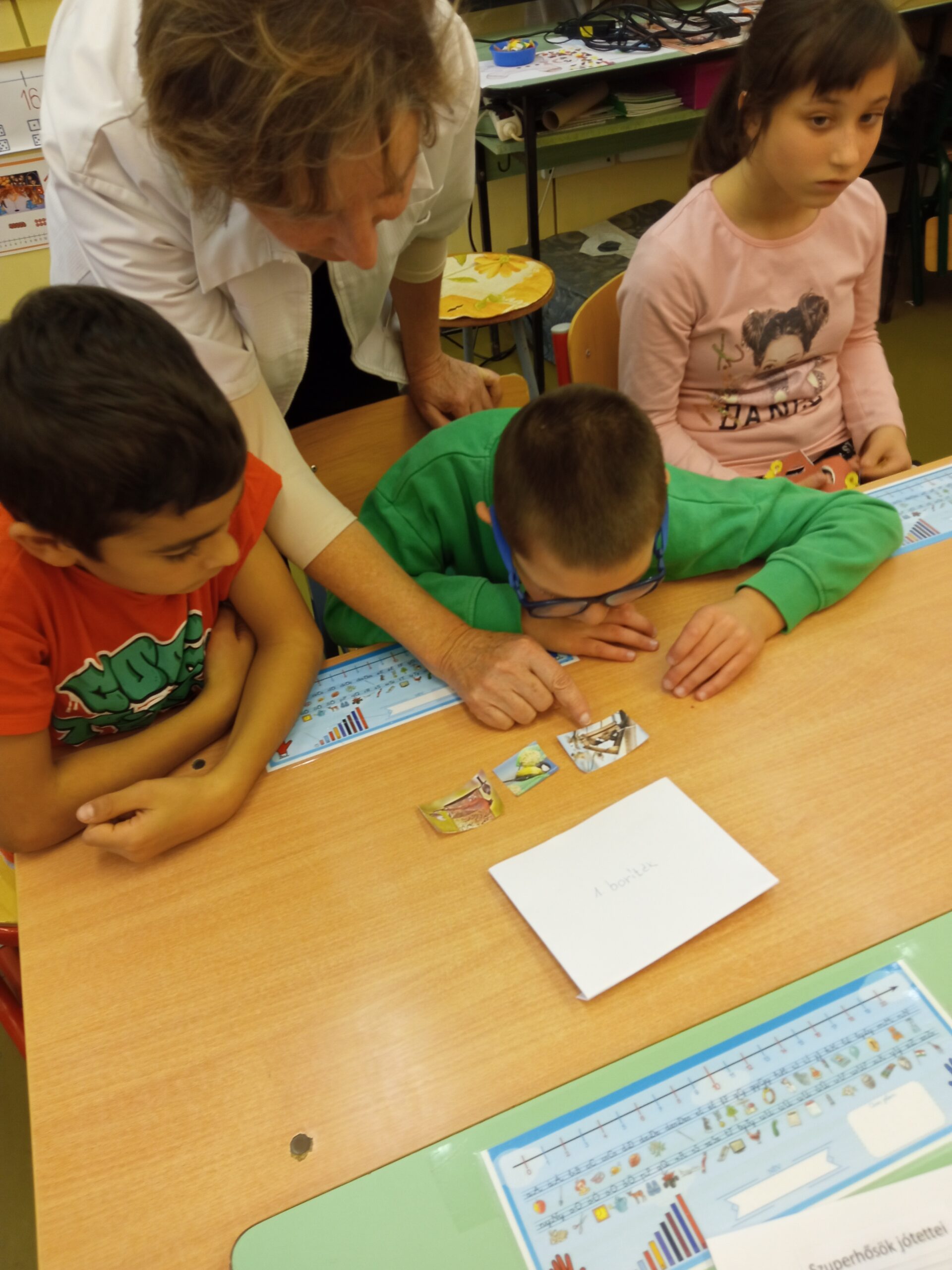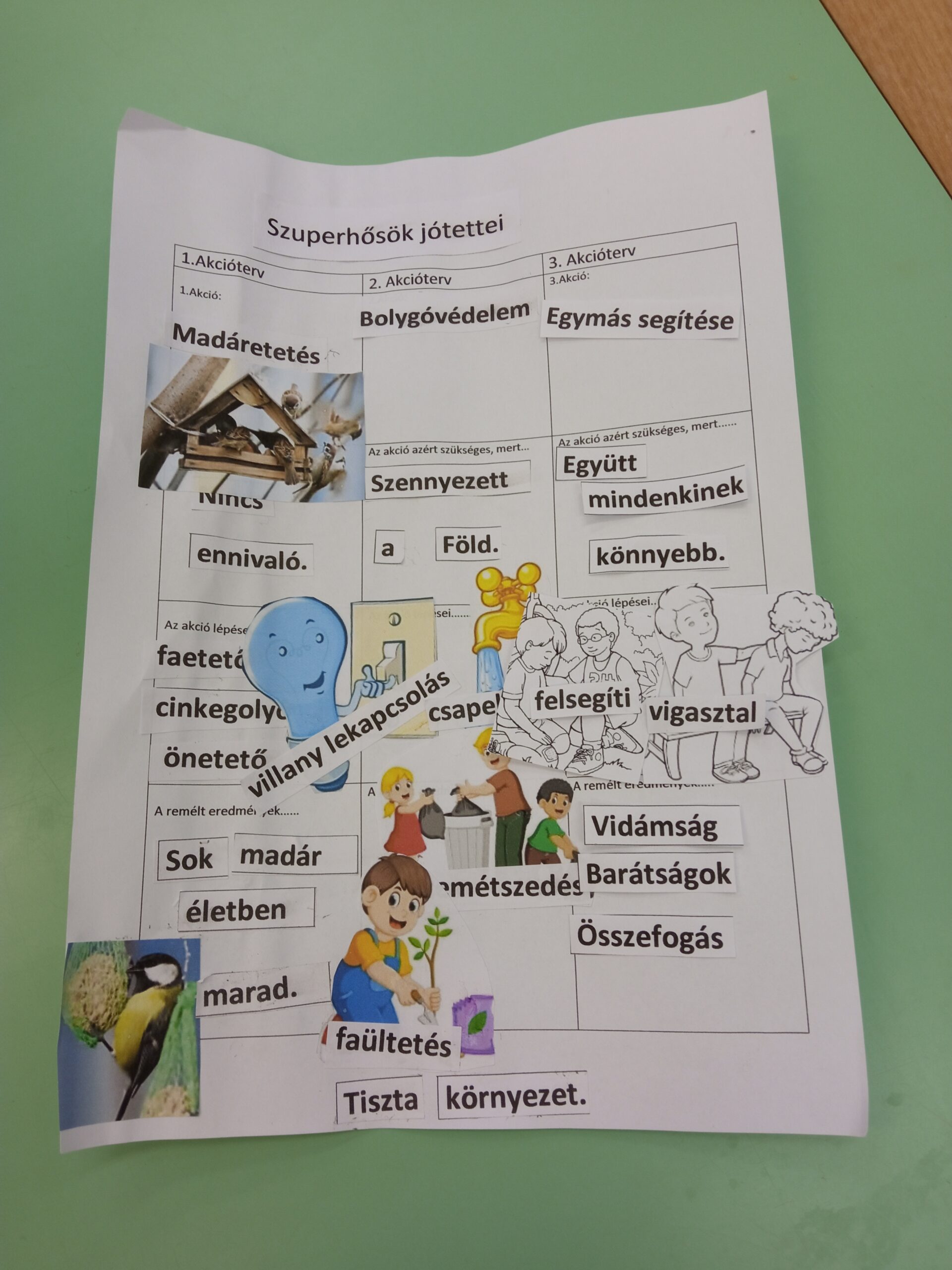 1.akció: madáretetés. A kisebb gyerekek képeket figyeltek meg, melyeknek egy közös nevet adtak. A nagyobb gyerekek egyeztették a képeket a szókártyákkal. Az egyeztetett képek és szókártyák az első oszlopba kerültek(Boldogságóra Munkafüzet 6-10 éveseknek-Szuperhősök jótettei) 2.akció:bolygóvédelem.A megoldás módszere az előzővel megegyező.