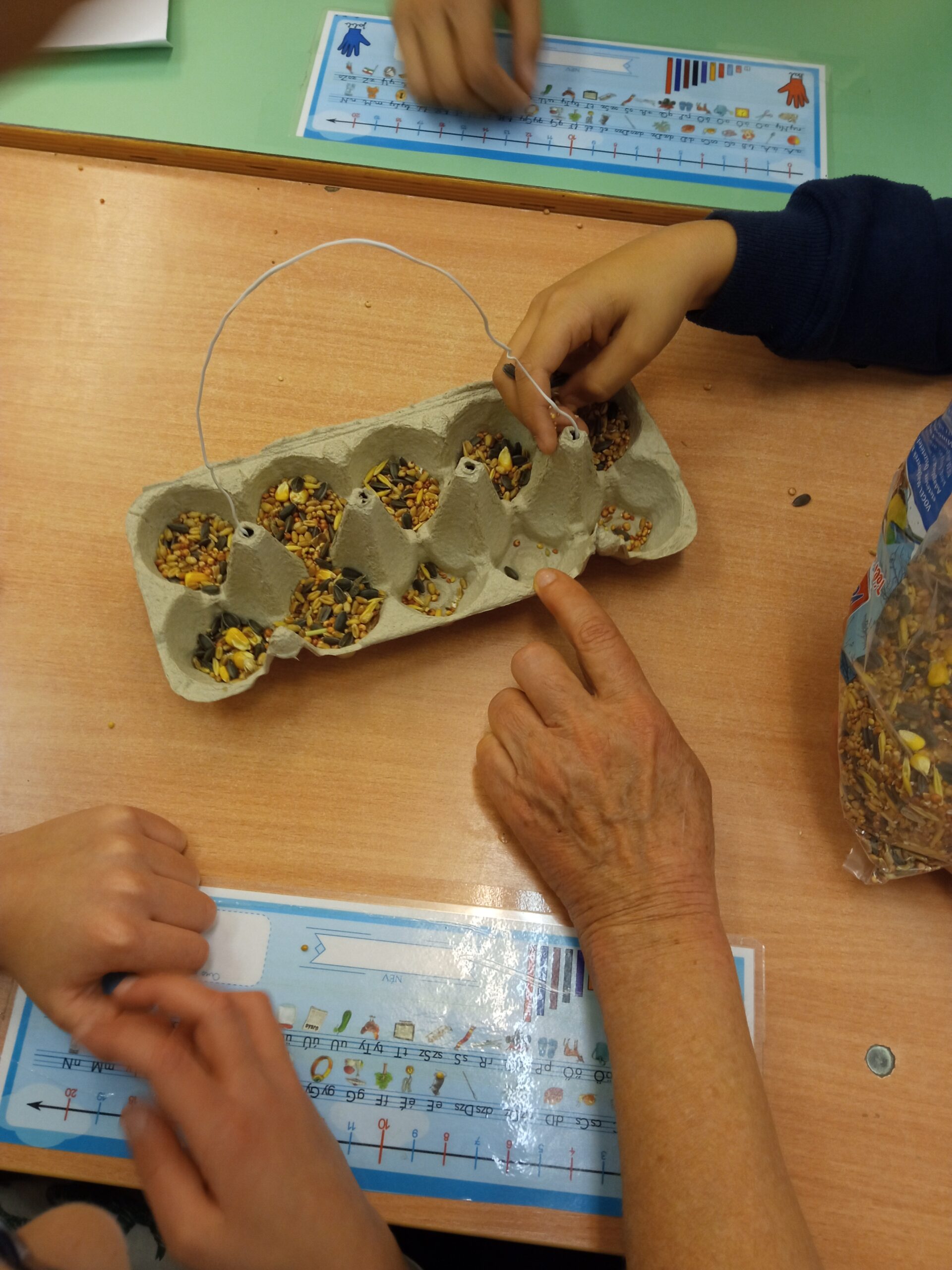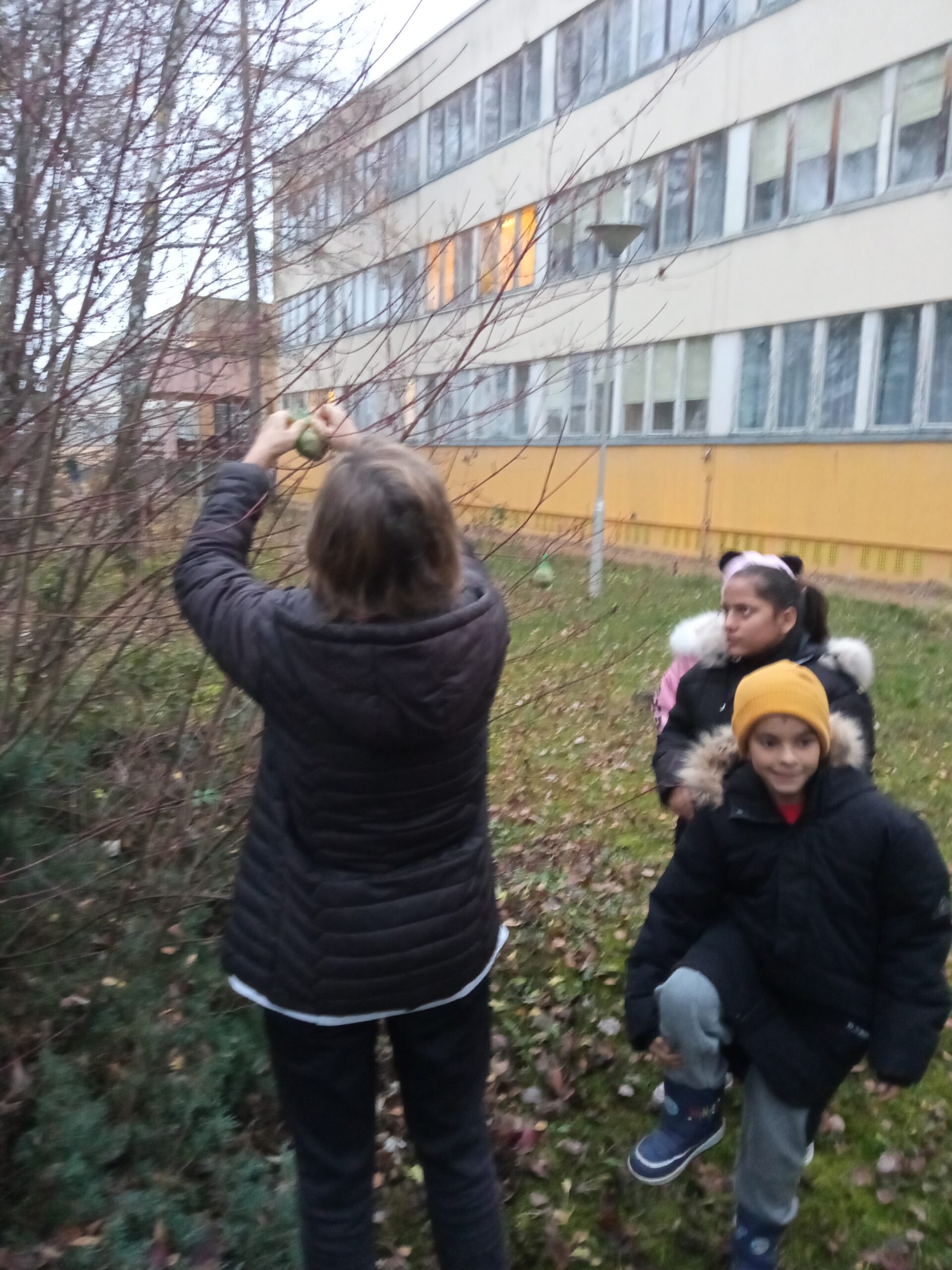 Megvalósítás: a madáretetőt az elkészítés után még aznap kihelyeztük a kertbe. Cinkegolyót és almát vittünk még. Figyelemmel kísérjük a magok fogyását az etetőben. A bolygóvédelemben a víz-és áram takarékosság folyamatos munka. Az osztályban a szemét felsöprése napi feladat. Az udvaron hetente végezzük. Viráglocsolás szükség szerint az aulában. Egymás segítése-folyamatos, napi munka. A „Jószívű” cím elnyerése verseny indult a csoportban a téli szünet kezdetéig.