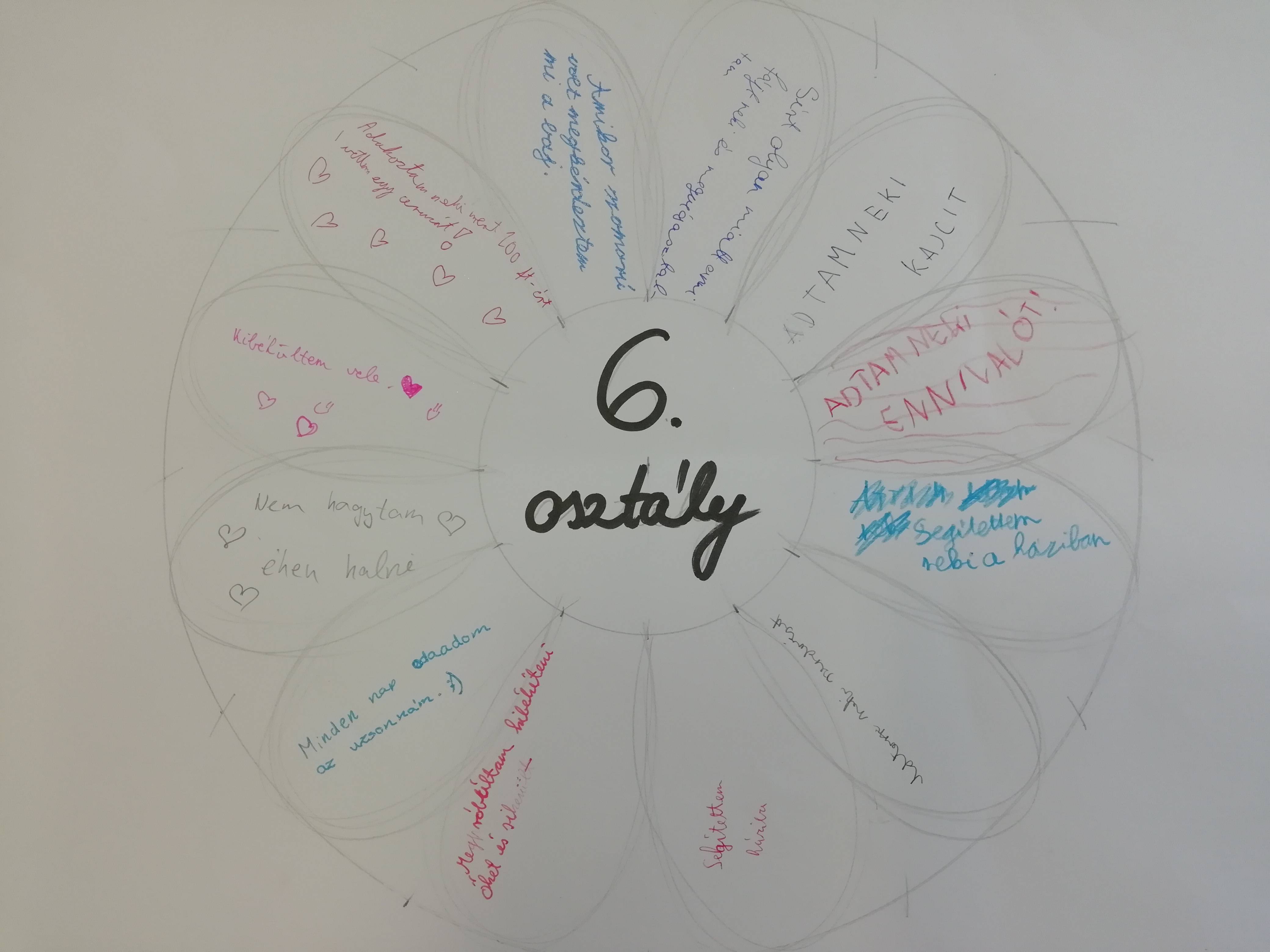 Jó cselekedetek virága. Rajzoltunk egy nagy méretű lapra virágot és a virág közepébe beleírtuk, hogy 6. osztály. Minden tanuló egy sziromba írta, milyen jót tett az egyik osztálytársával. Ezt közösen készítettük el.