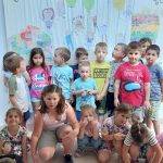 Szerdán Lili rajzot hozott reggel, melyen lerajzolt minden felnőttet a csoportban, és Boldog Dórit is. Szintén kérték a gyöngyöket, egyre többen jöttek fűzni, Zolika hívta a barátait „gyertek barátság karkötőt fűzni!” Jöttek is, még a pici Emmát is hívták, és kiszolgálták, hozták neki a gyöngyöket, hogy „ezt fűzd fel, ez szép!” A nagyokat csapatokba verbuváltam, egyik felük az óvodát, másik felük az iskolát rajzolta le. Az iskola szivárvány színű lett, annyira szépre színezték, hogy féltékeny lettem. Mindenkinek a kézfejére rajzoltam arcfestékkel nevető smilekat, a tenyerükre meg szívecskéket. Szorosan össze kellett fogni a kezüket, mindenkinek a nevető arc látszódott, megráztuk egyszerre háromszor, és megfordították a kezüket, akkor a szívecske látszott. Ez mutatta az összetartozásunkat. Meghallgattuk a Hahó együttes Barátság dalát, amit nagyon szeretnek, mert a refrént már éneklik is: „béke, béke, barátság, mi volt ez a szamárság…” Körjátékokat gyakoroltunk, ismételtünk.
