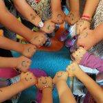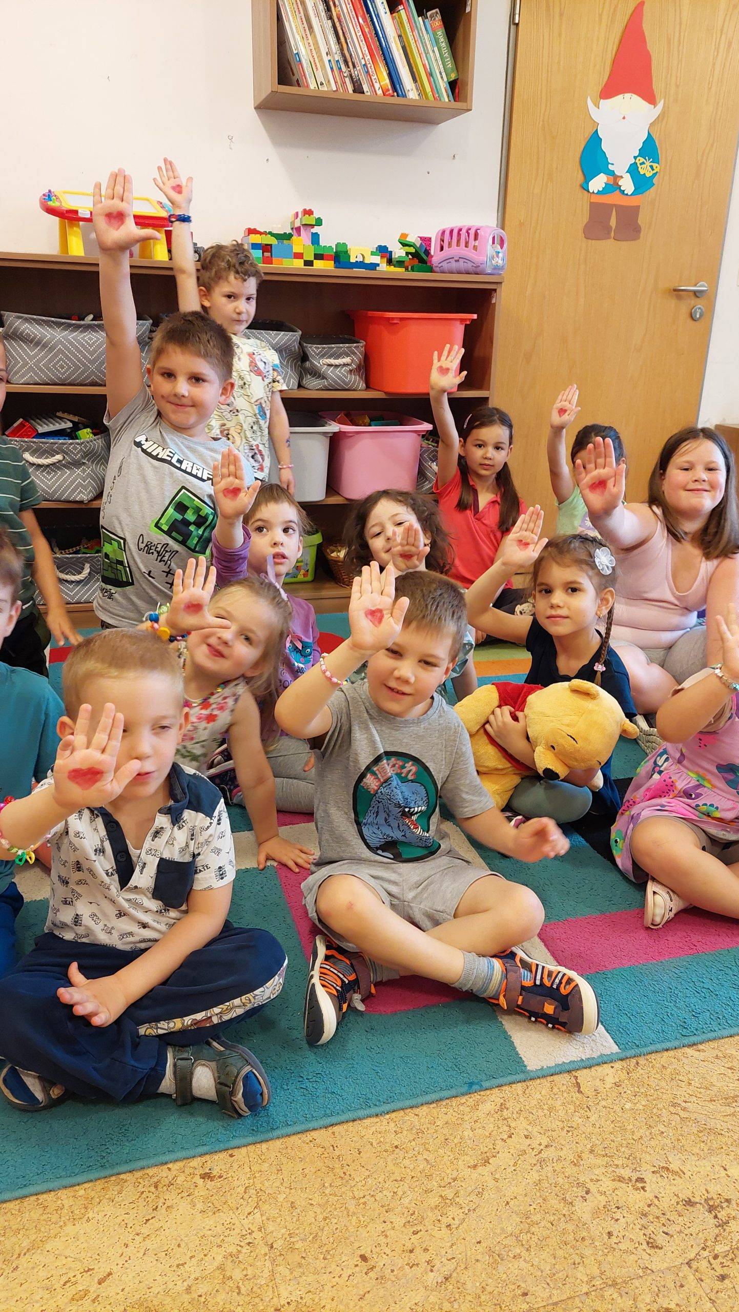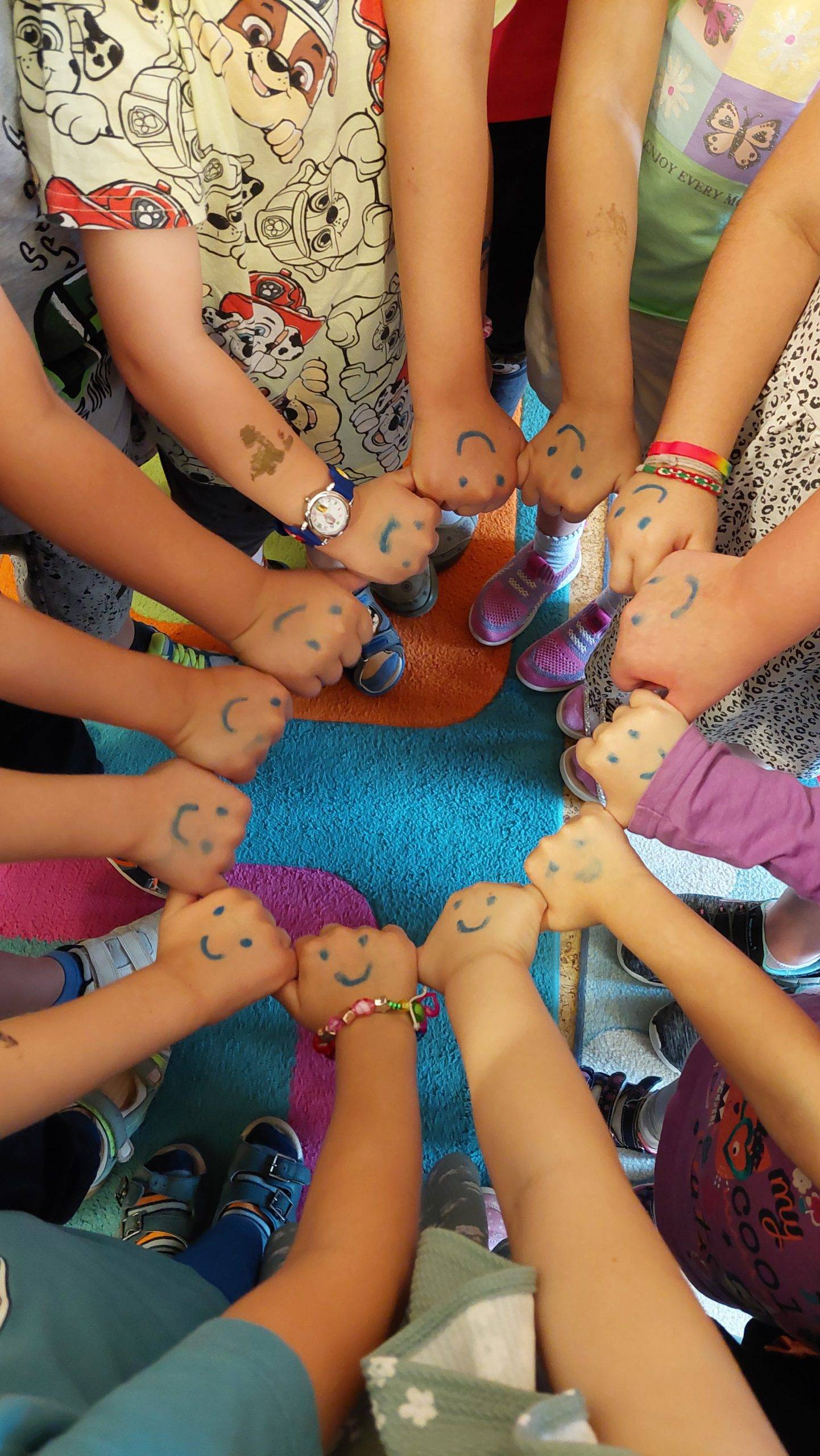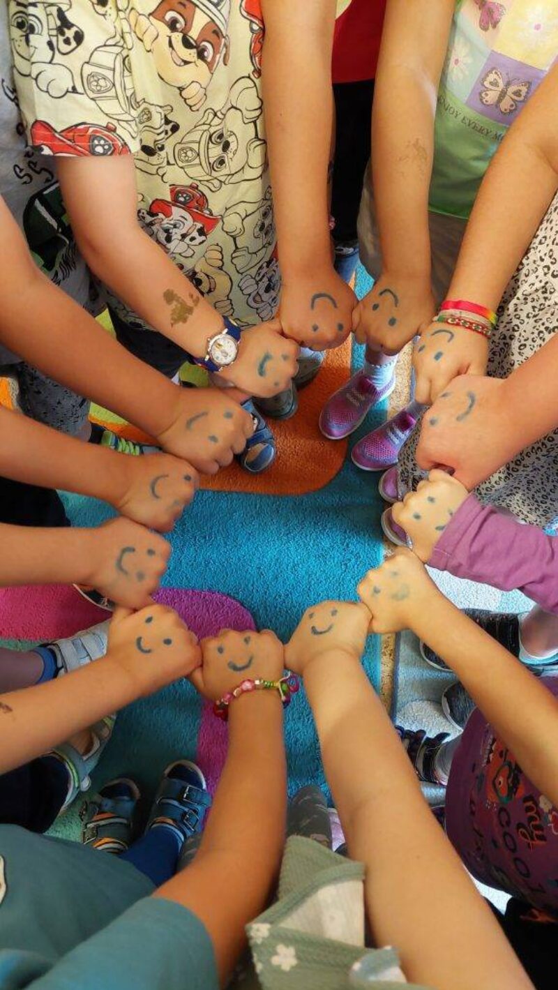 Szerdán Lili rajzot hozott reggel, melyen lerajzolt minden felnőttet a csoportban, és Boldog Dórit is. Szintén kérték a gyöngyöket, egyre többen jöttek fűzni, Zolika hívta a barátait „gyertek barátság karkötőt fűzni!” Jöttek is, még a pici Emmát is hívták, és kiszolgálták, hozták neki a gyöngyöket, hogy „ezt fűzd fel, ez szép!” A nagyokat csapatokba verbuváltam, egyik felük az óvodát, másik felük az iskolát rajzolta le. Az iskola szivárvány színű lett, annyira szépre színezték, hogy féltékeny lettem. Mindenkinek a kézfejére rajzoltam arcfestékkel nevető smilekat, a tenyerükre meg szívecskéket. Szorosan össze kellett fogni a kezüket, mindenkinek a nevető arc látszódott, megráztuk egyszerre háromszor, és megfordították a kezüket, akkor a szívecske látszott. Ez mutatta az összetartozásunkat. Meghallgattuk a Hahó együttes Barátság dalát, amit nagyon szeretnek, mert a refrént már éneklik is: „béke, béke, barátság, mi volt ez a szamárság…” Körjátékokat gyakoroltunk, ismételtünk.