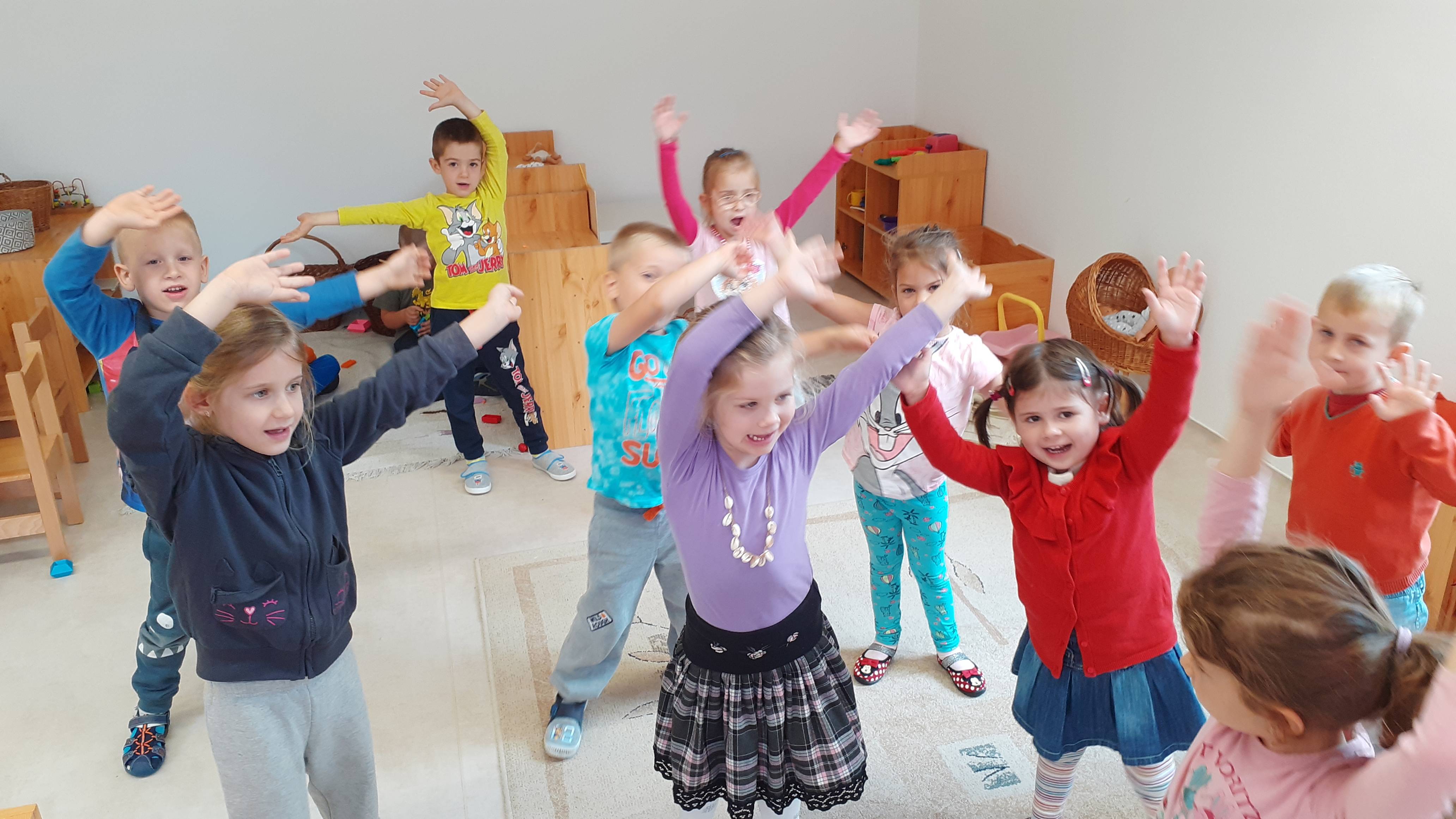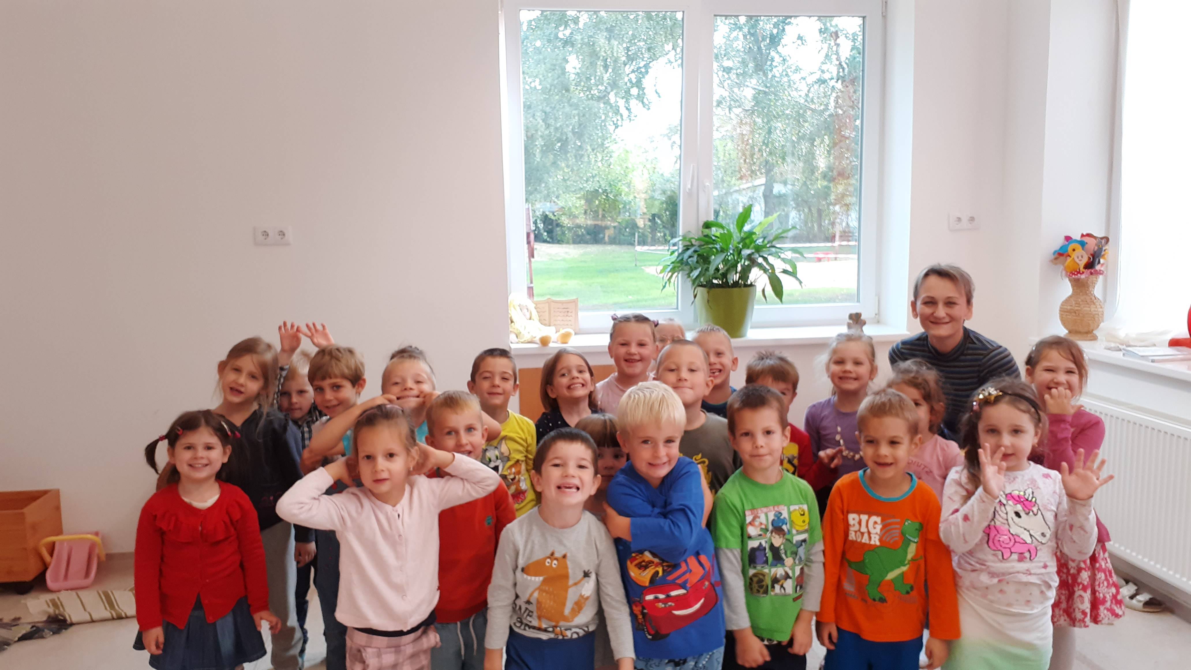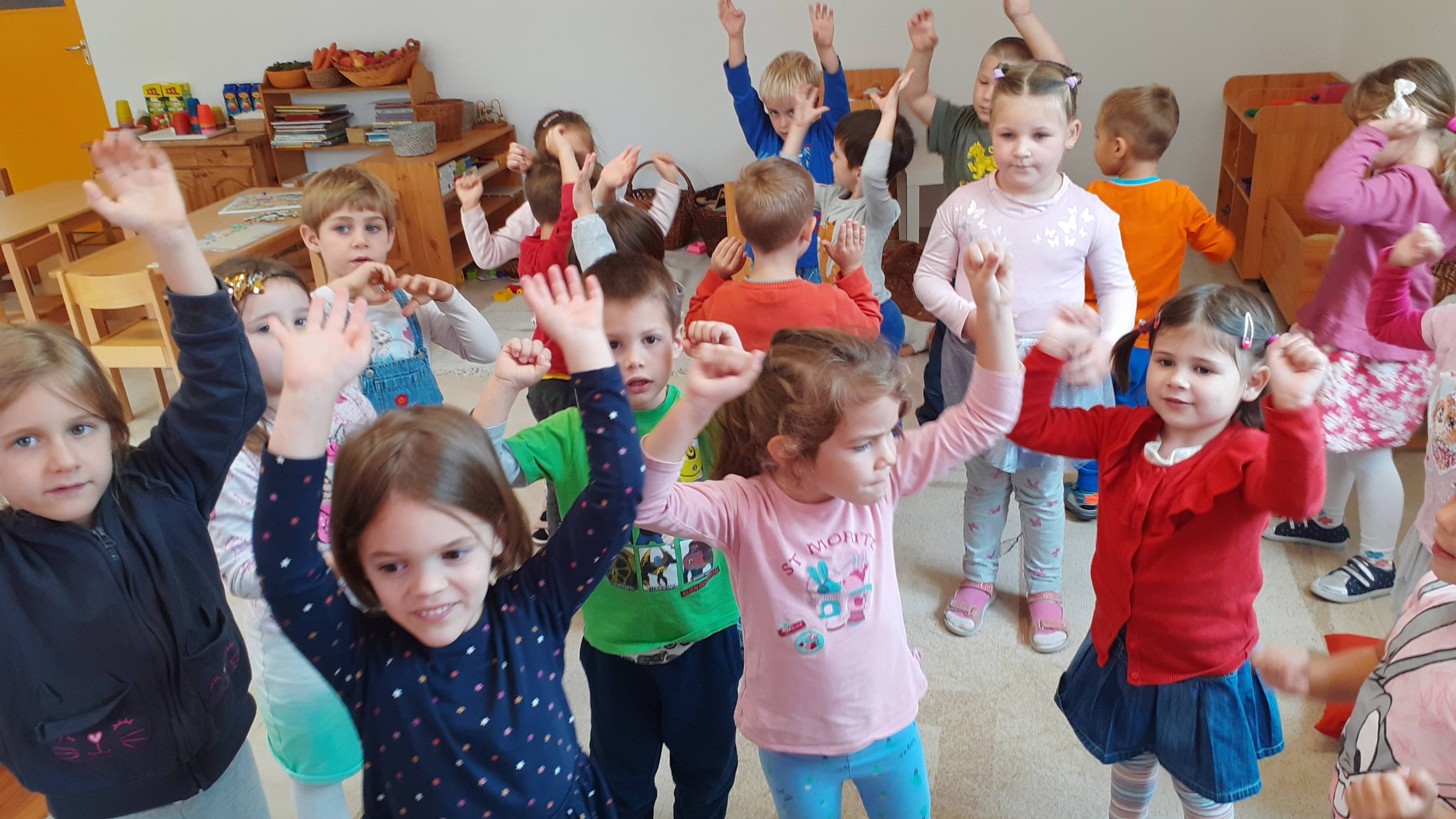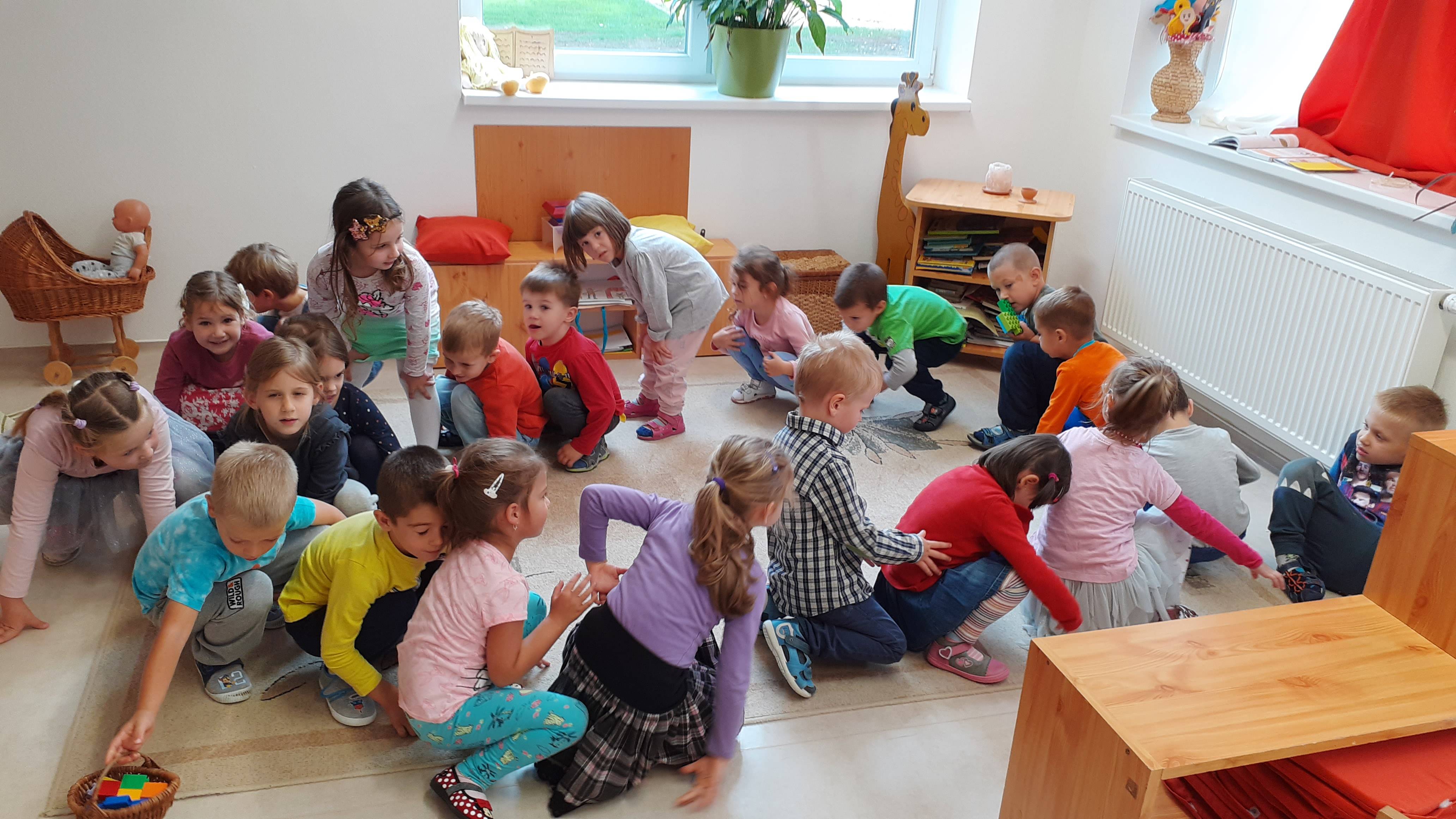 A gyermekeket képzeletbeli kirándulásra hívtam. Dramatikus játék során elutaztunk egy erdőbe, ahol a fák megtornáztattak bennünket.