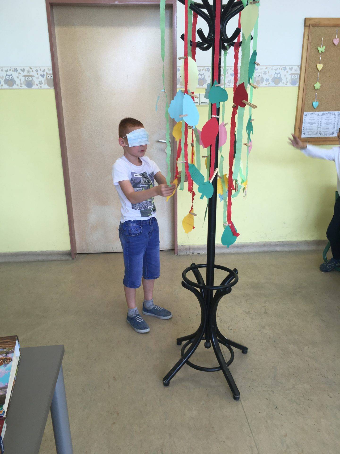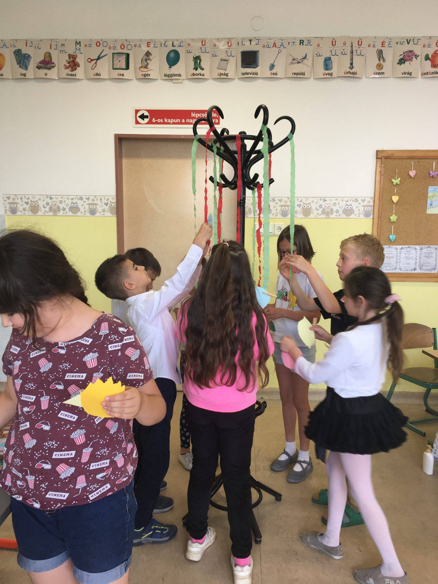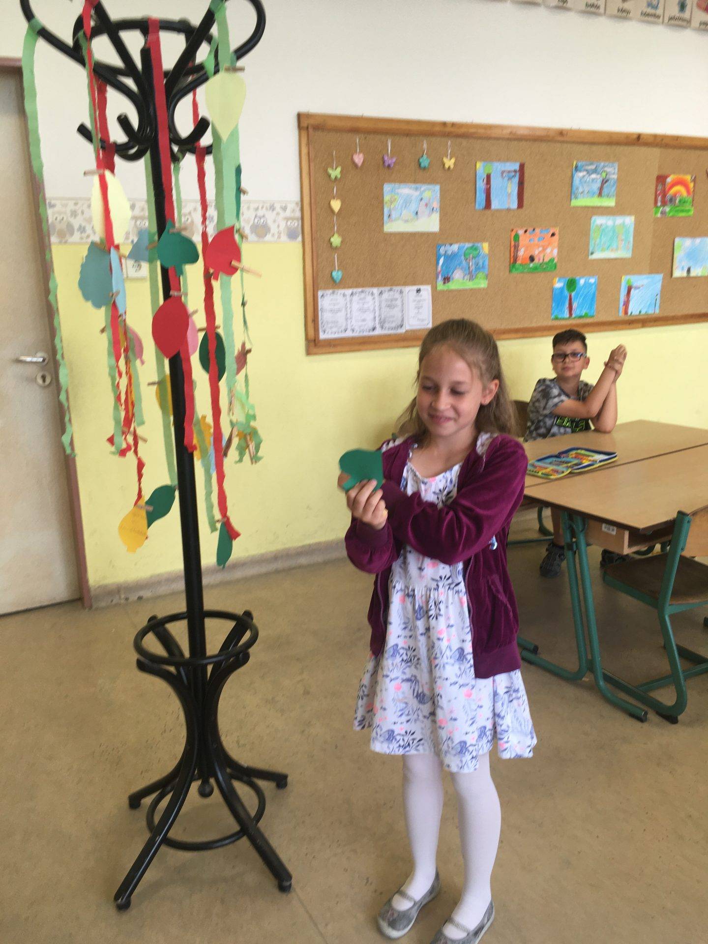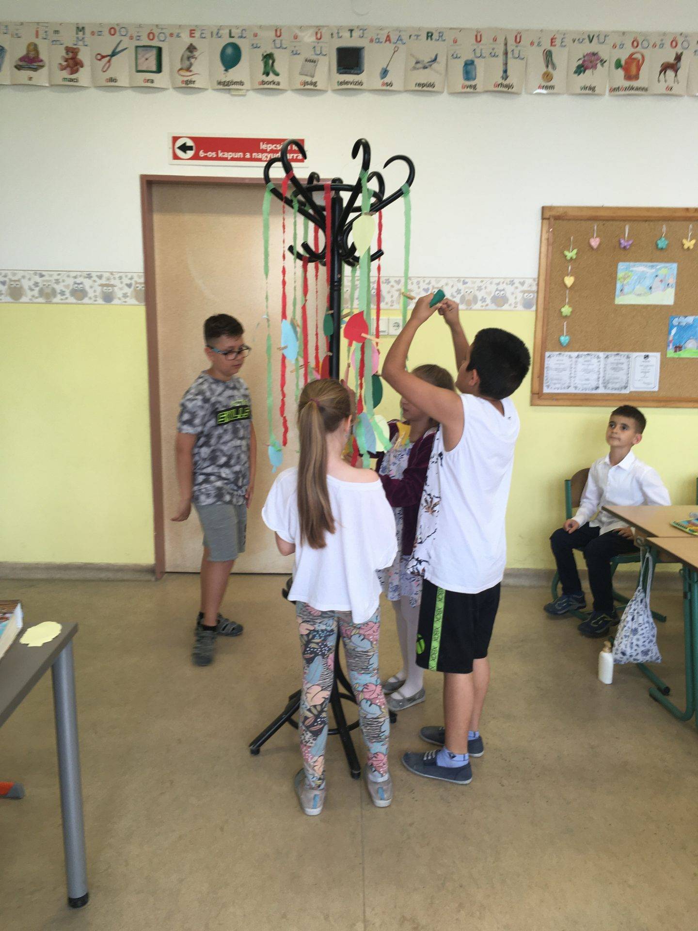 Az én osztályom nagyon szeret beszélgetni, mindig rengeteg mondanivalójuk van. Így ezt az órát is beszélgetéssel kezdtük. Arról beszélgettünk, kinek milyen jó emléke van a tanévről. Mi volt igazán jó, mitől volt jó? Hogyan érezték magukat a tanév során. Szóban elkészítettük a boldogságábécét. Ezután meséltem nekik arról a galaxisról, ahol a Bölcs Galaxisfa él. Megbeszéltük milyennek képzelik ezt a fát, mitől lehet bölcs a fa, hogyan segítheti a galaxis lakóit. Végül megalkottuk a saját galaxisfánkat. Mindenki készített 2-3 falevelet, amelyre bölcs tanácsokat írt arra az esetre, ha valaki elszomorodna. Amikor elkészültek a levelekkel, felcsiptették a „fára”. Mikor mindenki levelei a fán voltak, bekötött szemmel választhattak a fa levelei közül, és felolvasták a többieknek a jó tanácsokat. Végül meghallgattuk a hónap dalát.