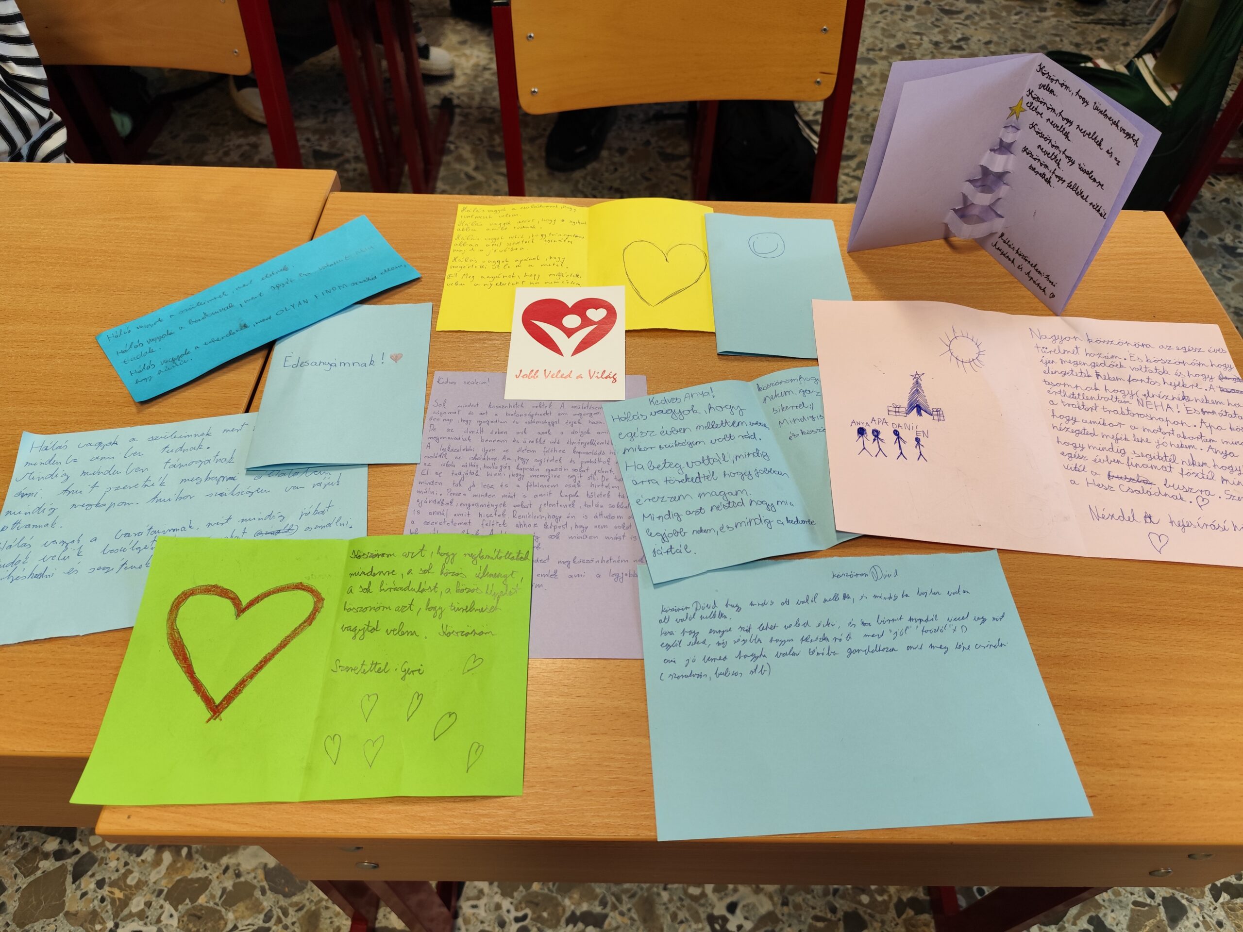 A karácsonyi hangolódás közben, a tanulókat megkértem, hogy készítsenek egy képeslapot az egyik barátjuknak, családtagjuknak. Szívből jövő üzeneteket, rajzokat készítettek. Közben karácsonyi zenéket hallgattunk, hogy érezzék a szeretet erejét.