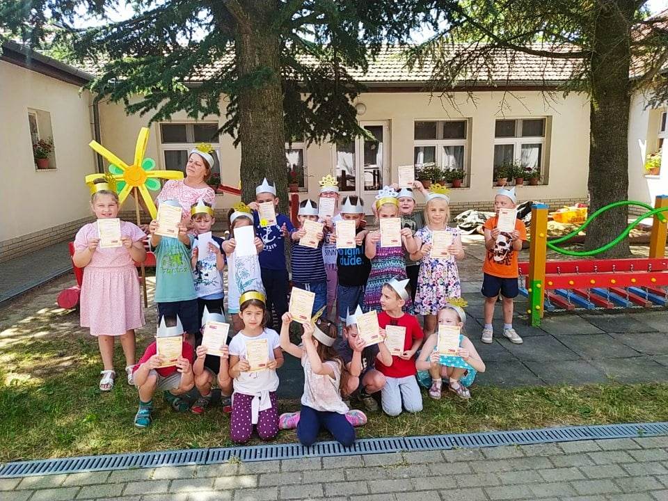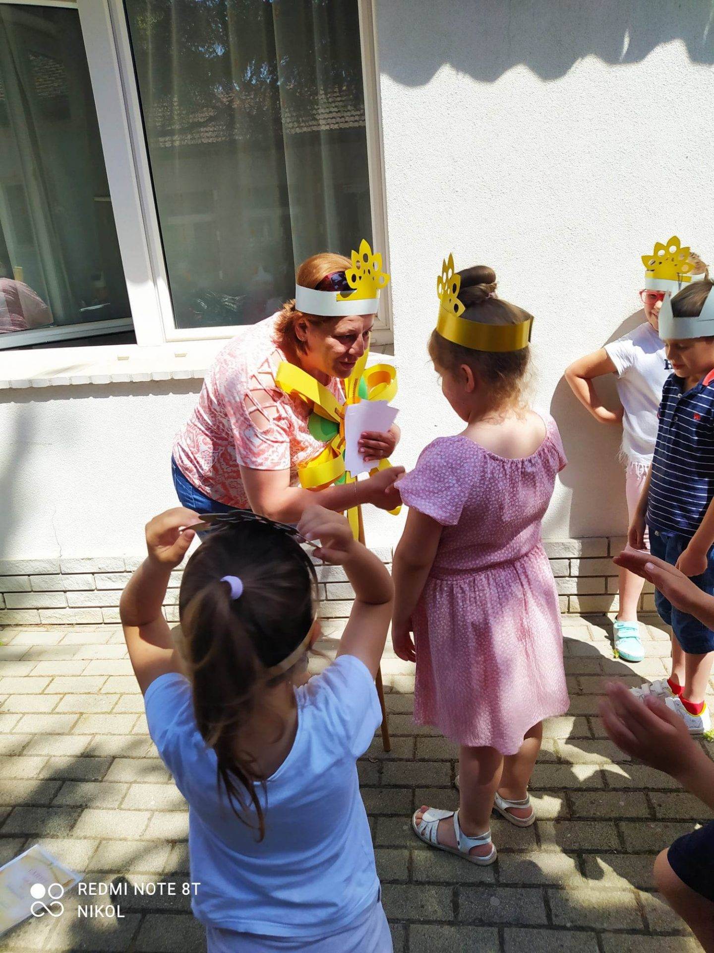 A beszélgetés után elmeséltem nekik a Boldogerdő-Kerekerdő című mesét, majd ezt követően elkezdődött a mi kis ünnepségünk. Az óvodánk belső udvarára addig a dajkanéni és a pedagógiai asszisztes megterítettek, mindenféle finomságot feltálalatak, kellő mennyiségű italt is kihelyeztek és miután megbeszéltük az egész éves tevékenységünket, kimentünk az udvarra, ahol minden kisfiút és kislányt egy-egy Boldog korona várta. Minden kisgyermeket Boldog királlyá és Boldog királynővé koronáztunk. A korona mellé egy-egy emléklapot is készítettem, hiszen nagyon ügyesen, lelkiismeretesen megdolgoztak azért, hogy feljussanak az utolsó lépcsőfokon a Boldogság várába. Ezt követően jó magyar szokáshoz híven jött az evés-ivás-mulatozás. 😊