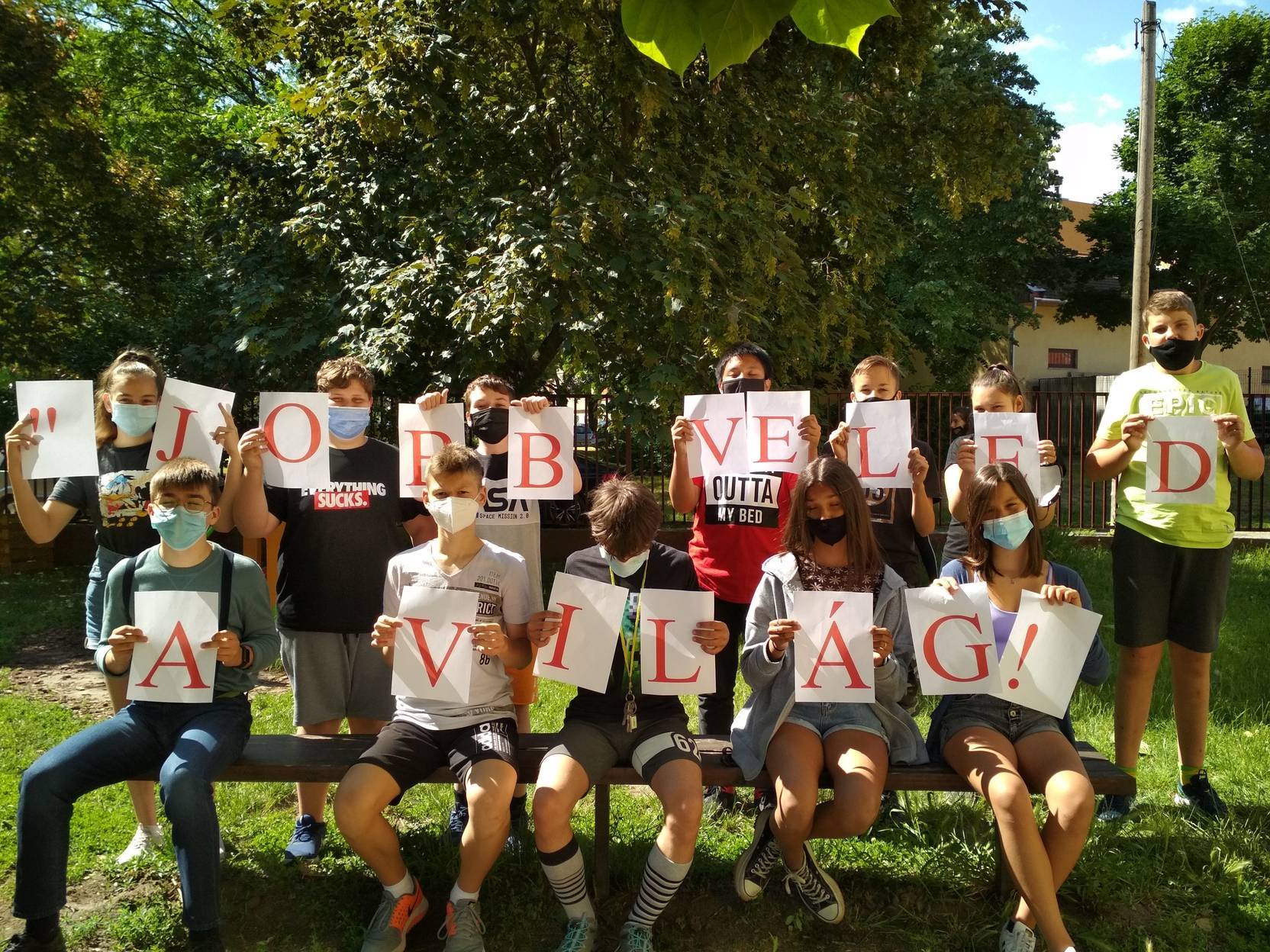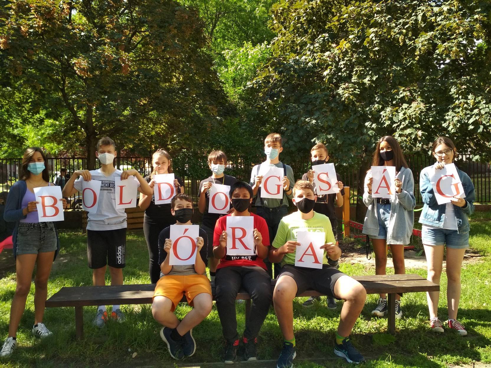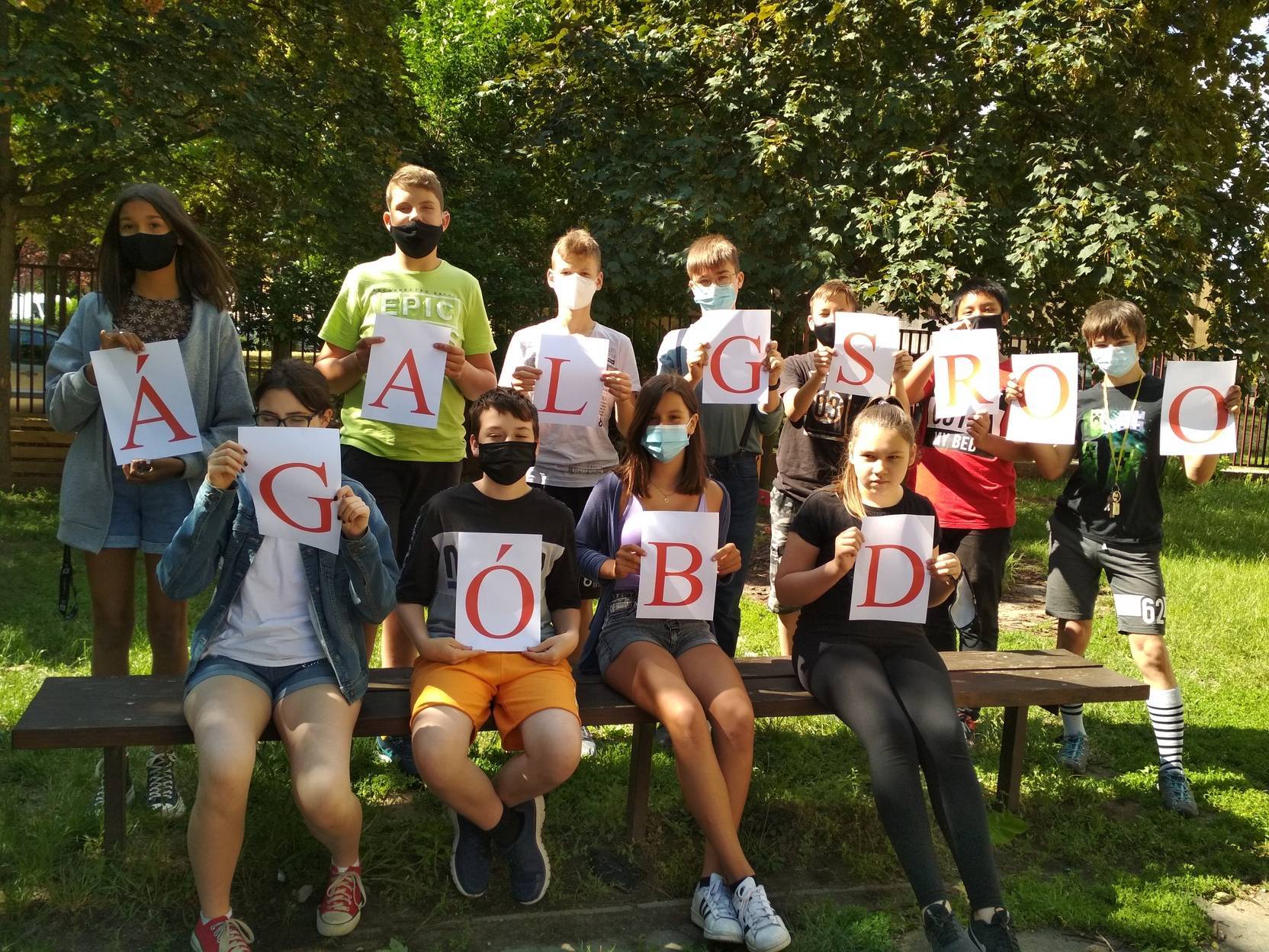 A 7.a osztállyal – kicsit már a szabadság szelében, az udvaron – 2 csoportban versenyezve összegyűjtöttük a boldogságórák témáit. Befejezésül az összekevert betűkből a tanulók kirakták az évet lezáró, de a nyári szünetre is elkísérő 2 üzenetet.