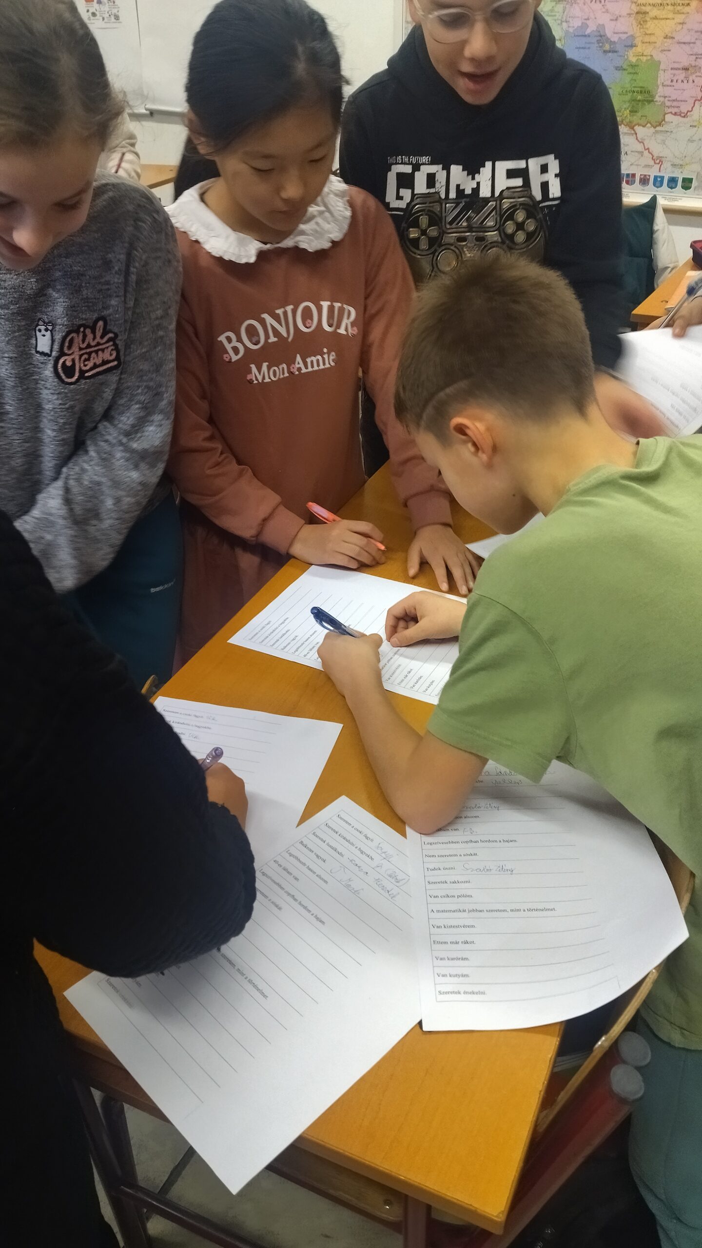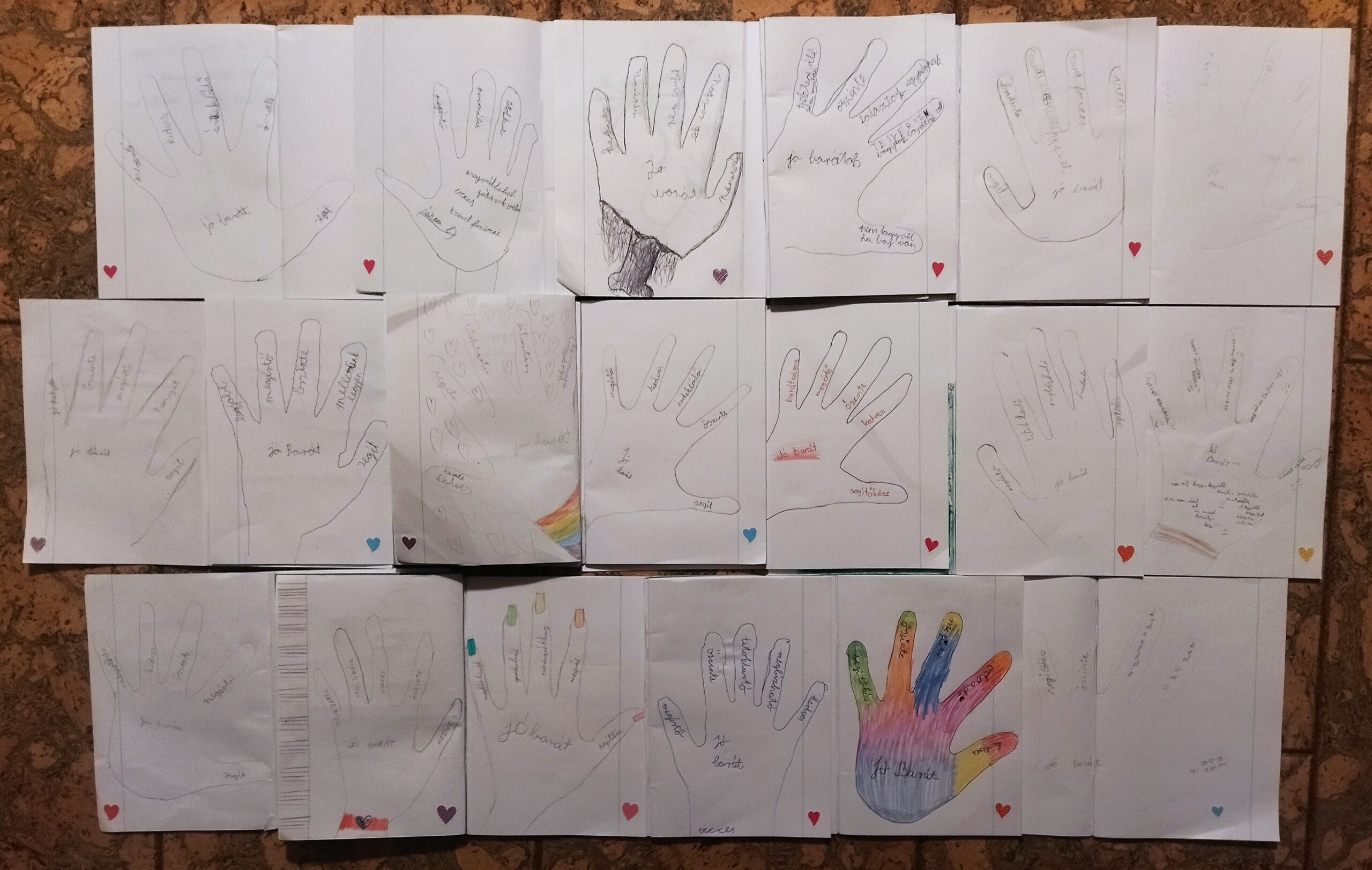 Az ember társas lény. Beszélgettünk a társas kapcsolatok sokféleségéről, fontosságáról. Kiemelten foglalkoztunk a barátsággal. Összegyűjtöttük a jó barát tulajdonságait és egy tenyér öt ujjába személyenként az öt legfontosabbat le is jegyeztük. A „Mennyire ismeritek egymást?” aláírós játék mindenkinek nagyon tetszett. Néhány rövid videót is megnéztünk ebben a témában, a tanulságokat megfogalmaztuk. Többször meghallgattuk és énekeltük Bagdi Bella dalát, a „Jobb Veled a világ”-ot.