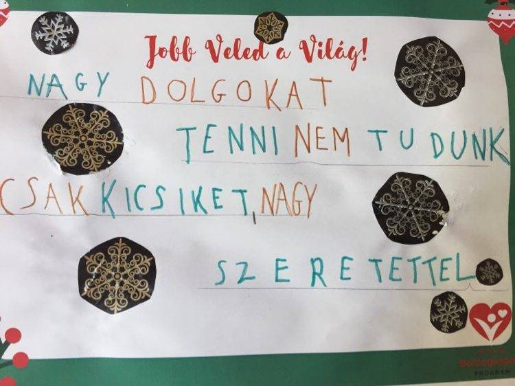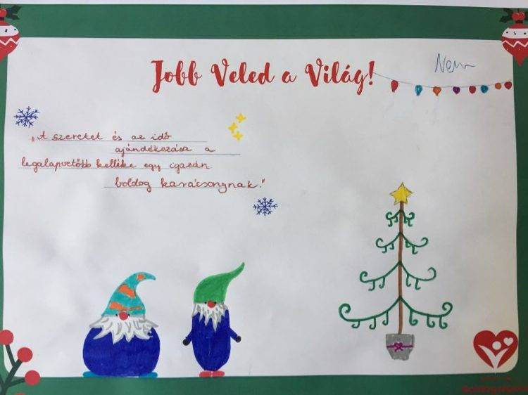 A foglalkozáson a gyerekek elkészítették saját képeslapjaikat. Közösen kiválogattuk a legszebbeket, melyeket egy kis karácsonyi dekorációval kitettünk az iskola faliújságjára, ezzel kívánva Boldog Karácsonyt minden diákunknak, tanárunknak, iskolai dolgozónknak.