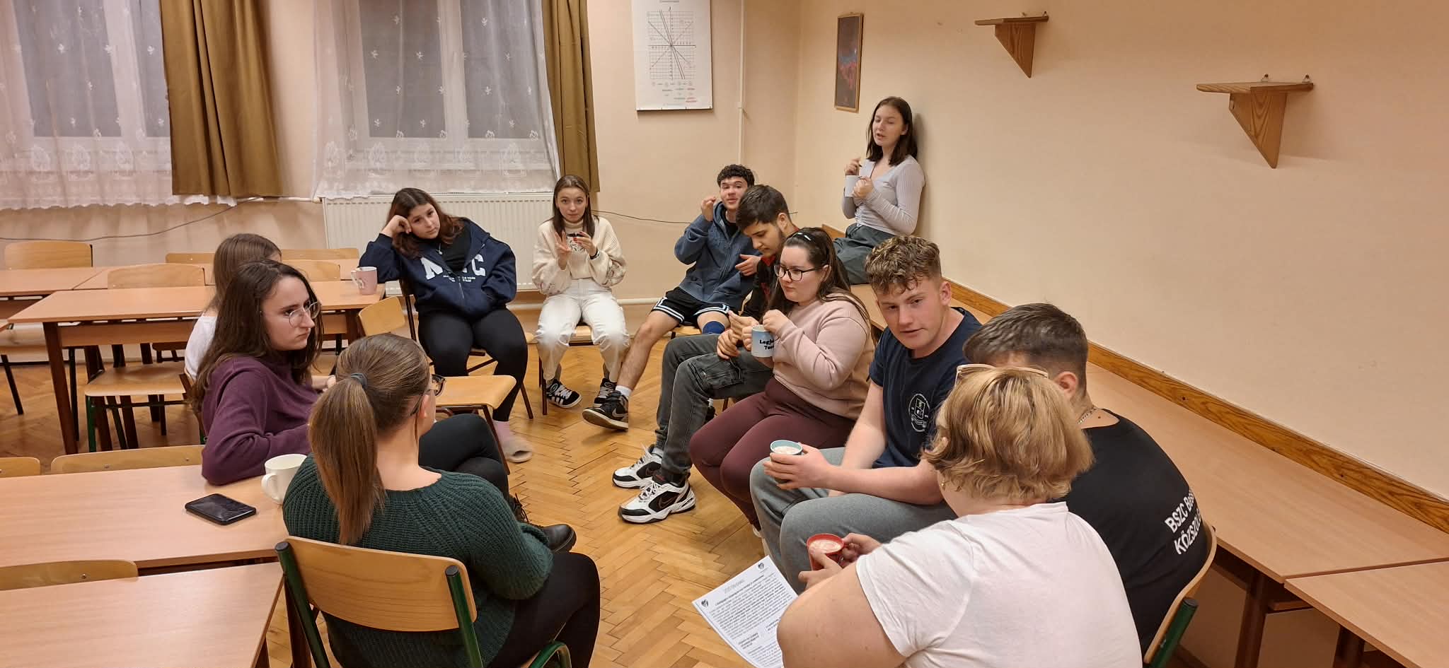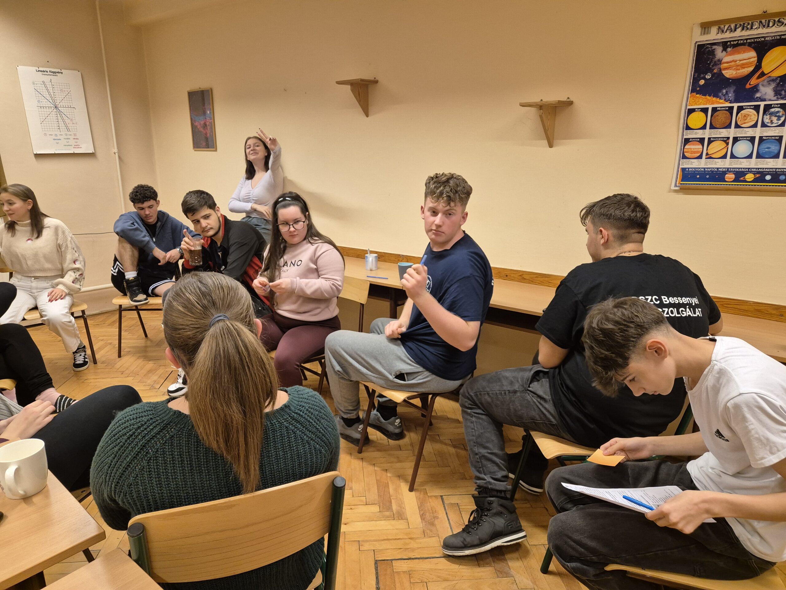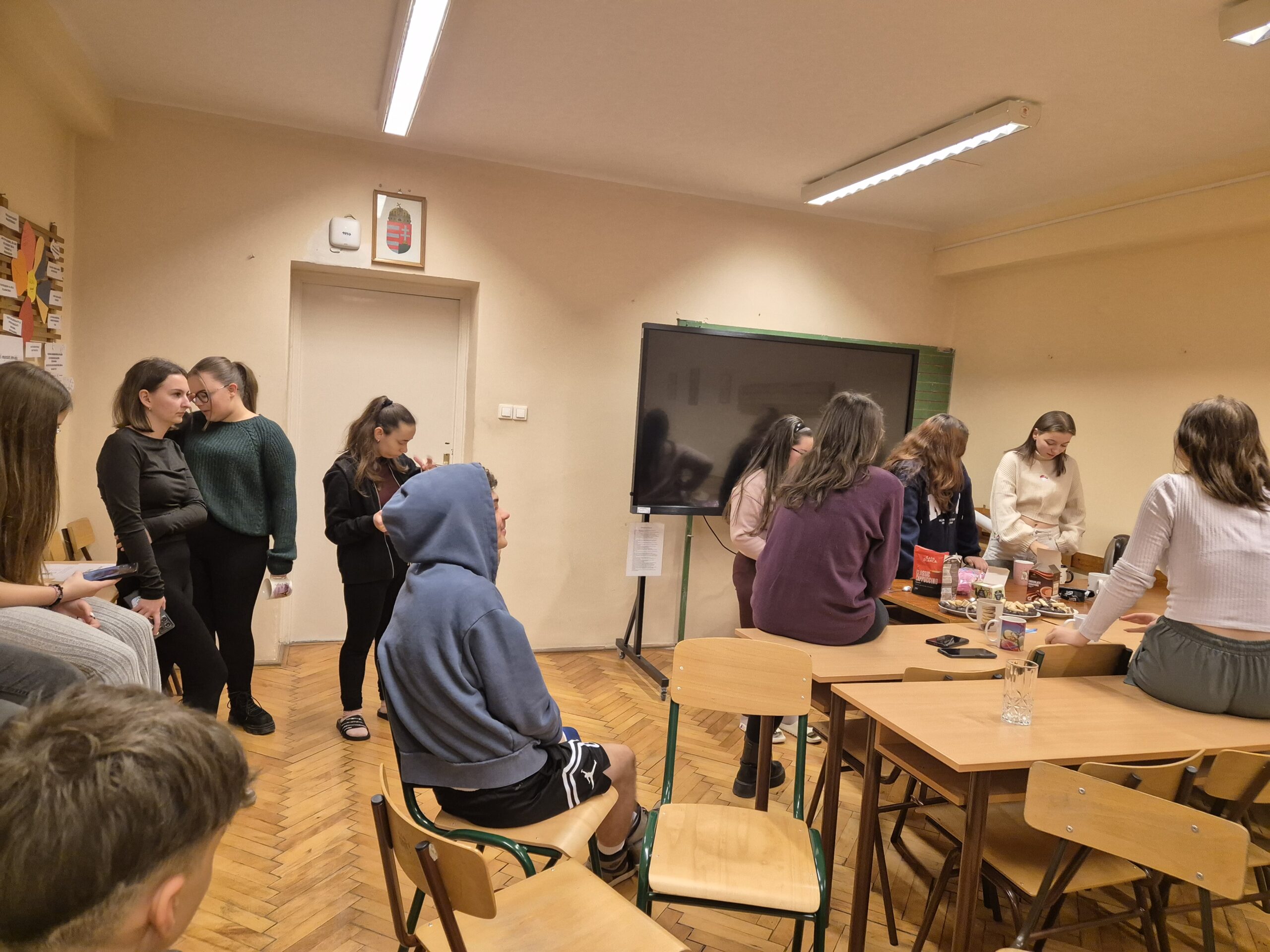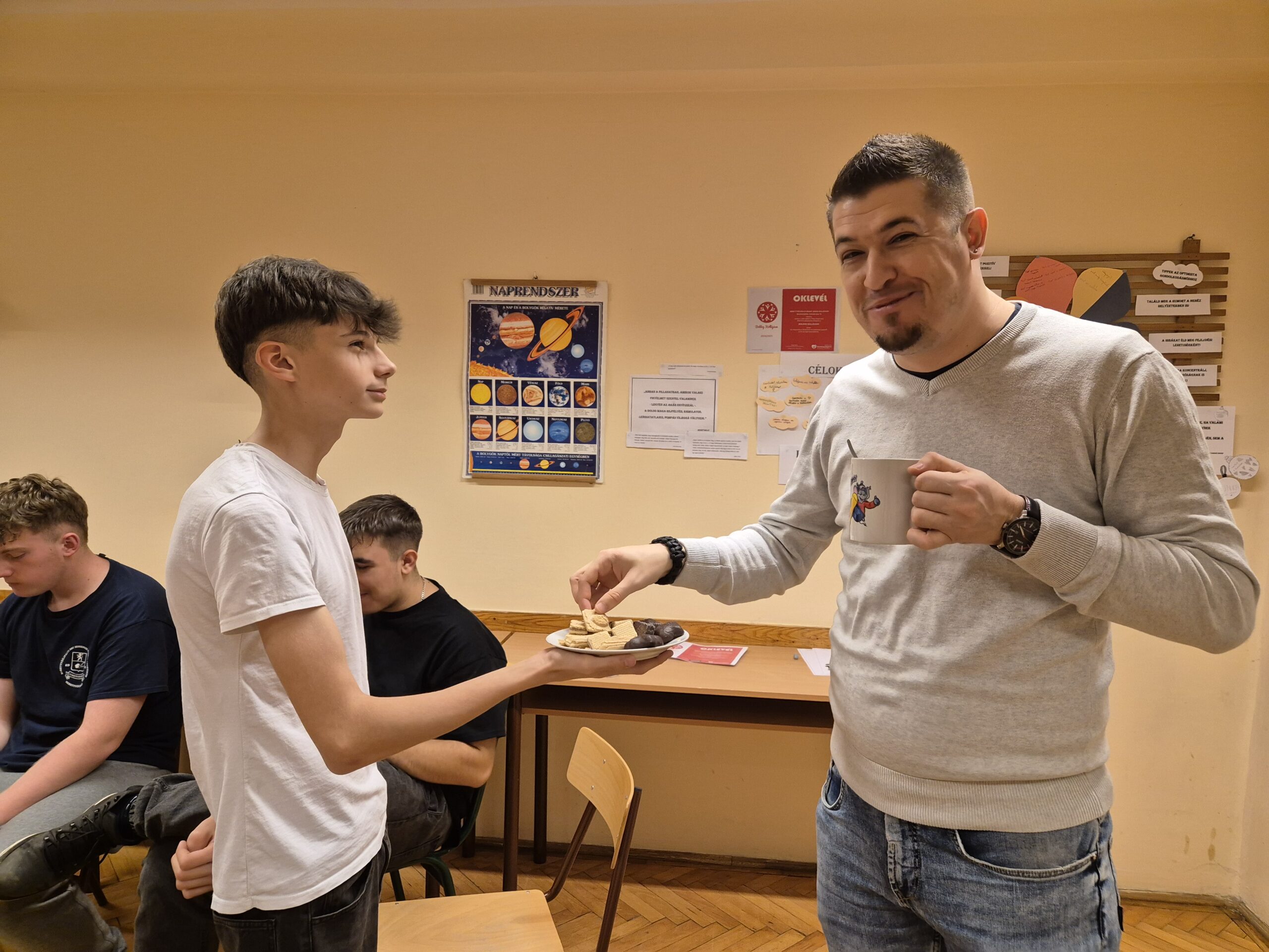 A decemberi Boldogságóra középpontjában a boldogító jócselekedetek álltak, amelyek különösen jól illeszkednek az adventi időszak üzenetéhez. A foglalkozás elején közösen beszélgettünk a jócselekedetek jelentőségéről, azok lelki és közösségi hatásairól, valamint arról, hogy az adás öröme miként járul hozzá a személyes jólléthez és az összetartozás érzésének erősödéséhez. Az órán feldolgoztuk a korábbi Boldogságóra keretében megvalósult „Titkos angyal” projekt tapasztalatait is. A diákok két kedves cselekedetet tettek annak a személynek, akit „kihúztak”, anélkül, hogy felfedték volna kilétüket. A megosztások során kiderült, hogy volt, aki leleplezte az angyalát, mások pedig csak utólag csodálkoztak rá, hogy a kedvességek egy tudatos projekt részei voltak. Számos vicces és megható történet került elő, sok közös nevetéssel. Az advent első hetében megtartott foglalkozás során minden résztvevő írt egy pozitív üzenetet tartalmazó, színes címkét, amelyet az óra után névtelenül helyezett el a kollégium valamely pontján, hogy feldobja egy társa napját. A közös alkalmat finom falatokkal, forró csokoládéval és teával kezdtük. Öröm volt, hogy korábbi Boldogságórás diákjaink és betérő pedagógusok is részesei lettek ennek a meghitt, közösségépítő élménynek.