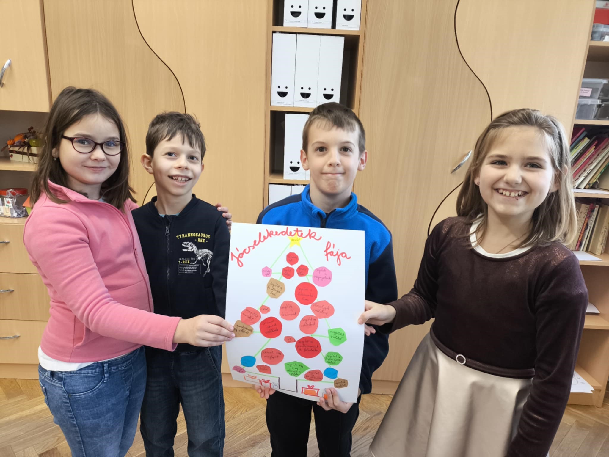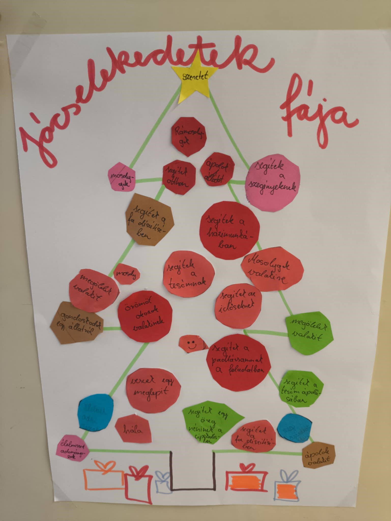Boldogságórán a jócselekdetekről beszélgettünk, majd pedig feldíszítettünk egy karácsonyfát a díszekre írt jócselekedeteinkkel. Tetteinkkel a hónap folyamán a jó cselekedeteket erősítettük egymásban.