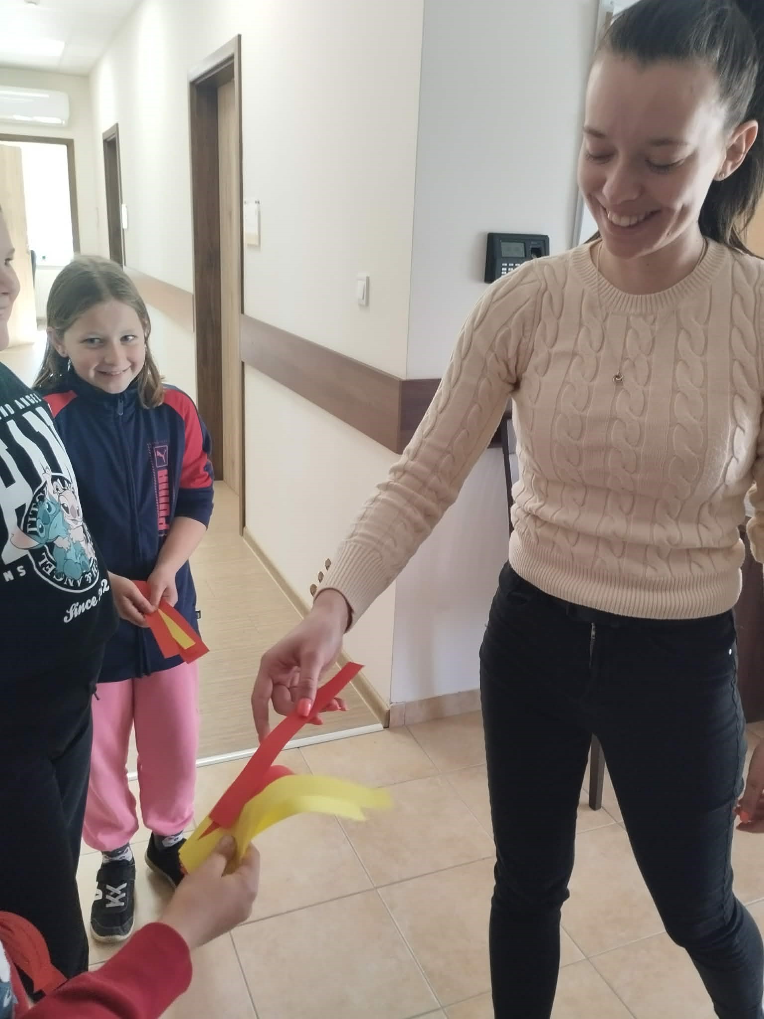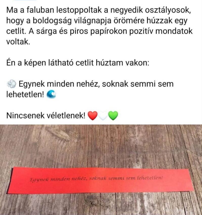Mai napon, a Boldogság Világnapján egész napon keresztül, minden szünetben programok voltak iskolánkban. Ezen felül az osztályunk „jókívánság üzeneteket” készített, amit a nap folyamán kiosztottunk. Mivel az iskolában voltak kitűzött kedves üzenetek, így elindultunk kis falunkban és ott osztogattuk jó kívánságainkat, öleléseinket. Bementünk az élelmiszerboltokba, az óvodába, a gyógyszertárba, a könyvtárba, a Polgármesteri Hivatalba, sőt az utcán dolgozó közfoglalkoztatottak is kaptak az üzeneteinkből. Sok-sok embernek csaltunk ma mosolyt az arcára és így mi is egész nap mosolyogtunk.