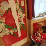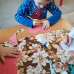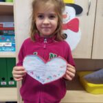 Havi boldogóránk témája a jó cselekedetek gyakorlása volt. Az órát egy relaxációs gyakorlattal kezdtük, amikor is egy képzeletbeli kismadarat melengettünk fel kezünkkel. Aztán felidéztük Az okoska botocska c., mesét és kitaláltunk új megoldásokat a mese története mentén, milyen módon tudta volna még segíteni a sün a nyulat. Megkérdeztem a gyerekeket, hogy milyen jó cselekedetekkel segítik otthon szüleiiket, vagy éppen milyen jó dolgokat tehetnek az óvodában társaiknak, hogyan segíthetik egymást. Az otthoni segítségadás leginkább az „együtt főzök anyával, segítek neki sütni” -re terjedt, és arra a kérdésre, hogy: megleped-e anyát azzal, hogy elpakolod a játékaidat?” – már kevés igenlő választ kaptam. De nem is ez a lényeg, hanem hogy azt megérezték, hogy amikor jót tesznek valakivel, és látják a másik örömét, az mindkettőjükét pozitív érzésekkel tölt el. A karácsonyra készülődve elkészítettük saját adventi koszorúnkat, mely abból állt, hogy a gyerekek lerajzolták magukat és ezeket az emberkéket ragasztottam a zöld karton koszorúra. Otthonra is vittek papír szíveket, melyek az otthoni jócselekedeteiket tartalmazzák.
