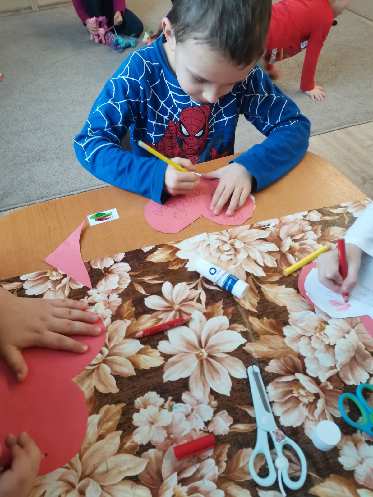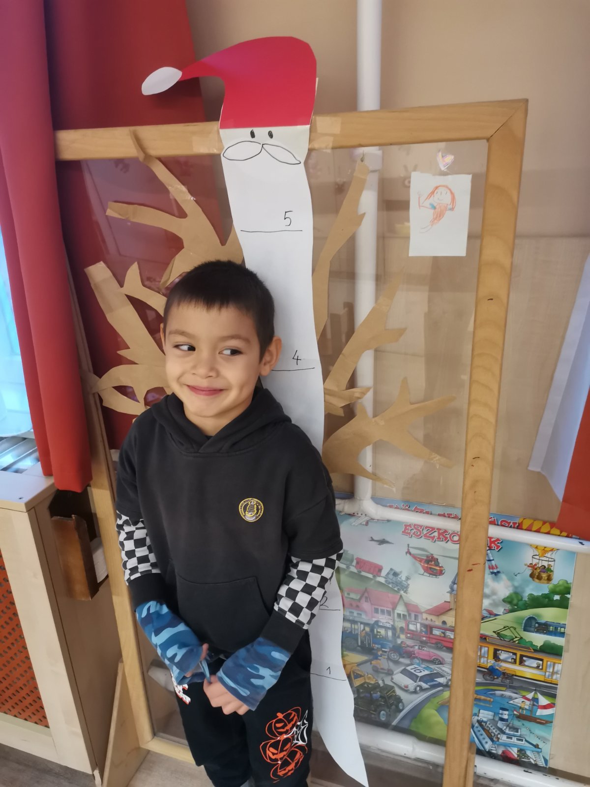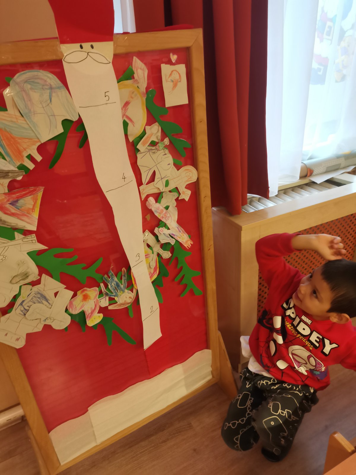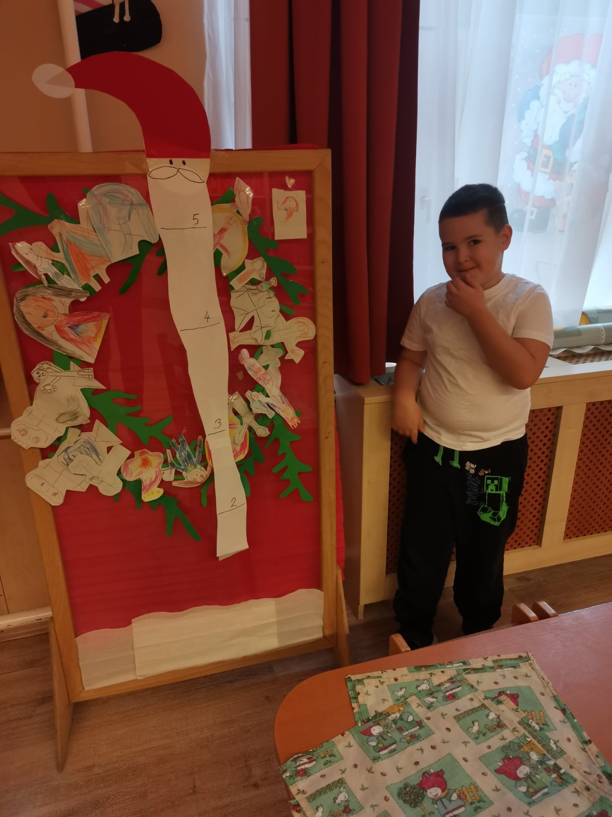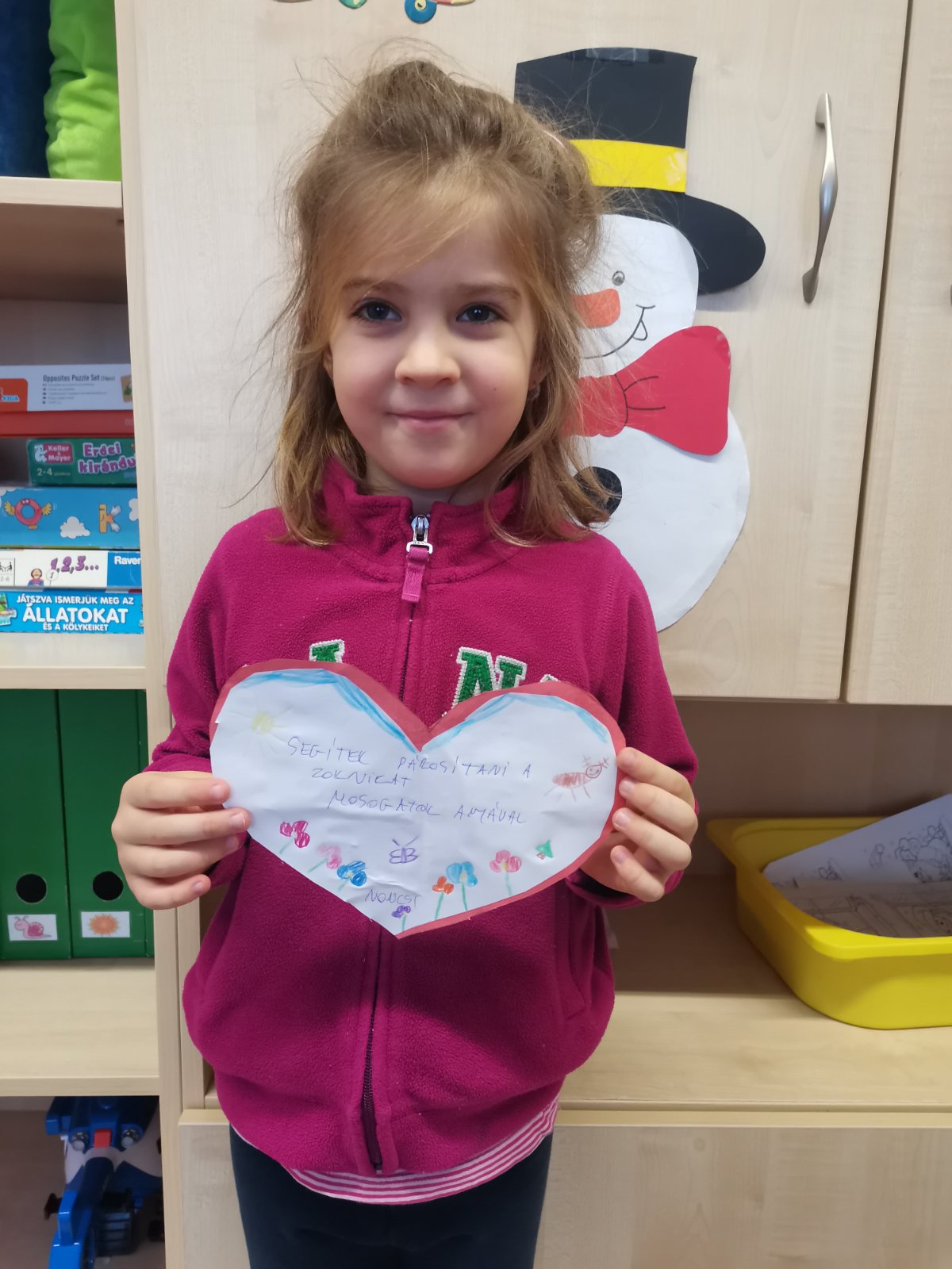 Havi boldogóránk témája a jó cselekedetek gyakorlása volt. Az órát egy relaxációs gyakorlattal kezdtük, amikor is egy képzeletbeli kismadarat melengettünk fel kezünkkel. Aztán felidéztük Az okoska botocska c., mesét és kitaláltunk új megoldásokat a mese története mentén, milyen módon tudta volna még segíteni a sün a nyulat. Megkérdeztem a gyerekeket, hogy milyen jó cselekedetekkel segítik otthon szüleiiket, vagy éppen milyen jó dolgokat tehetnek az óvodában társaiknak, hogyan segíthetik egymást. Az otthoni segítségadás leginkább az „együtt főzök anyával, segítek neki sütni” -re terjedt, és arra a kérdésre, hogy: megleped-e anyát azzal, hogy elpakolod a játékaidat?” – már kevés igenlő választ kaptam. De nem is ez a lényeg, hanem hogy azt megérezték, hogy amikor jót tesznek valakivel, és látják a másik örömét, az mindkettőjükét pozitív érzésekkel tölt el. A karácsonyra készülődve elkészítettük saját adventi koszorúnkat, mely abból állt, hogy a gyerekek lerajzolták magukat és ezeket az emberkéket ragasztottam a zöld karton koszorúra. Otthonra is vittek papír szíveket, melyek az otthoni jócselekedeteiket tartalmazzák.