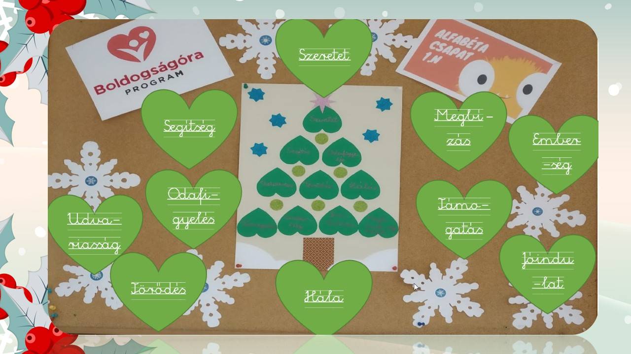 Ezeket próbáltuk egy szóba tömöríteni és ráírtuk egy-egy szívecskére, melyekből elkészítettük az osztály jóságfáját. Ezek után mindenki kapott egy karácsonyfadíszt, melyet annak a társának kellett elkészíteni, akinek a nevét kihúzta. A munka közben hallgatták a hónap dalát. Az ajándékok átadása után a megajándékozott társukat egész nap segíthették és apró meglepetésekkel kedveskedhettek nekik.
