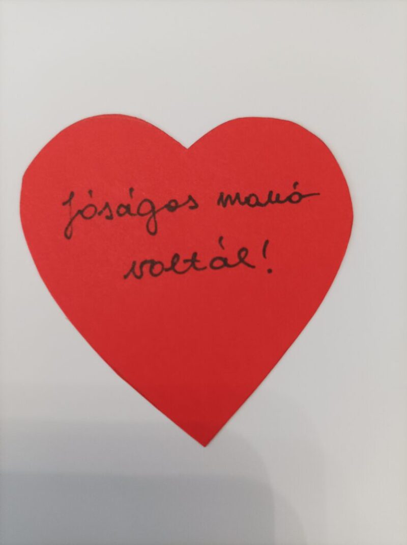 Jó cselekedetek gyakorlása témára a hála zenéjével hangolódtunk. A Szívem kertje című mese meghallgatása után beszélgettünk arról, hogy kivel mit tettek jót az óvodában és otthon is. Mit éreztek olyankor? Tudatosodott bennük, hogy jót tenni jó érzés, boldogító. Minden gyermek egy kis papírra lerajzolta a jelét, összehajtottuk és egymás jelét kihúztuk egy kosárból. Akinek a jelét húzták, annak lettek a „Jóságos manóik”, azzal kellett titokban jót tenni, kedveskedni, örömet okozni. A gyerekeknek volt idejük a figyelmességekre, majd elmondhatták, hogy kit húztak és milyen jót cselekedtek azzal a gyermekkel. Mindenkinek volt sikerélménye, az adás- és a kapás örömét meg tudták tapasztalni. Minden „Jóságos kismanó” kapott egy elismerő szívecskét ajándékba. A gyerekek egész héten nagy örömmel kedveskedtek egymásnak, igyekeztek jót cselekedni. Szituációs játékokat játszottunk, ami közben megtapasztalhatták az adás és a figyelmesség boldogító hatását. Ösztönöztem őket, hogy otthon is folytassák a jó cselekedeteket a családtagjaikkal, ismerőseikkel.