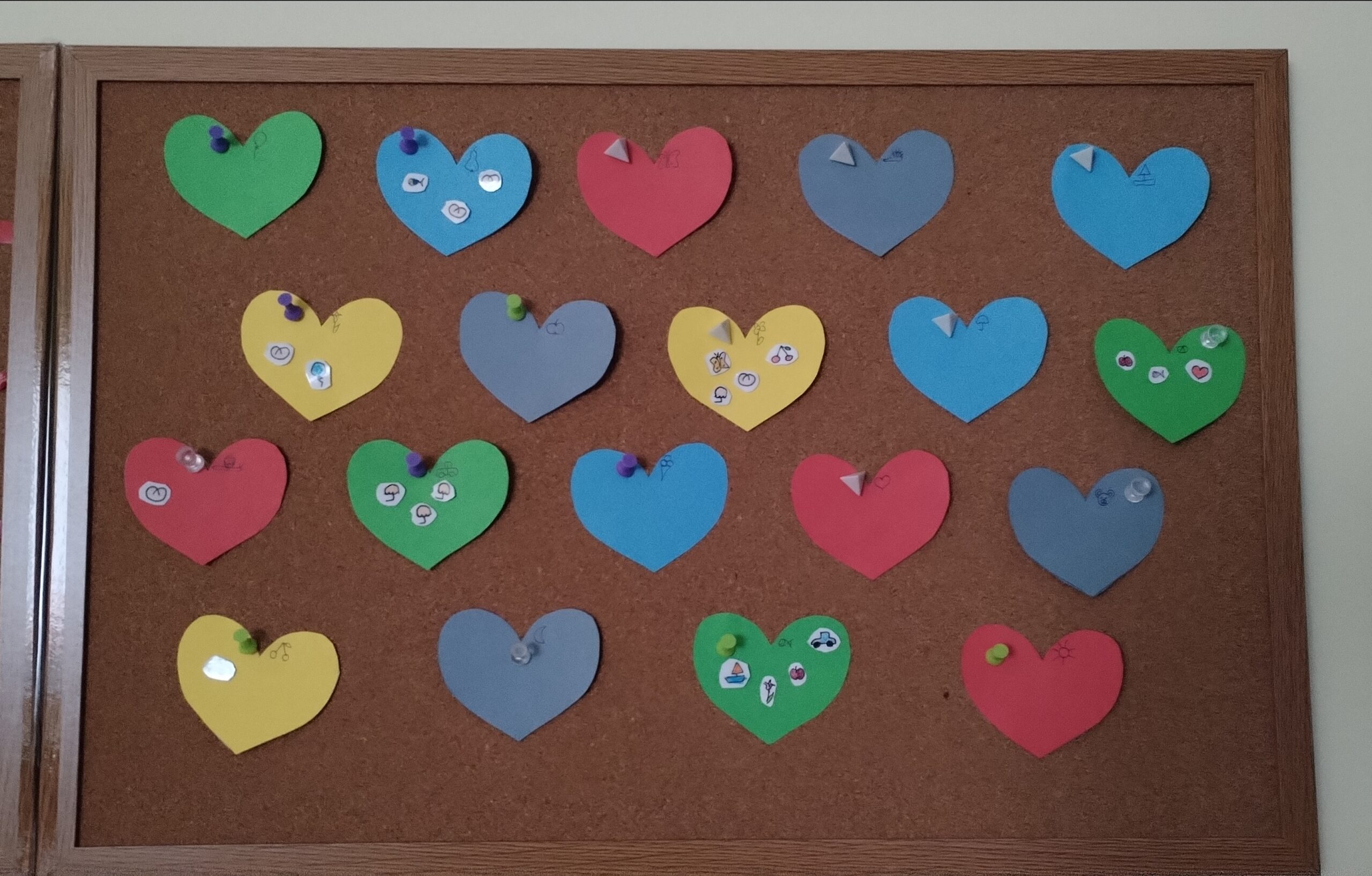 A parafa táblán mindenki kapott egy szívet a saját jelével. Ha valami jót tett a társáért, akkor annak a jelét odaragasztottuk a szívére. Aki 3 gyereket boldogabbá tett, az elnyerte a „Jóságos” címet a csoportban. Ez nagyon nehéz feladat volt mindenkinek, de néhányuknak sikerül elnyerni a címet, és ők nagyon büszkék voltak magukra, és a társaik is rájuk.
