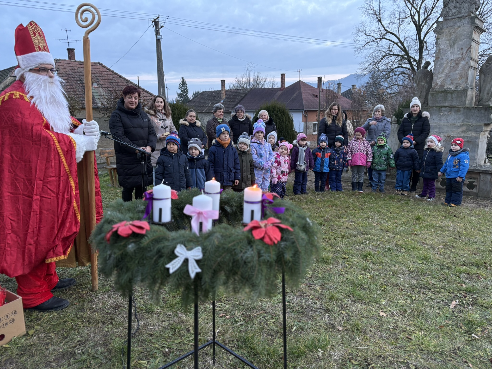 Hagyomány falunkban, hogy a Templom téren is meggyújtjuk közösen a falu lakosságával az adventi koszorún a gyertyákat, minden alkalommal kis műsor keretében. Az óvodások második gyertyagyújtáson köszöntötték Szent Miklóst versekkel, dalokkal. Ezzel örömöt, boldogságot adva a falu ünneplő lakóinak, s magunknak is.