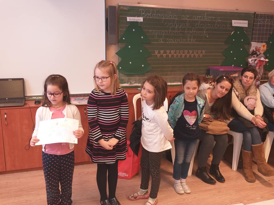 2018.december 21-én osztálykeretben BOLDOGSÁGÓRÁT tartottam a szülők, nagyszülők számára! Az adventi időszakban valamennyien elhatározták a gyerekek, hogy egy jó cselekedettel készülnek a karácsonyra! Rajzot készítettek, melyek kikerültek a boldogító jó-cselekedetek karácsonyfájára, fehér gömbként világítanak, ezzel is meghitté téve a karácsonyi ráhangolódást! A szülők betekintést kaptak az év elején bevezetett programról,együtt örültünk. Sor került a gyerekek által elkészített ajándékok átadására is!A szülők nagyon támogatják munkánkat, örülnek, hogy mind érzelmi nevelésük, mind lelki fejlődésük ezáltal erősödik.A hónap dalait együtt énekeltük.A boldog, meghitt karácsony remélhetően ránk talál!A vágyak elcsitulnak, a szívekbe nyugalom költözik!