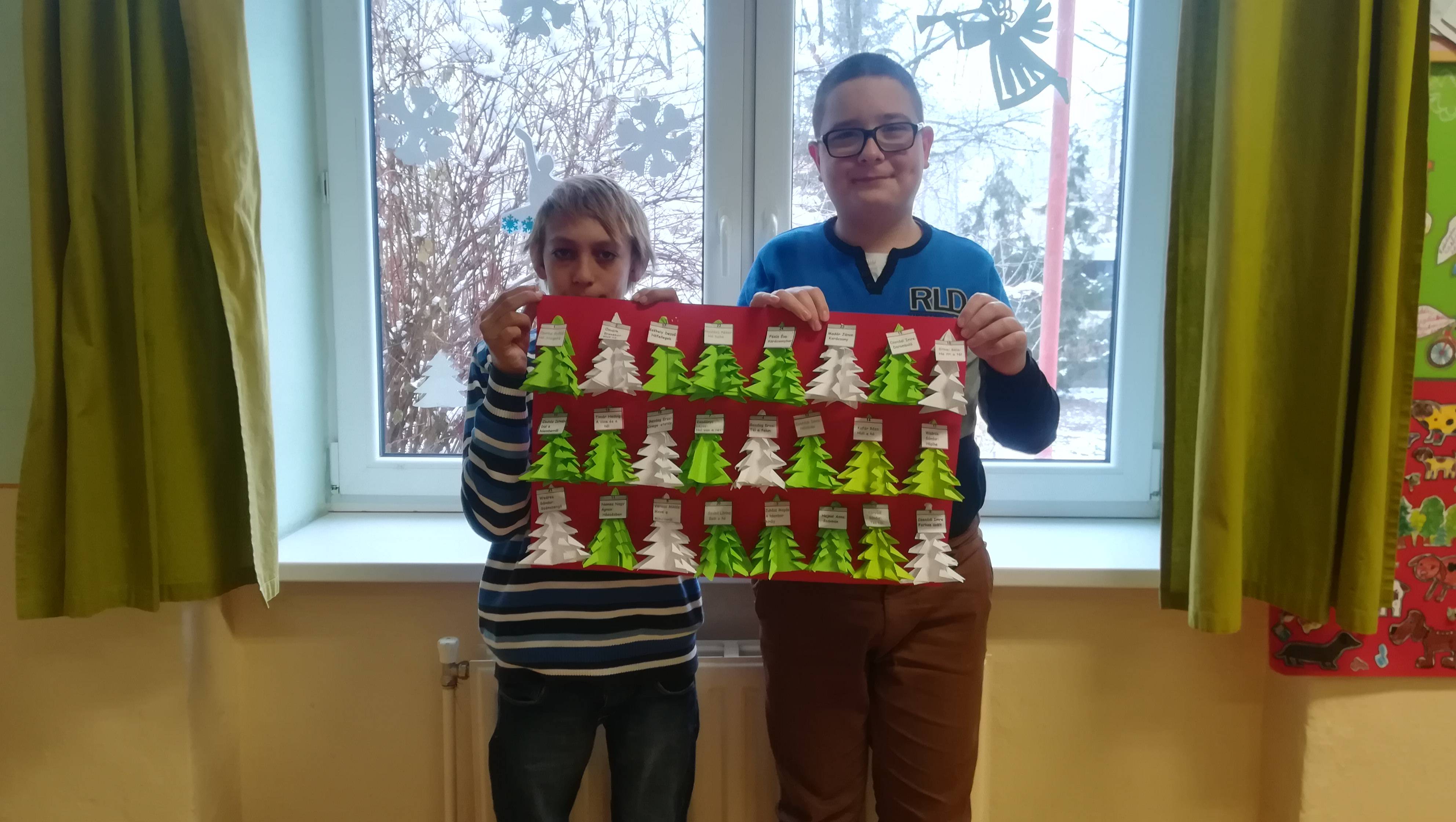 December a jócselekedetek hónapja. A gyerekek nagyon szerették ezt a témát, mert tudják, adni jó! Közösen megbeszéltük, hogy mi, minden nap megajándékozzuk egymást egy – egy csodás verssel, melynek tematikája : karácsony, tél, Mikulás, havazás….stb. Gyűjtöttük a szebbnél szebb verseket, (Osváth Erzsébet:Első hó, Veress Miklós:Mese a Mikulásról, Weöres Sándor:Hópihe,Juhász Magda:A hóember király, Madár János:Karácsony…) és szeretettel ajándékoztuk meg egymást. A versek címét naponta felírtuk kis lapokra, melyek aztán felkerültek az általunk hajtogatott fenyőfákra. Így készült el a mi karácsonyváró jótett-naptárunk. Gyakran hallgattuk a hónap dalát Bagdi Bellától. Készítettünk szivecske nyakláncot, majd a karácsonyfánkat körbeállva énekeltük a csodás dalt. (Állatbarátok csoportja, Turančík Katalin-Boldogságóra-oktató)