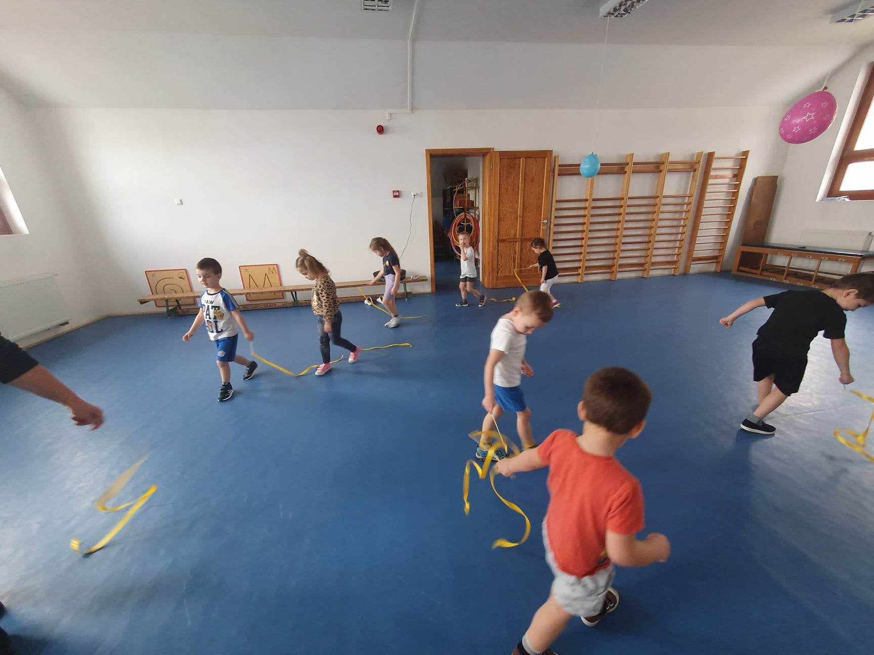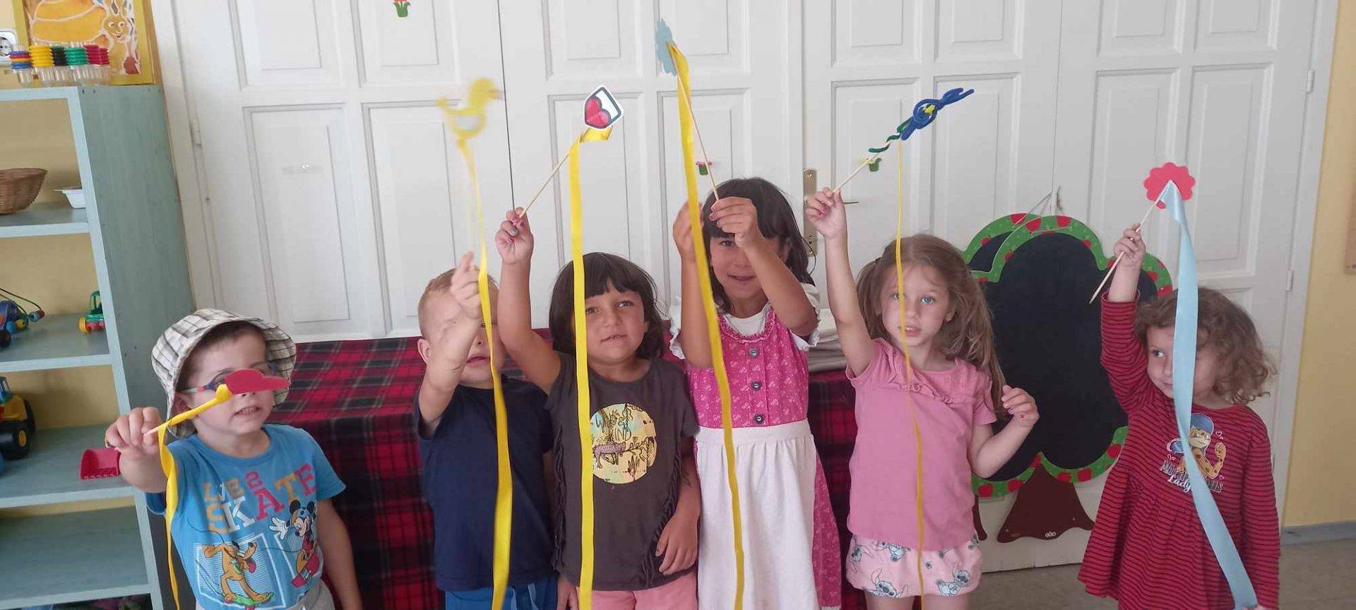 Mindenki készített egy varázspálcát, melyre szalagot erősítettünk. Az ajánlástól eltérően, nem tekertük fel a botra a szalagot, hanem hagytuk szabadon lebegni.