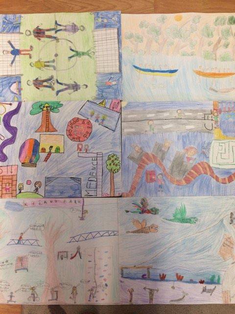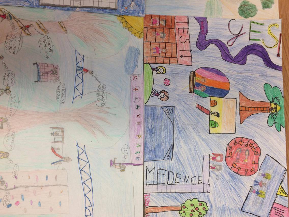Páros munkával végzett rajzok készítése 4. osztályban. Képzeletbeli kalandparkok rajzolása, színezése. A fantáziáknak határt nem szabva.
