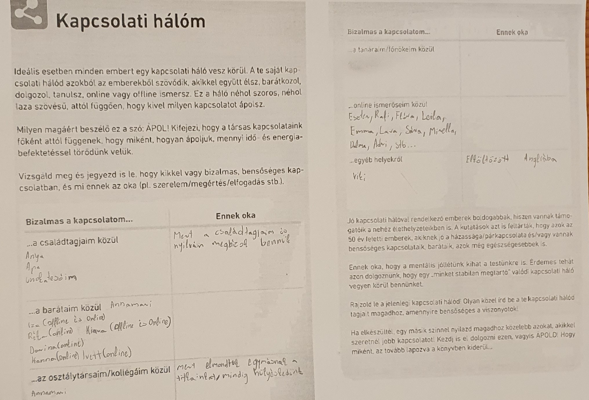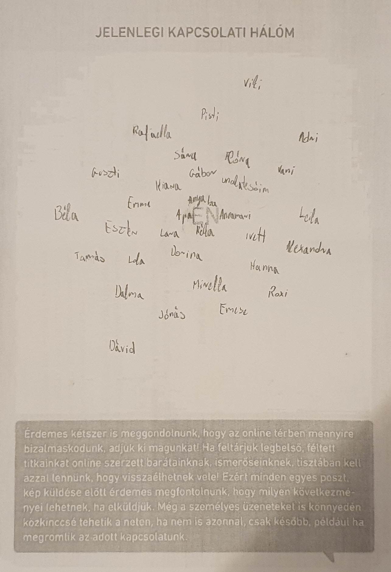Második alkalommal egyénileg megvizsgálták a saját kapcsolataikat: kikkel és miért állnak bizalmas, bensőséges kapcsolatban vagy a környezetükben kikkel lazább a kapcsolatuk (családtagok, barátok, osztálytársak, tanárok, online ismerősök közül). Ezt követően lerajzolták a jelenlegi kapcsolati hálójukat.