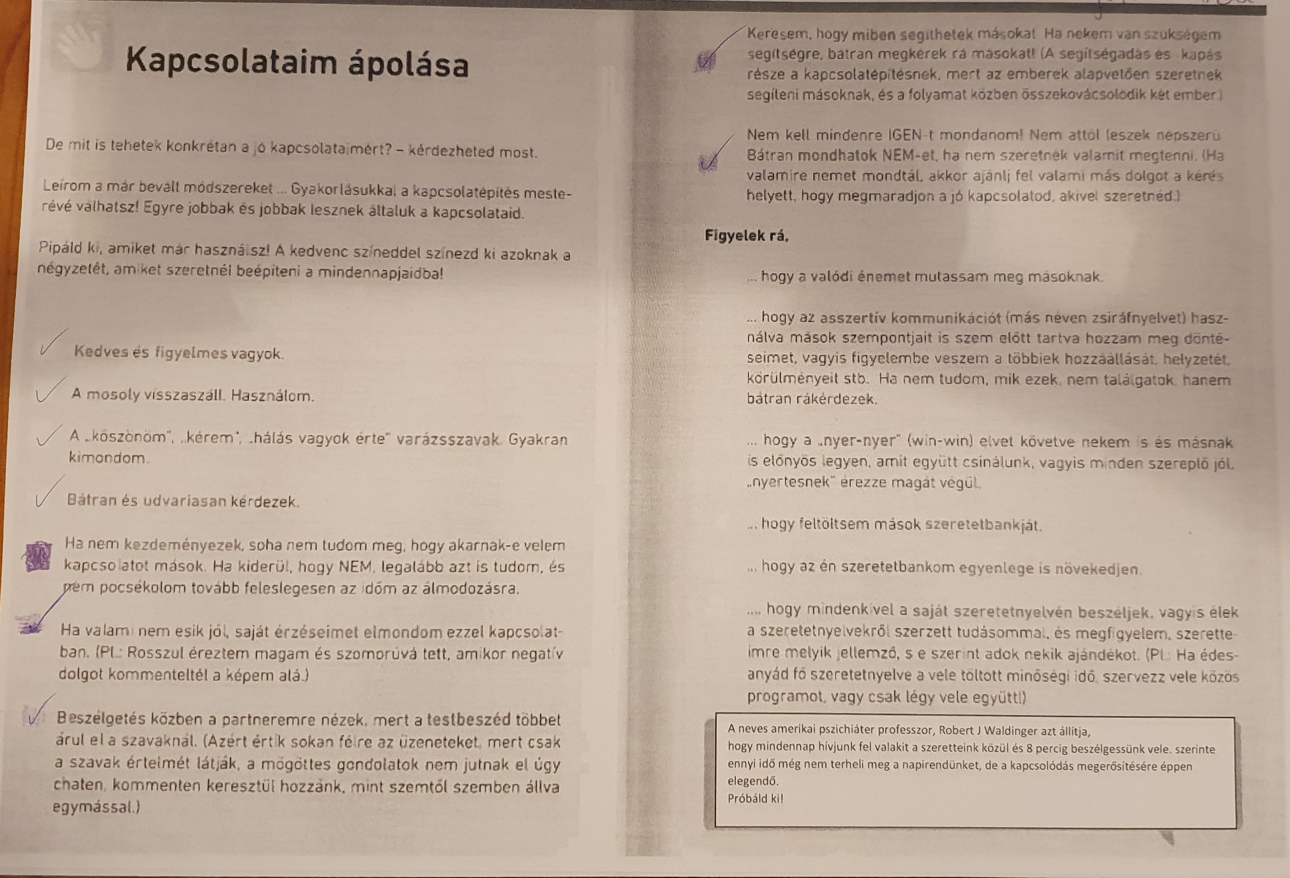 Mit tehetnek a jó kapcsolatukért? Hogyan válhatnak a kapcsolatépítés mesterévé? Ehhez kaptak egy kis segítséget egy feladatlapon, melyen ki kellett pipálniuk azokat a módszereket, melyeket már alkalmaznak és színezéssel megjelölni azokat, amelyeket szeretnének beépíteni a mindennapjaikba. Nagy örömömmel hallottam, hogy a legtöbben a 9 módszer közül sokat, és csak páran 4 vagy 5 módszert alkalmaznak. Javasoltak egymásnak is módszereket pl. a varázsszavak használatának gyakorlását „kérem”, „köszönöm”, „hálás vagyok érte”. Kíváncsian várom, hogy egy hónap múlva – ha visszatérünk rá – a fogadalmakat ki tartotta be, hányan gyakorolták a módszertárukból hiányzók gyakorlását!