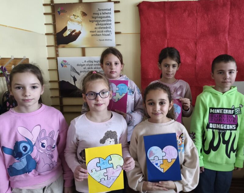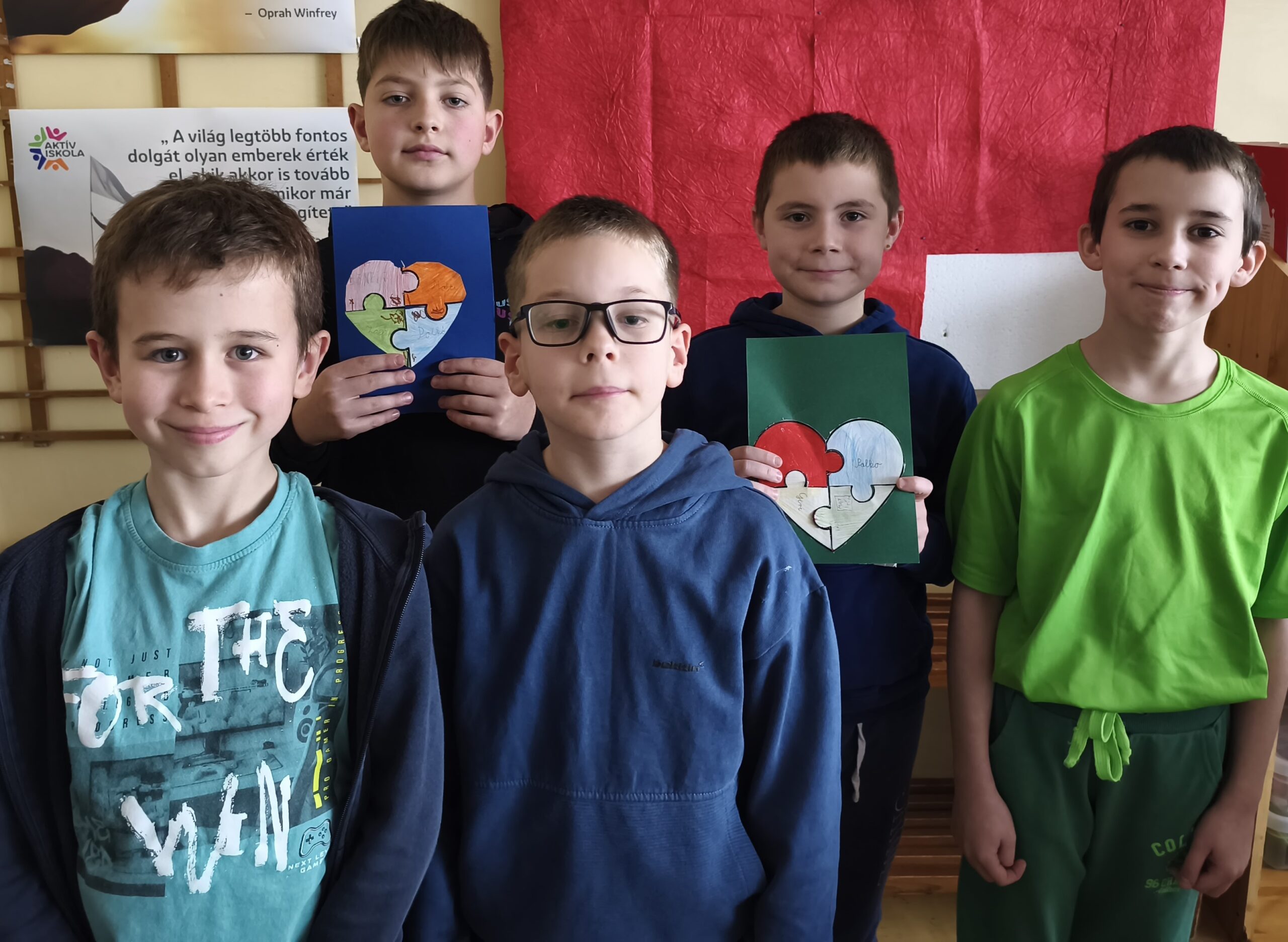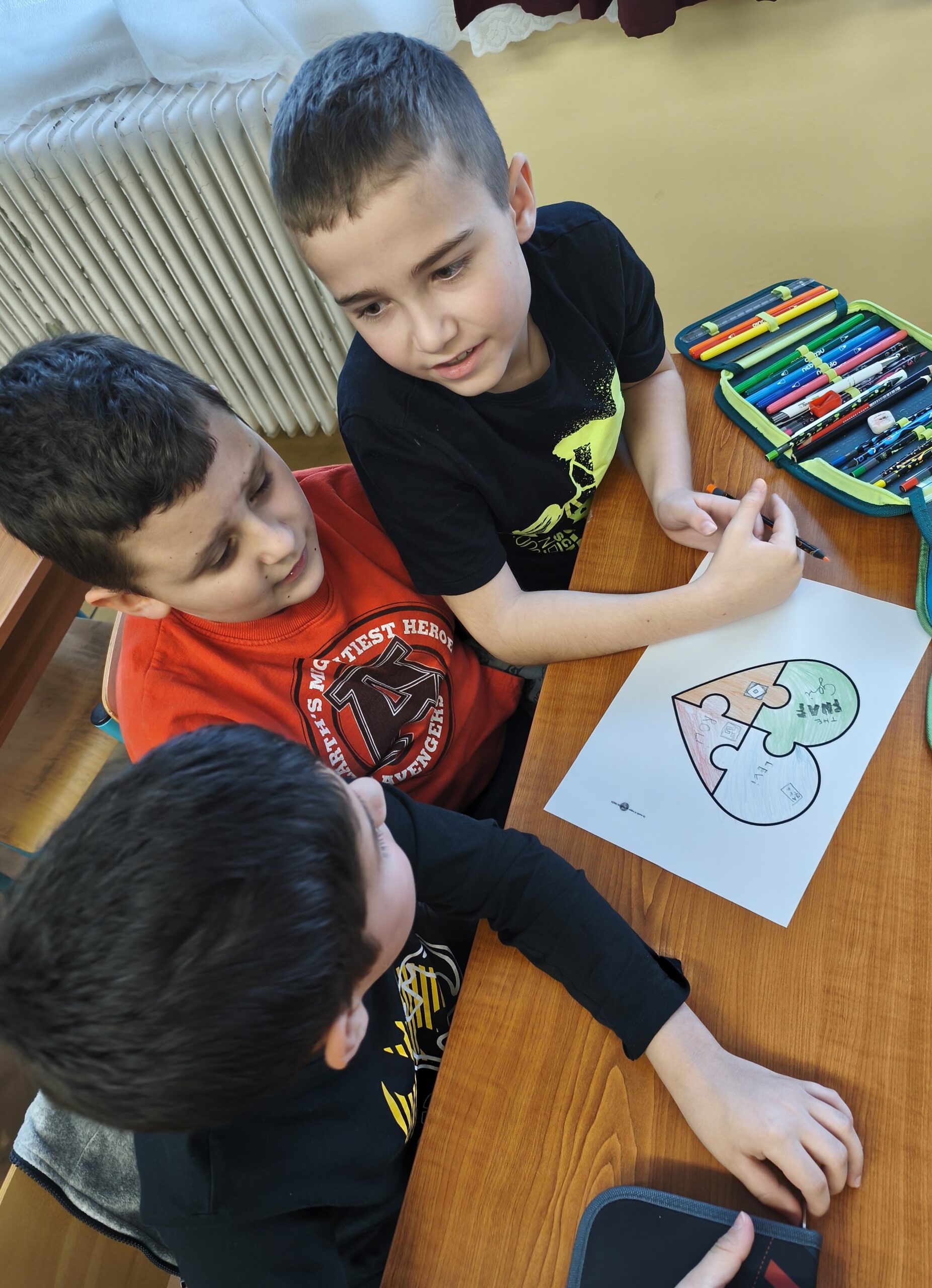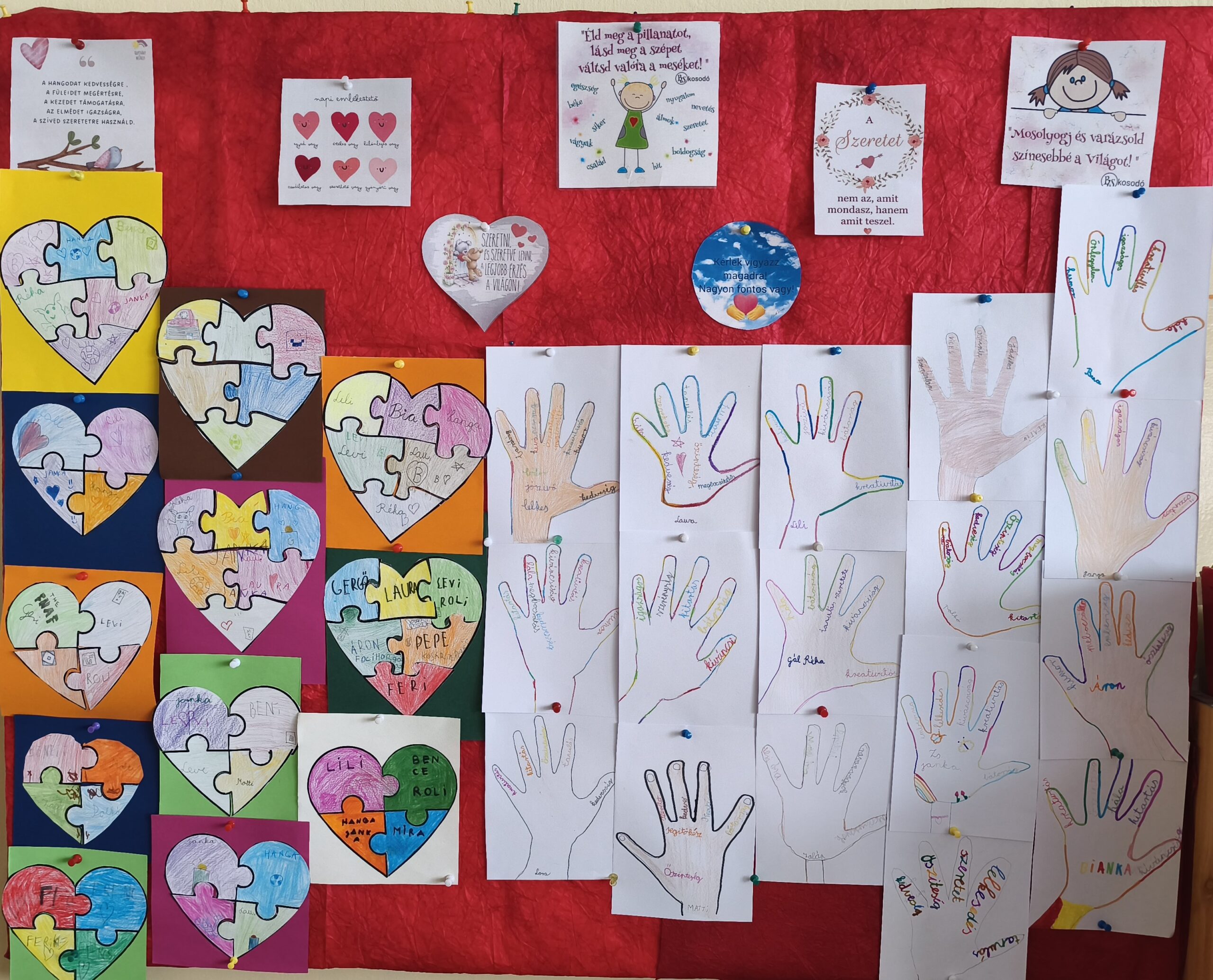 Bevezetésként megismertük Bori és Barni, a két kis babszem történetét, melyhez mindenki hozzáfűzte saját gondolatait. Csoportonként összeülve készítették el saját szív alakú puzzle képüket, melyben színekkel, kifejezésekkel, rajzokkal fejezték ki miért is fontosak egymásnak és mi tartja őket össze. Majd egy-egy tanuló kiült a többieknek háttal és meghallgatta erősségzuhanyként a társai dicséreteit, melyek az Ő erősségeit emelték ki. Nem volt gyermek, aki ne mosolyogva, jóleső érzéssel állt volna föl. Az osztályterem légköre is megváltozott, boldogok voltak, nem csak a dicsért gyermek, hanem a pozitív kifejezések, érzések által mindenki!
