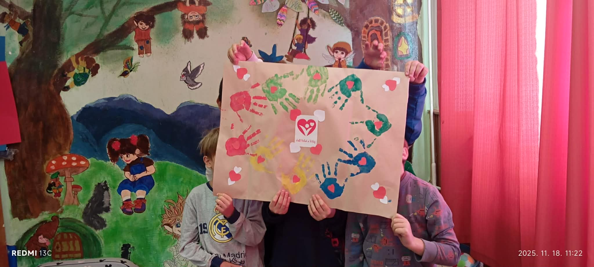 A tenyérlenyomatos „csodaszív” plakátunk elkészítése élményekkel teli színes pillanat volt számunkra. A “polipjátékunkat” most sem hagytuk ki a játékainkból. Szemmel látható volt, hogy a gyermekek egyre jobban figyelnek egymásra és együttműködve oldják meg a feladatot. Az óra zárásaként “Ellazulni, jaj de jó” zenés relaxáció lehetőséget adott lecsendesedésre és a jó hangulatban való búcsúzásra.