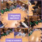 Az egymásra figyeléssel folytattuk a téma feldolgozását. Olyan ügyességi játékokat játszottunk, ahol nagyon kellett figyelni ahhoz, hogy meg tudjuk oldani a feladatot. Asztalnál ülve tenyerünkkel az asztalra csaptunk először sorban, majd keresztezve a kezünket (olyan érzés, mintha az előttünk lévő kéz lenne a miénk, a mi kezünk meg mintha nem akarna engedelmeskedni az akaratunknak), majd belevittünk még egy kis nehézséget, ahol a dupla ütésre megfordult az irány. Nagyon sokat nevettünk, miközben egyre jobban figyeltünk egymásra a közös siker érdekében.