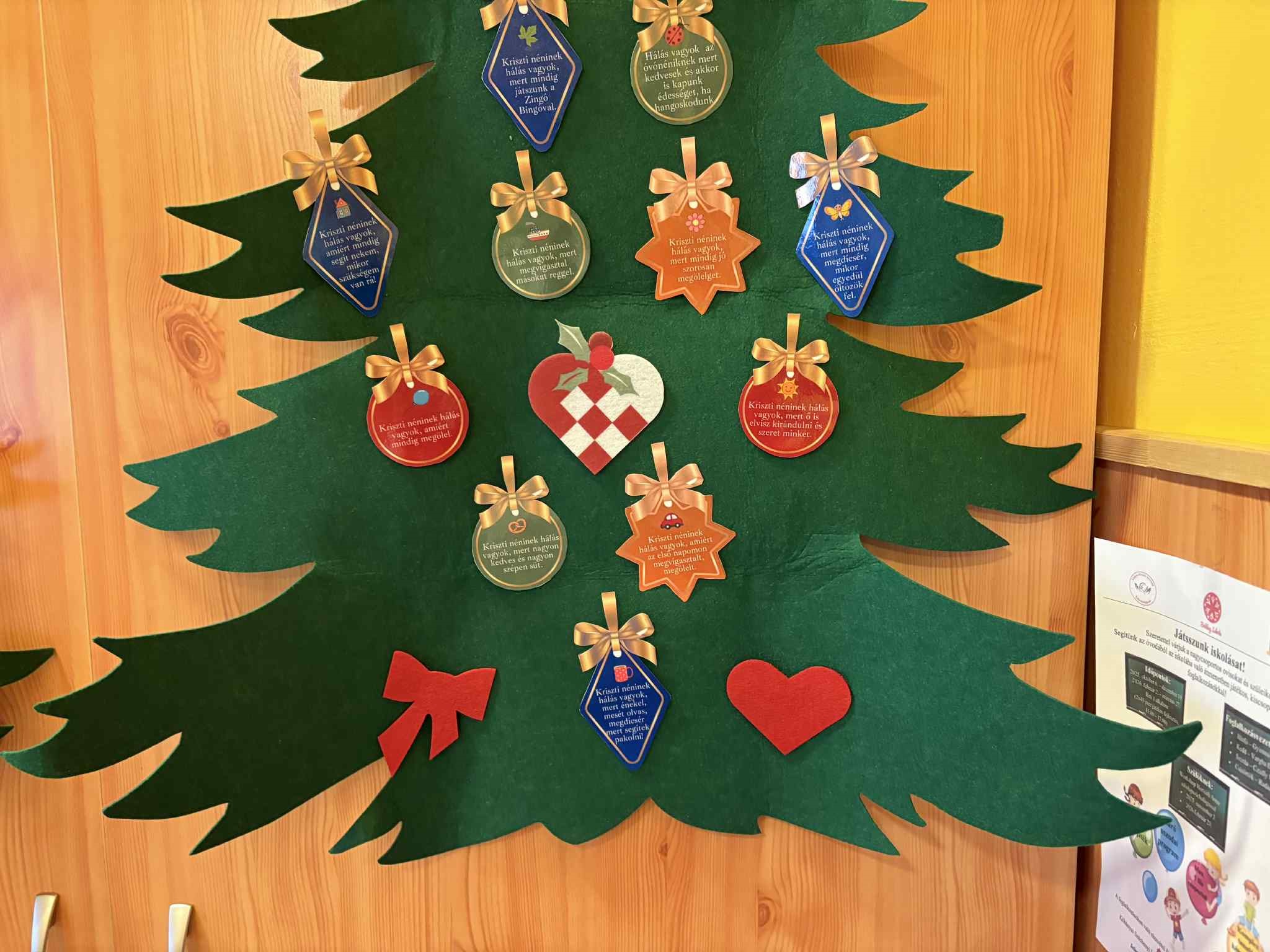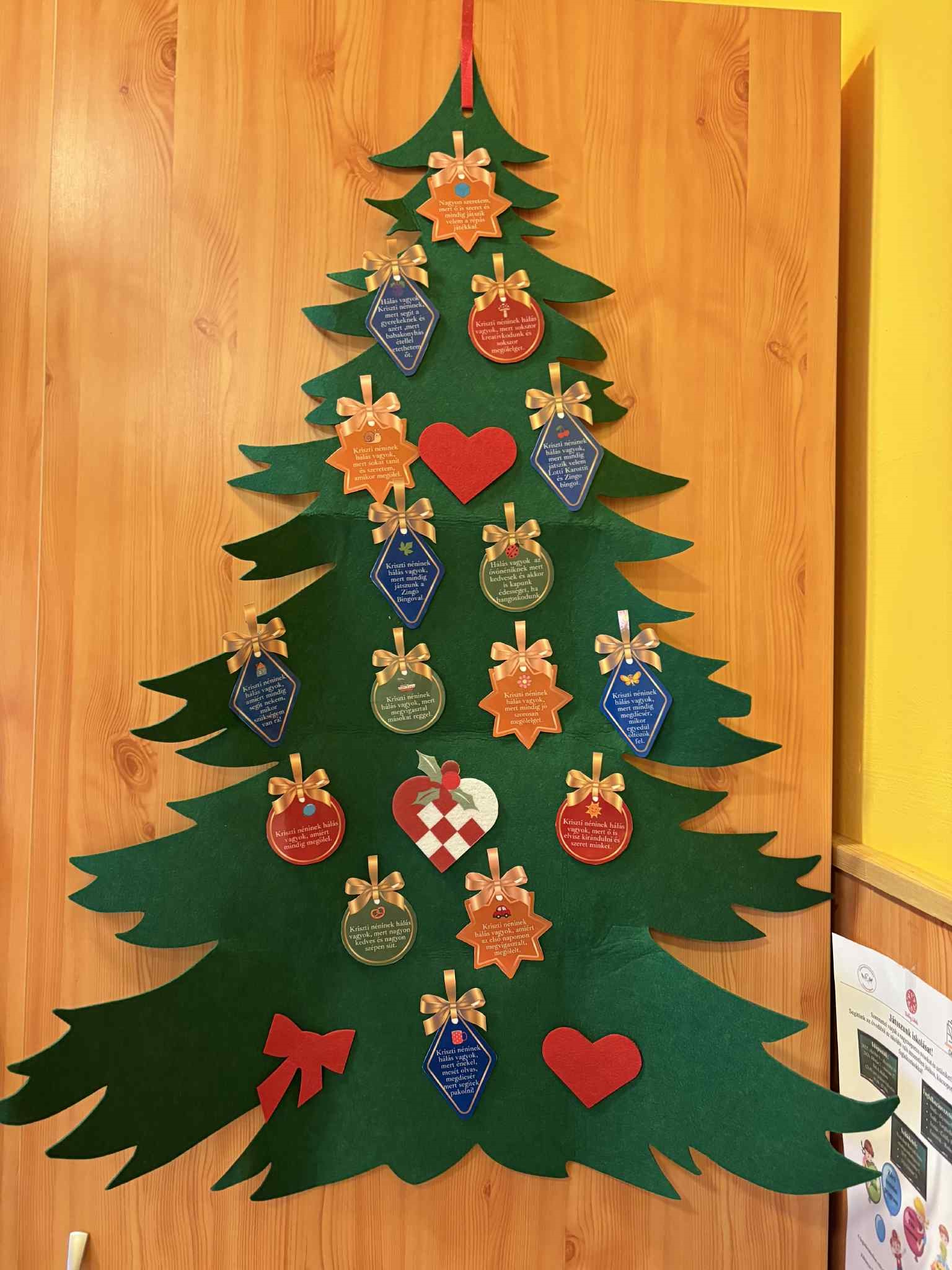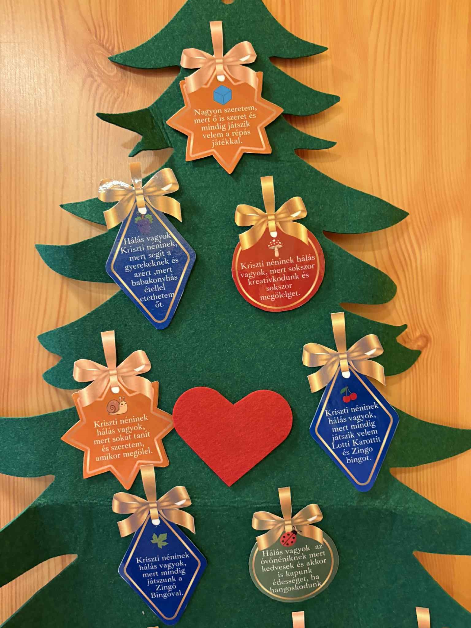 Ezeket a csodálatos hálafákat, most nem mi készítettük, hanem a csoportba járó gyerekek és szüleik leptek meg vele minket karácsonyra. A csoportban dolgozó minden felnőtt kapott egy személyre szabott karácsonyi hálafát, amin rajta vagy, hogy a gyerekek miért hálásak nekünk. Két éve járnak ide hozzánk a gyerekek, és a szülői értekezleteken is szoktunk Boldogság órás érzékenyítő játékokat, feladatokat játszani a szülőkkel. Idén ezzel köszönték meg a munkánkat, amiért mi nagyon hálásak vagyunk nekik. Örömmel tölt el, hogy a szülők is partnerek ezekben a nagyon fontos témákban, és otthon is beszélnek róla.