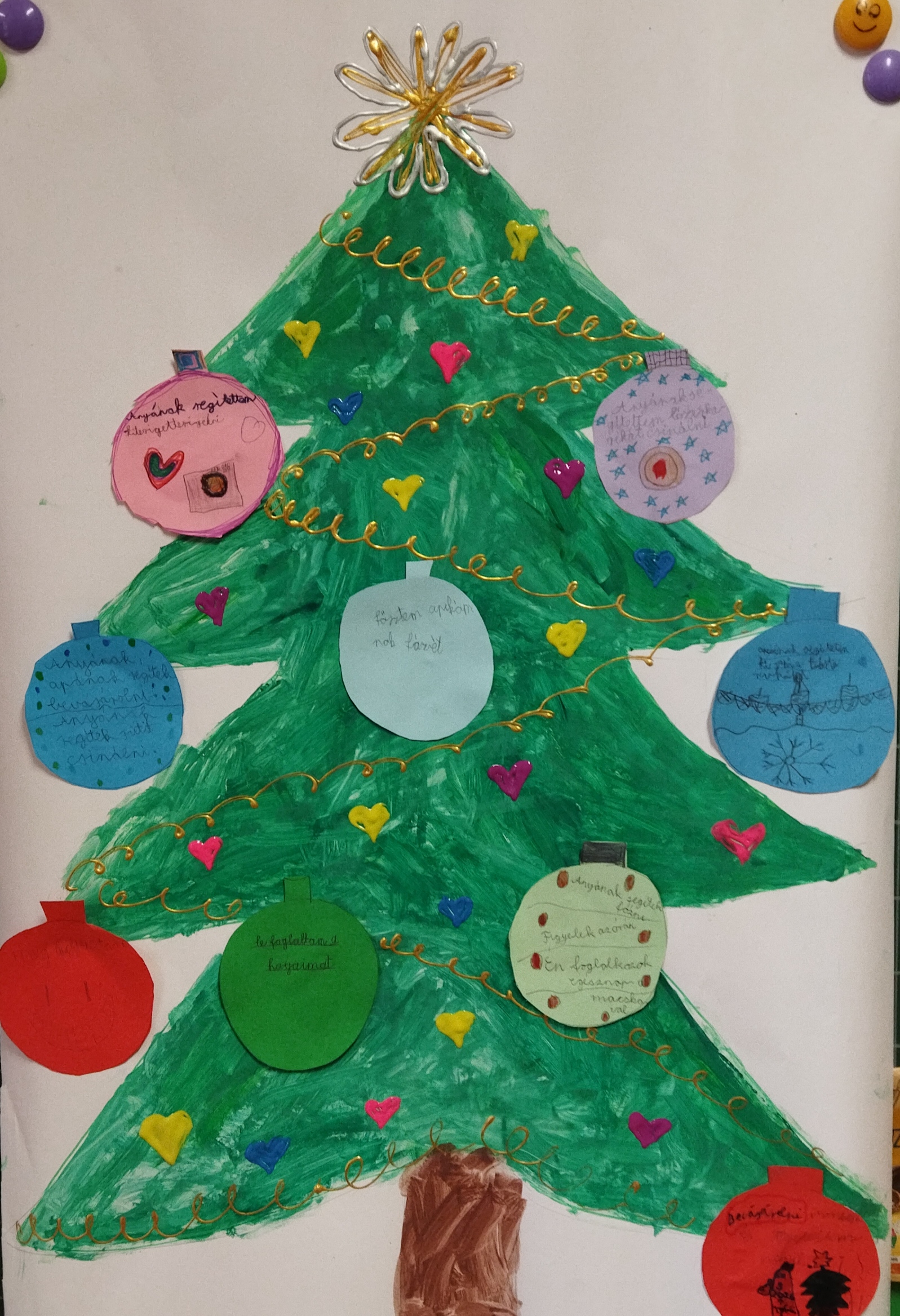 Decemberben mindennap hangolódtunk valamilyen formában a szeretet ünnepére. Sokat énekeltünk, ajándékokat készítettek a gyerekek szüleiknek, tanítóiknak, a testvérosztálynak, akikkel közös időt is töltöttünk barkácsolással, meséléssel. Saját készítésű karácsonyfánkat olyan gömbökkel díszítettük, melyre rákerültek azok a jó cselekedetek, melyeket a gyerekek megvalósítottak. 🙂