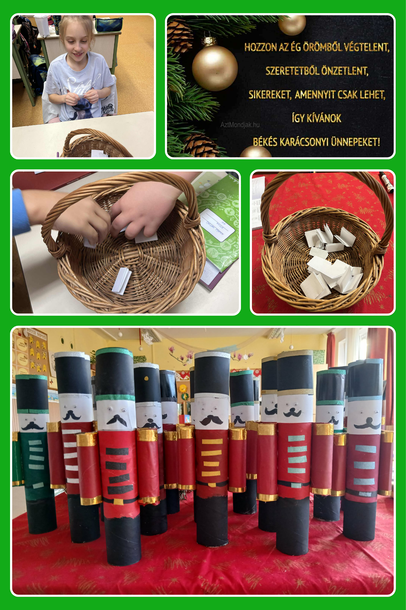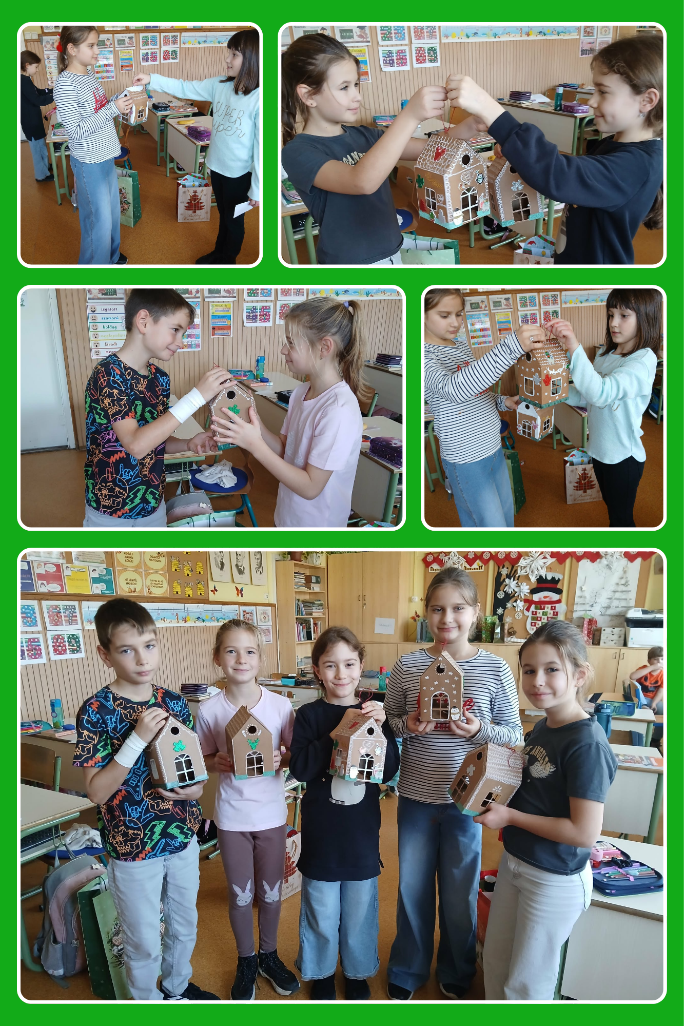 A decemberi hónap a jó cselekedetekről szólt osztályunkban és iskolánk szintjén is. A 3.n-ben minden diák igyekezett figyelmesebb lenni egymással, kedves üzeneteket, optimista mondatokat írtak egymásnak, és adták át egy-egy mézeskalácsház kíséretében. Szívesen játszották a „Meleg zuhany” játékot, ahol csak pozitív állításokkal fejleszthették társaik önbizalmát, tehették szebbé valakinek a napját. Iskolánk idén is csatlakozott jótékonysági akcióhoz, melynek célja a nehéz sorsú, hátrányos helyzetű gyerekek megsegítése volt. Karácsonyra a szeret-klézsi gyereknek gyűjtöttünk ruhadarabokat, tanfelszerelést, tisztálkodó szereket, játékokat és tartós élelmiszert. A cipősdobozokba üzeneteket írtak a gyerekek rászoruló kis társaiknak. A szeretet ünnepén a gyerekek kézzel készült ajándékokkal lepték meg családjukat.