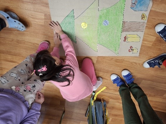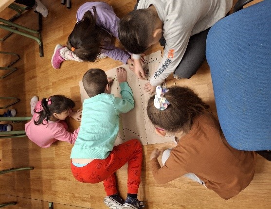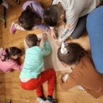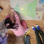 A gyerekekkel elkészítettük csomagolópapírra a közös karácsonyfánk tervét, melyet kiszínezhettek és ráragaszthatták a karácsonyi jó cselekedeteket tartalmazó díszeket.