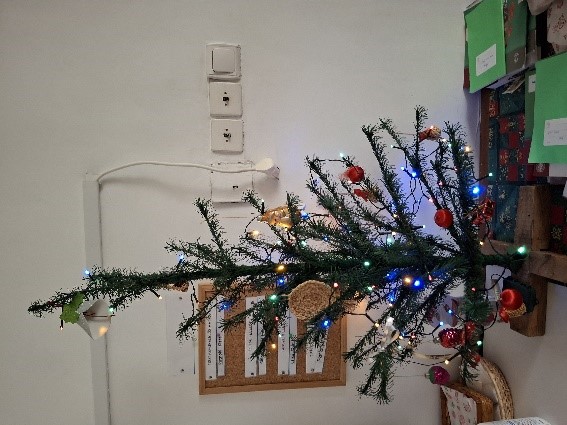 Ezek után nekiláttunk az igazi karácsonyfánk feldíszítéséhez. A díszek,égők közös felrakása után már ünnepi hangulatban mondtuk el óra végén a Szerénység és alázatosság erősségmondókát.