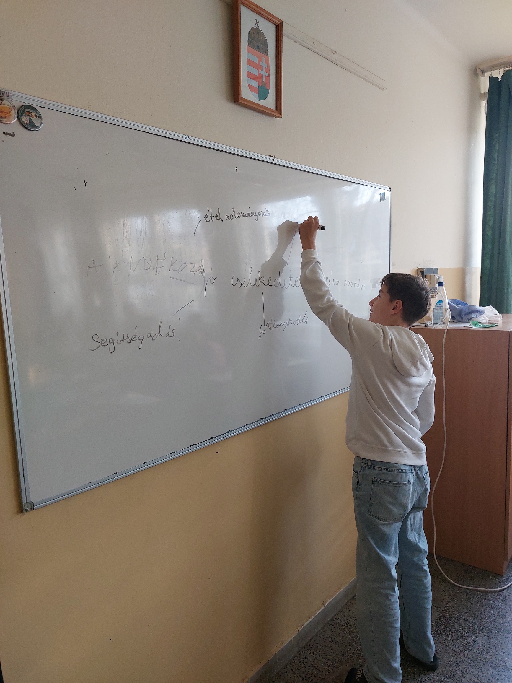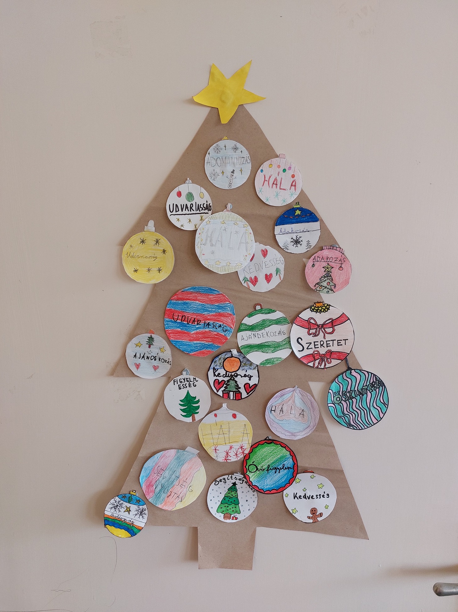 A december havi boldogságóránk témája a „Jó cselekedetek” volt. Az óra kezdetén a gyerekekkel együtt egy gondolattérképet készítettünk a táblára, amelyhez több diák is hozzáfűzte saját gondolatait. Főként az adományozás témáját emelték ki, ehhez érkezett a legtöbb gondolat, ötlet. Miután ezt a témát „körbejártuk”, megpróbáltuk a karácsony hangulatát is a foglalkozásunkba csempészni. Minden tanuló készített egy saját papír karácsonyfadíszt, amelyre egy-egy rövid gondolatot írtak fel a jó cselekedetek és a karácsony gondolatvilágából merítve. Az elkészült díszeket egy közös „karácsonyfára” akasztgattuk fel.